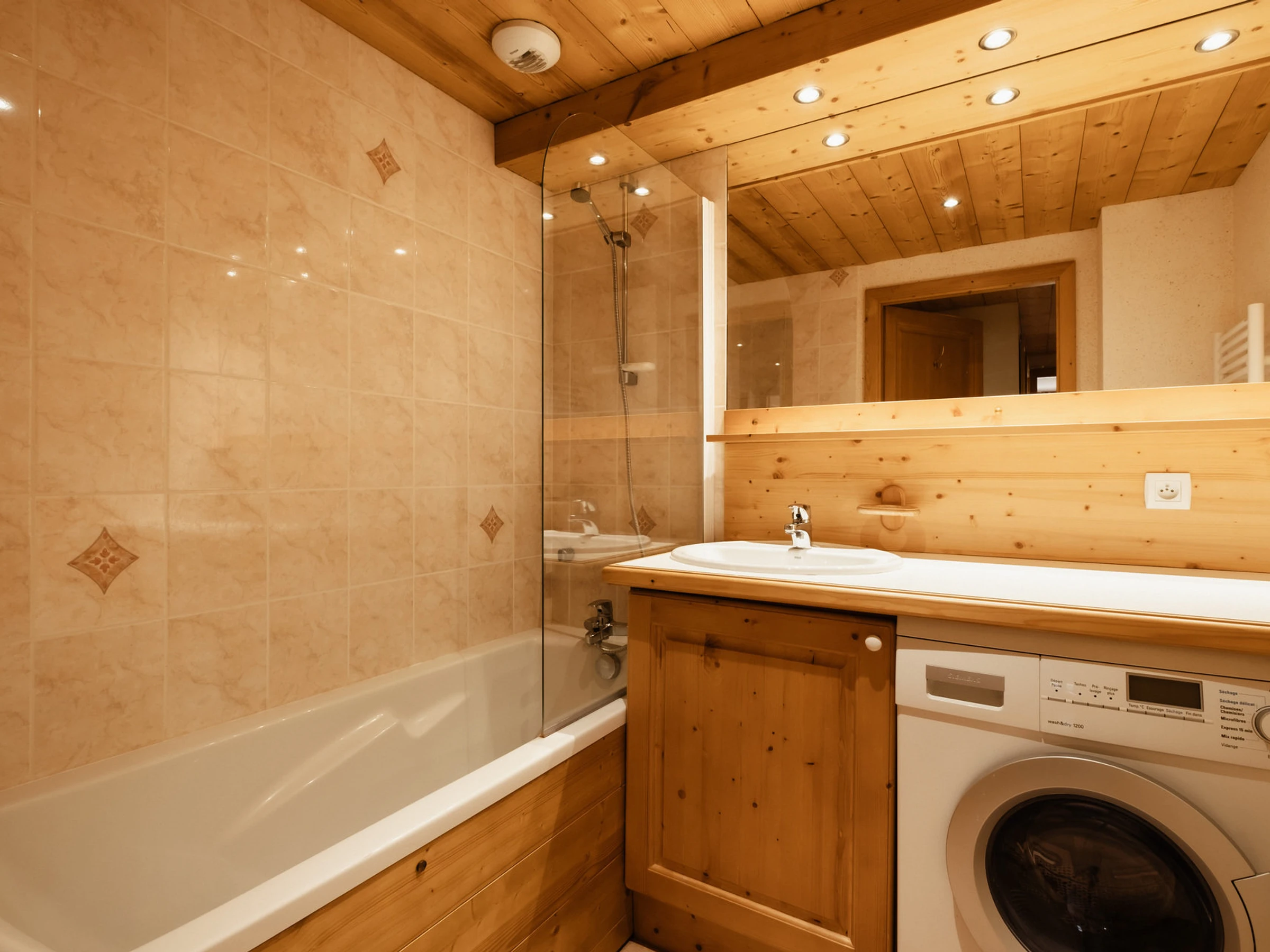 - SALLE DE BAINS (3.78 m²) : lavabo, baignoire, radiateur SECHE-SERVIETTES, LAVE-LINGE SECHANT