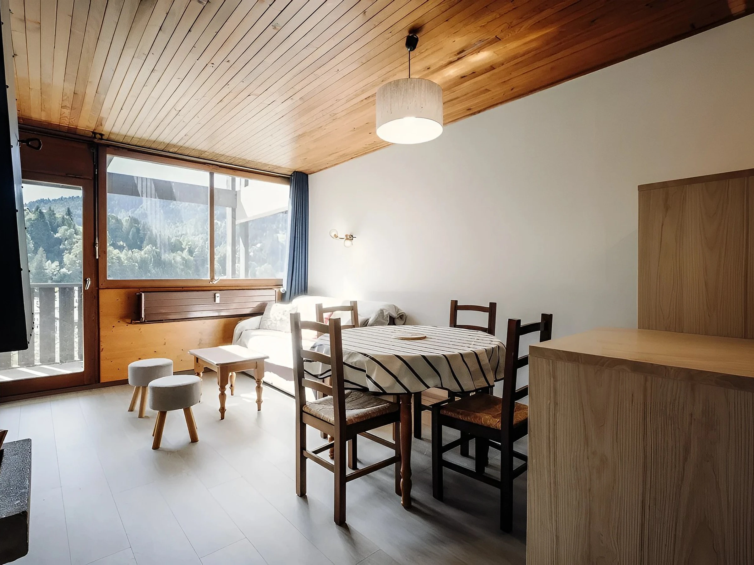 - SEJOUR (19.58 m²) : coin repas, cheminée décorative, TV écran plat, baies, porte-fenêtre sud, balcon sud ouest, vue résidences voisines / station / montagne