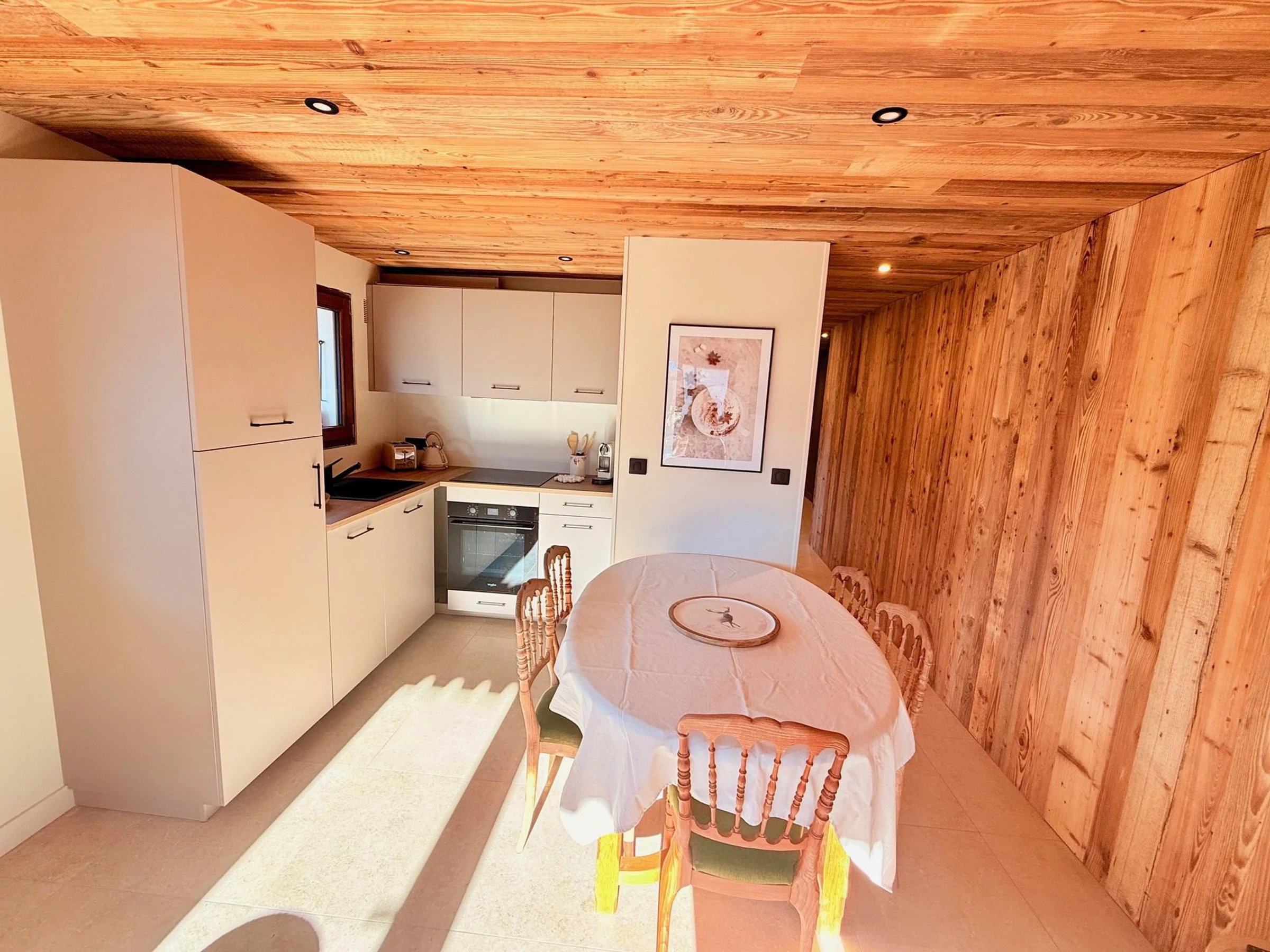 Entrée/Hall (9,28 m²) - Chambre 1 (9.28 m²) : 2 x2 lit superposés en 90cm, placards, fenêtre Est vue résidences - Chambre 2 (9.69 m²) : 1 lit 160 cm, placard - penderie, fenêtre Ouest vue montagnes- Salle de bain (3.82 m²) : baignoire, lavabo, miroir, radiateur sèche-serviettes et lave-linge - WC - Séjour (15.67 m²) : Coin repas avec table et chaises pour 6 - Coin salon avec canapé, assises, table basse, télévision, baie vitrée + porte-fenêtre accès terrasse sud et balcon Ouest, vue massif de l'Etale et Beauregard - Coin cuisine semi-ouverte (3.02 m²) : réfrigérateur avec partir freezer, évier, cuisinière Trio avec four, plaques de cuisson et lave-vaisselle, machine à café Nespresso, bouilloire, grille-pain, appareil à raclette, appareil à fondue.