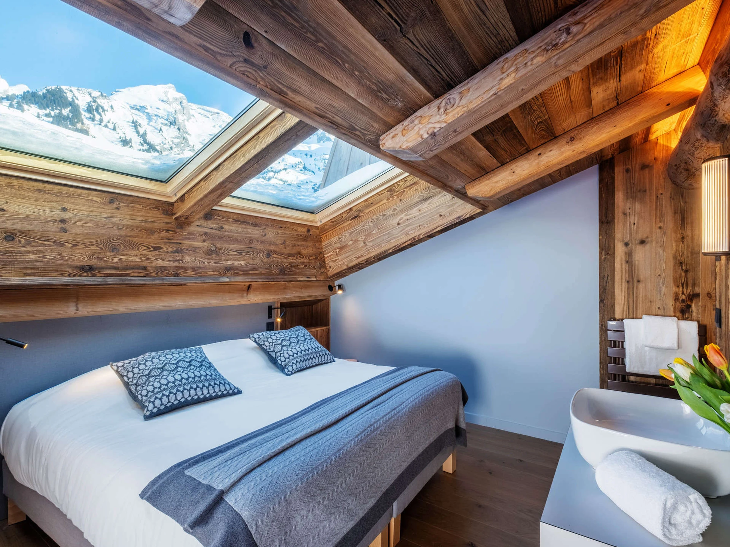 La première, dispose d’une salle de bains attenante avec baignoire, douche et WC, ainsi que d’un balcon plein sud. La seconde comprend une salle d’eau ouverte avec douche et donne sur l’arrière du chalet, illuminée par une fenêtre de toit offrant une vue sur le ciel étoilé. Un WC indépendant complète l’ensemble.