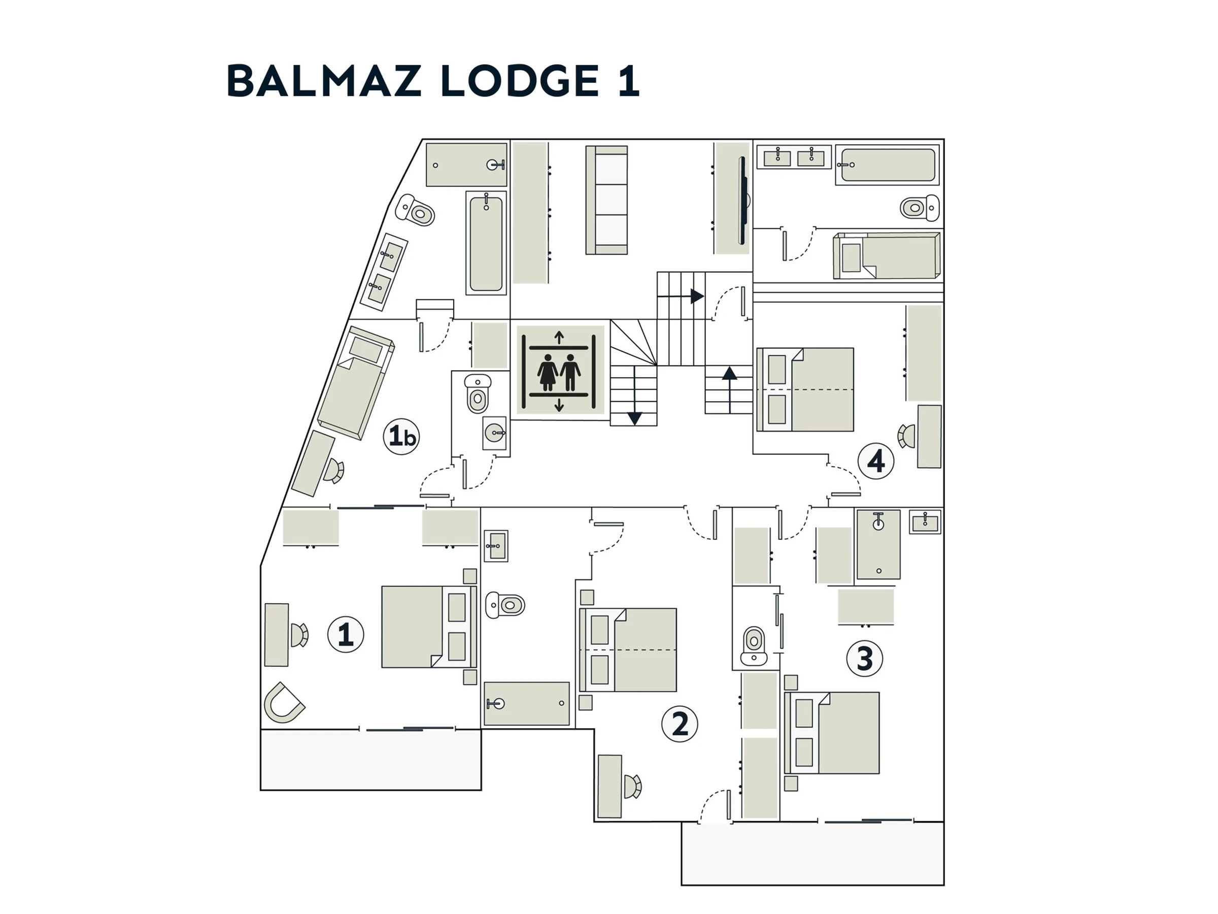 Un ascenseur mène à une enfilade de chambres. La première, de type familiale et orientée à l’arrière du chalet, comprend un lit double (160 cm) et un lit superposé (90 cm), avec salle de bains attenante équipée d’une baignoire et d’un WC. Une chambre double (lit 180 cm) dispose de sa propre salle d’eau ouverte avec douche et WC, tout comme la chambre PMR, aménagée avec un lit double (180 cm) et une salle d’eau adaptée (douche et WC). Enfin, la seconde chambre familiale propose un lit double (180 cm) et un lit superposé (90 cm), avec salle de bains attenante incluant baignoire, douche et WC. Trois chambres profitent d’un accès direct à la terrasse inférieure du chalet, offrant un espace extérieur intime et paisible.