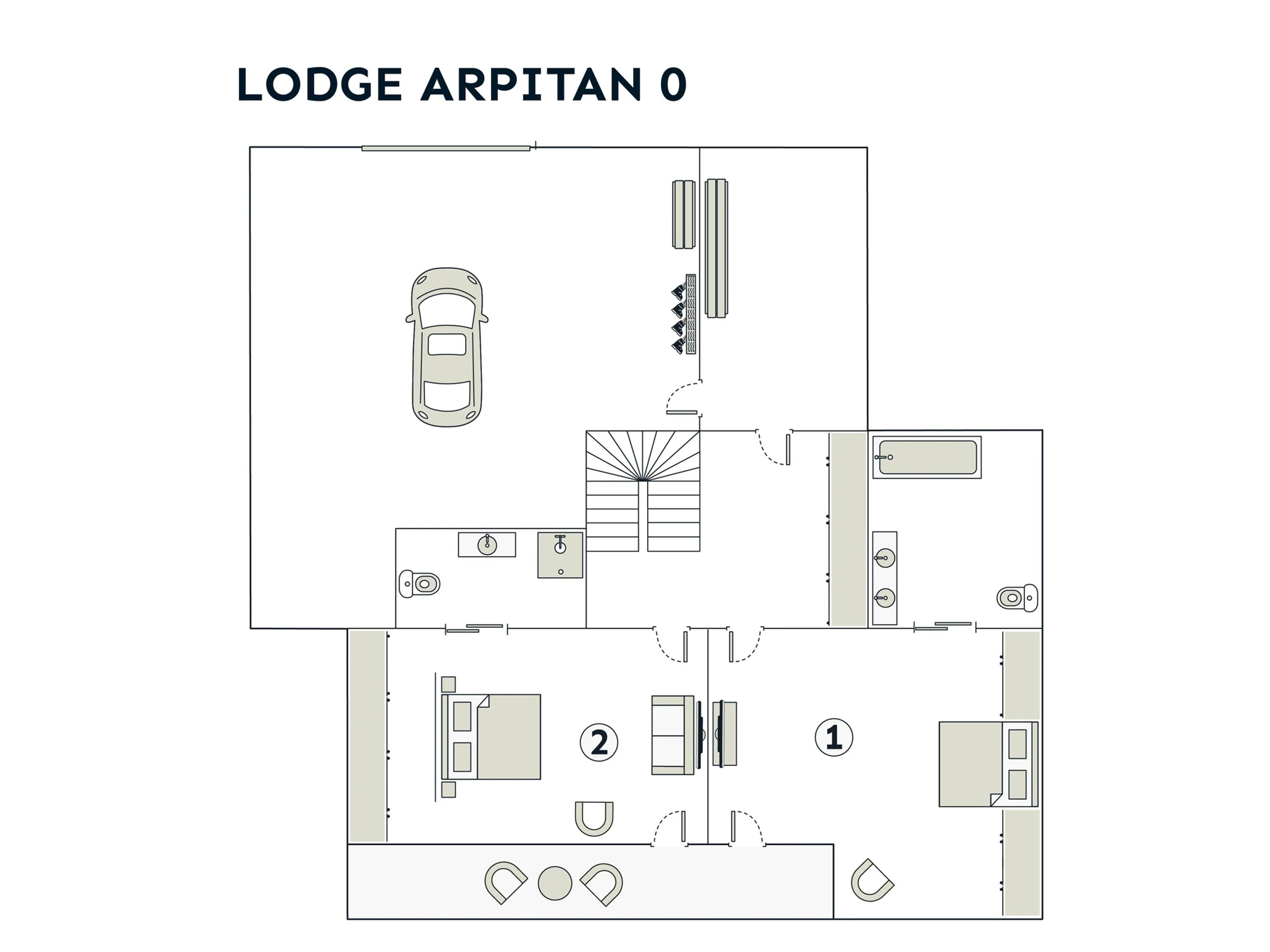 Ce niveau accueille trois chambres, deux chambres doubles (lits 160 cm) s’ouvrant sur la vaste terrasse sud disposent chacune d’une salle d’eau attenante avec douche et WC. Une troisième chambre propose deux lits simples (90 cm) et sa propre salle d’eau avec douche et WC. Un salon TV complète ce niveau, parfait pour les enfants ou les soirées détente.