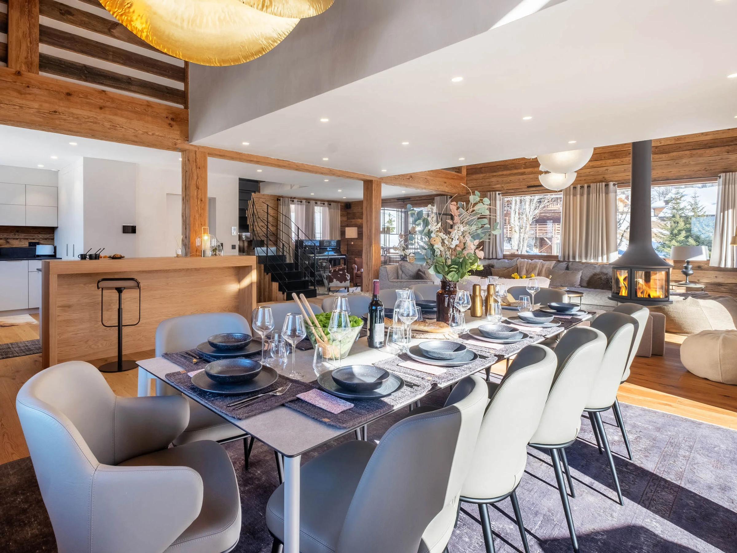 Deuxième étage - Espace de vie et cuisine : - Cuisine entièrement équipée : plaques à induction, four, micro-ondes, réfrigérateur, congélateur, Nespresso & cafetière filtre, bouilloire, grille-pain, lave-vaisselle, appareils à raclette et fondue