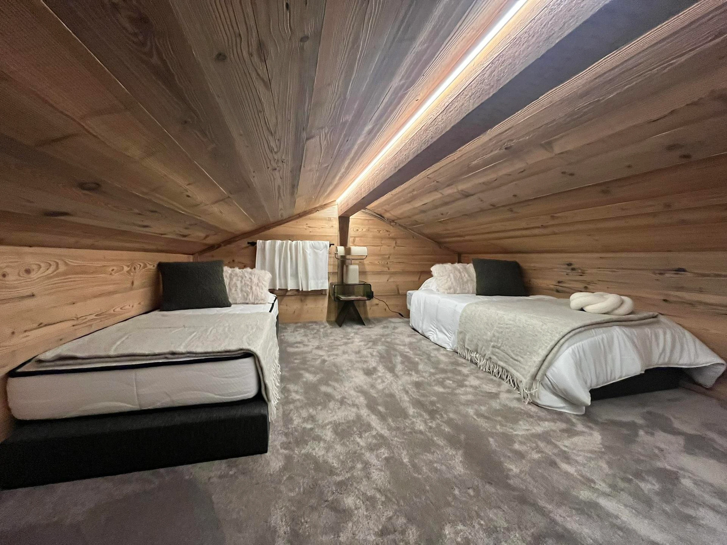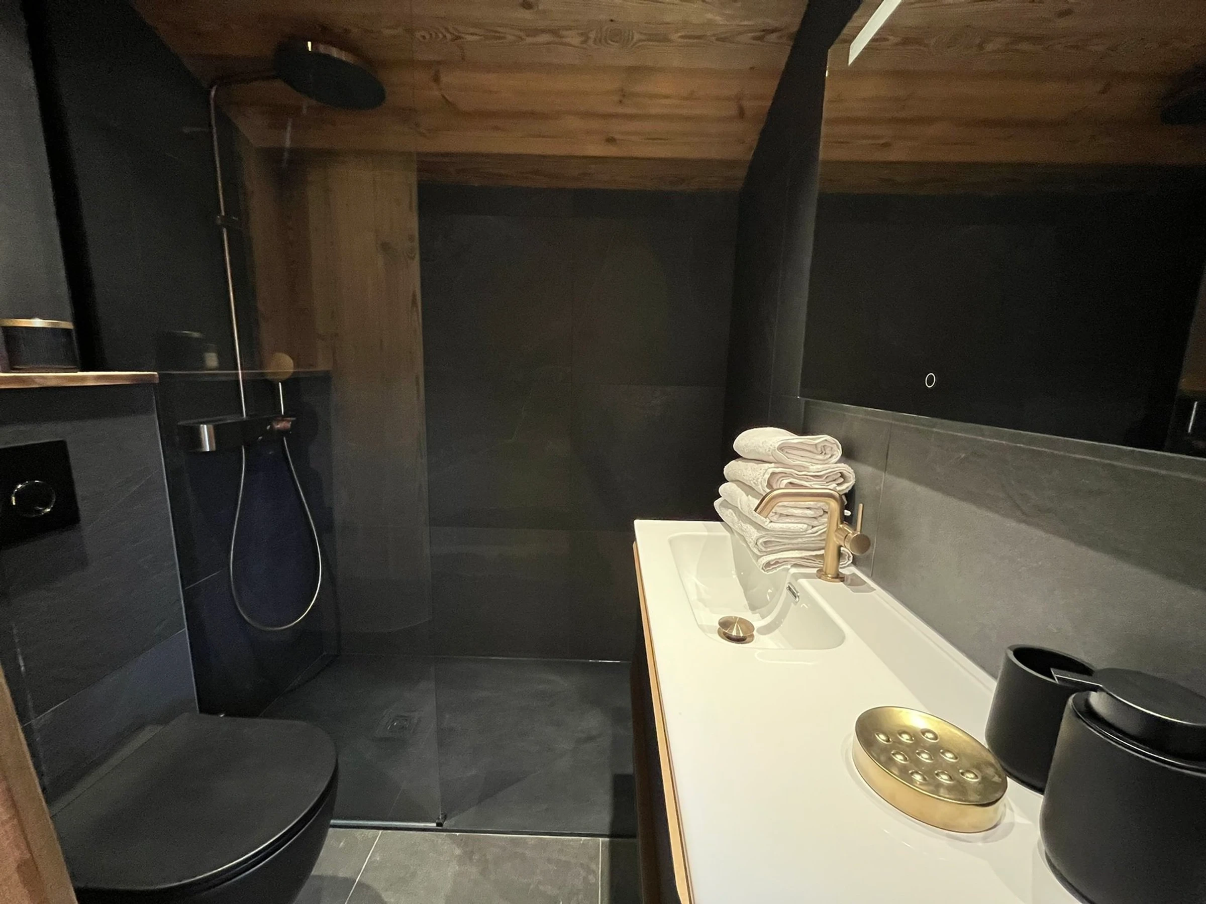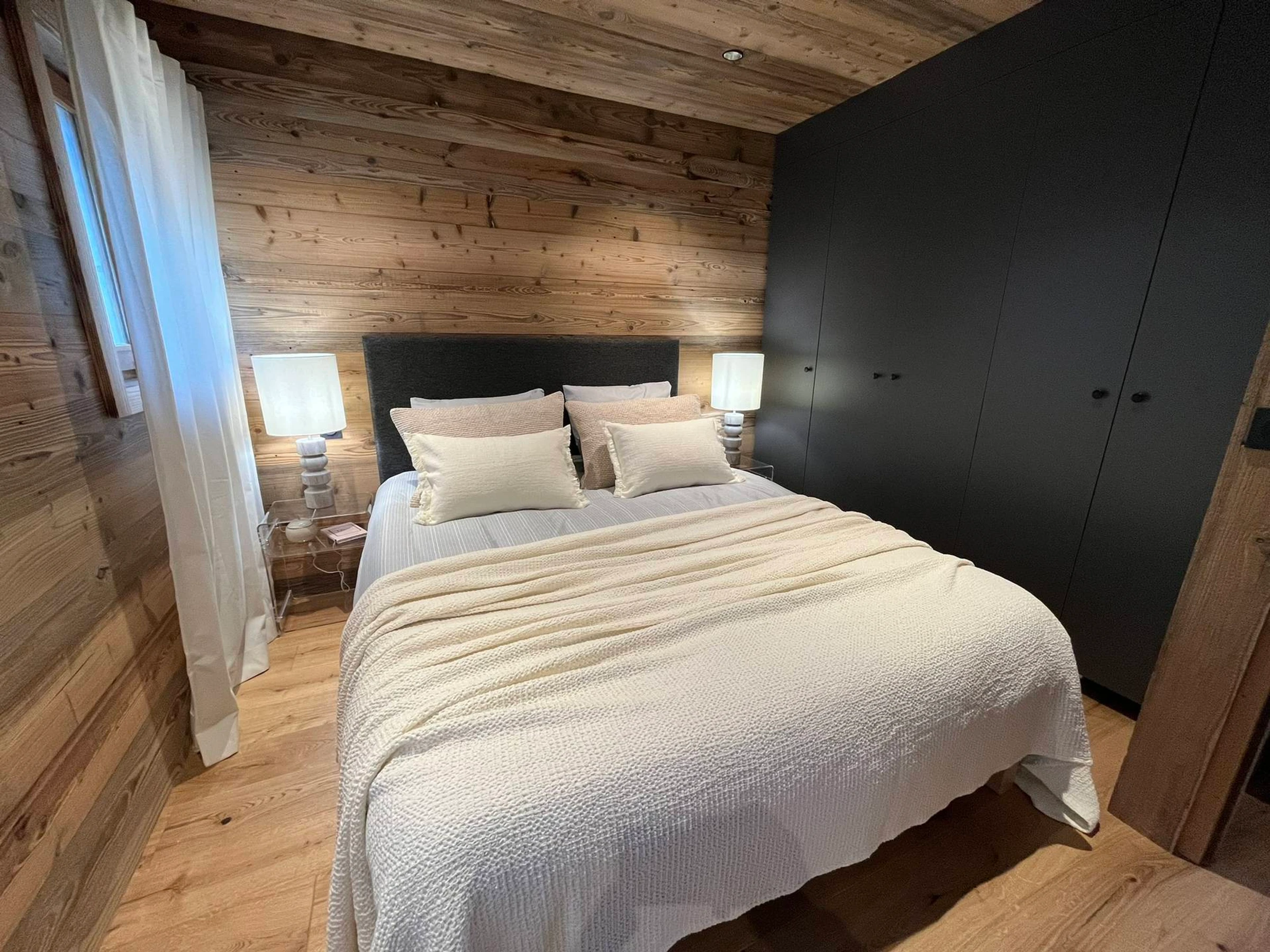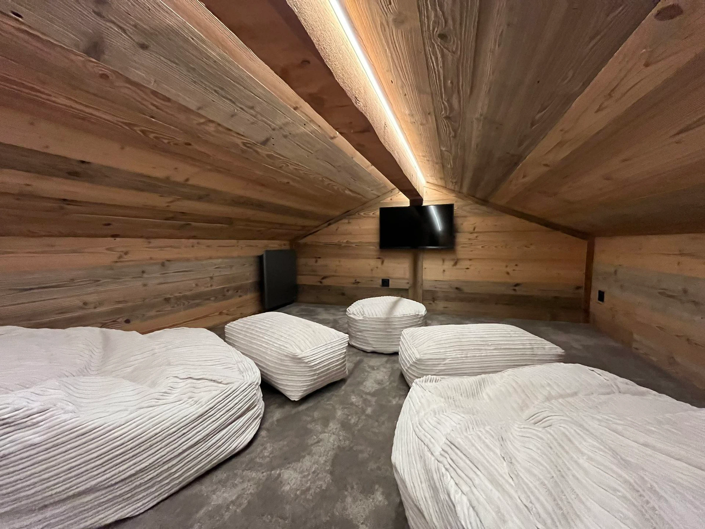 Entrée sur séjour : Canapé + 3 fauteuils grande TV, porte fenêtre donnant sur balcon sud - Chambre 1 : 1 lit double avec placards/penderie de rangement, TV, fenêtre au nord vue montagne - Chambre 2 : 2 lits simple avec placards et penderie, TV, fenêtre sud vue piste et village - Cuisine - Coin repas : table et chaises - Cuisine équipée ouverte sur séjour, avec porte-fenêtre, accès balcon: évier, plaques à induction 3 feux, hotte, réfrigérateur avec congélateur (180L), lave-vaisselle, machine à laver, placards, appareil à raclette, Nespresso, grille-pain, bouilloire - Salle d'eau : Douche, lavabo, miroir, sèche-serviettes électrique, rangements WC suspendu - Chambre 3 : 1 lit double, placards, penderie, TV fenêtre orienté nord, salle d'eau avec douche, wc suspendu et lavabo - A l'étage : Mezzanine avec 2 lits simple et un salle de jeux avec TV.