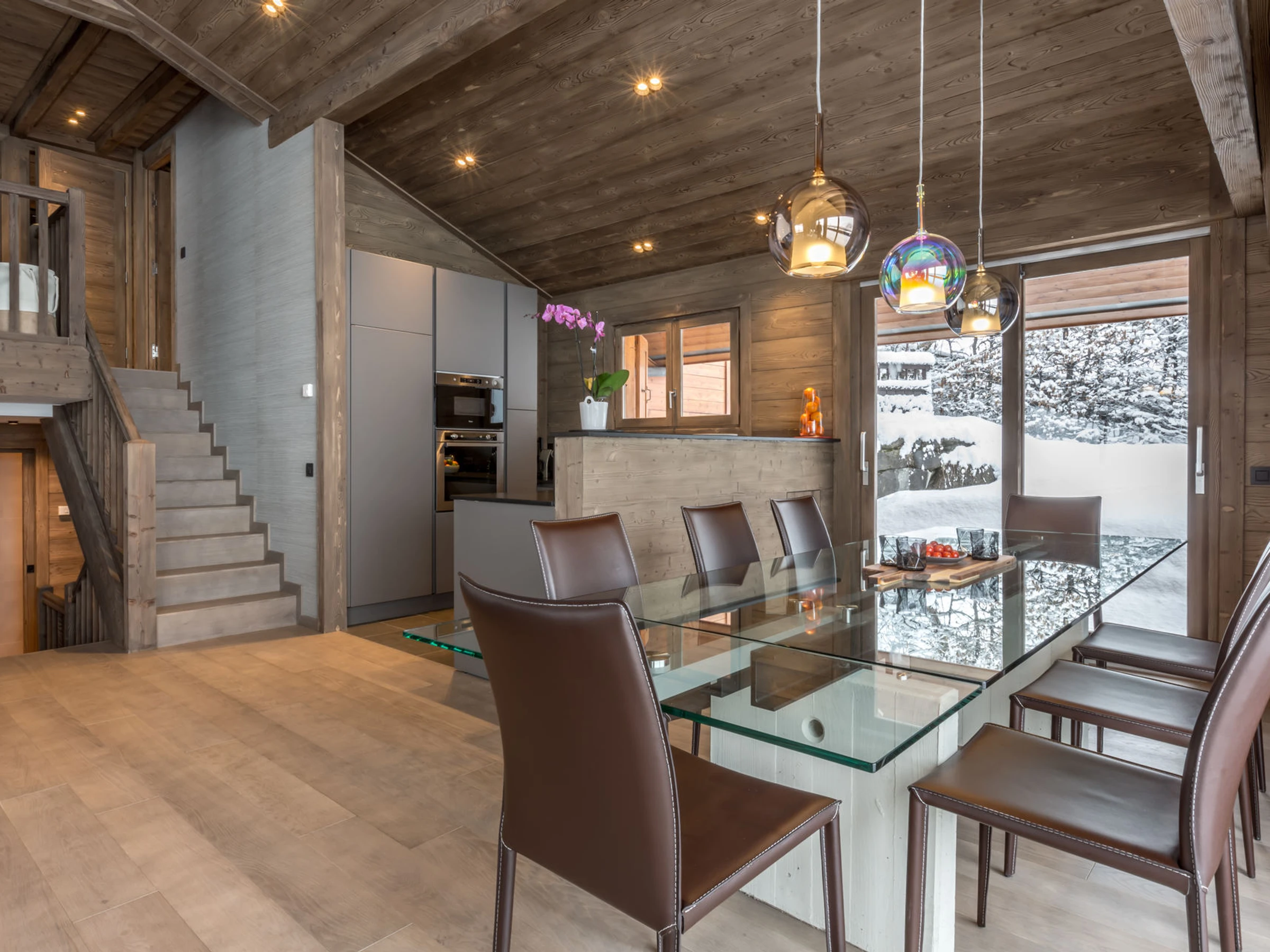 Au niveau principal : La cuisine ouverte, est agrémentée d’une élégante table en verre et de larges baies laissant entrer la lumière. Le séjour spacieux, mêlant salle à manger et salon autour d’une cheminée, s’ouvre généreusement sur l’extérieur, offrant une vue sur le panorama de l’intérieur comme de l’extérieur.