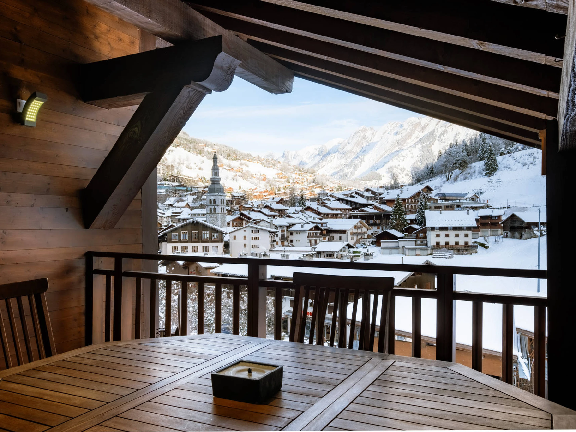 - SEJOUR (26.78 m² dont 7.46 m² mansardés) : coin repas et coin salon, TV écran plat, vélux, porte-fenêtre, terrasse mansardée couverte, vélux, est, vue station / montagne