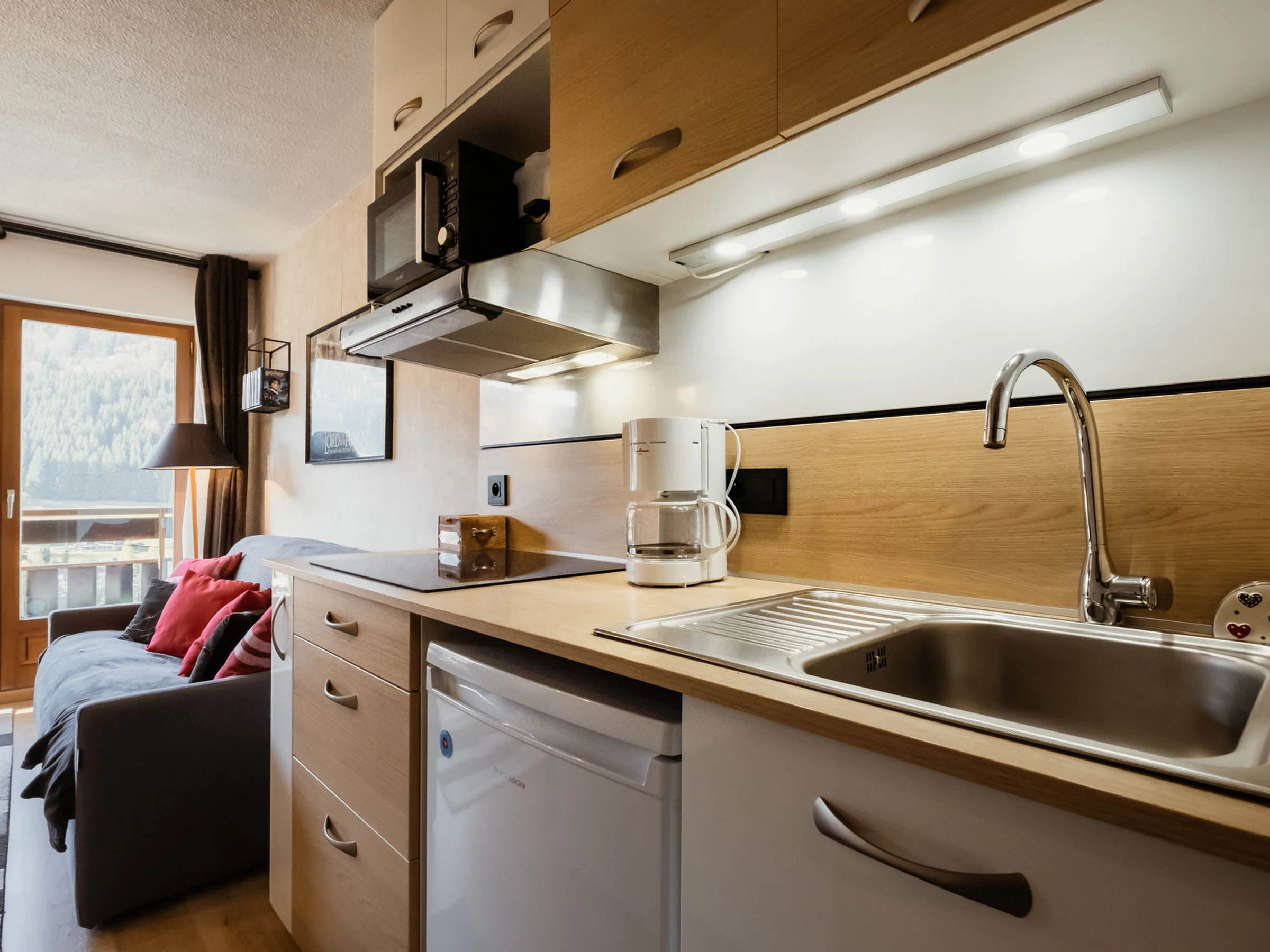 - KITCHENETTE (4.61 m²) : réfrigérateur (120 L), TABLE VITROCERAMIQUE, FOUR COMBINE MICRO-ONDES