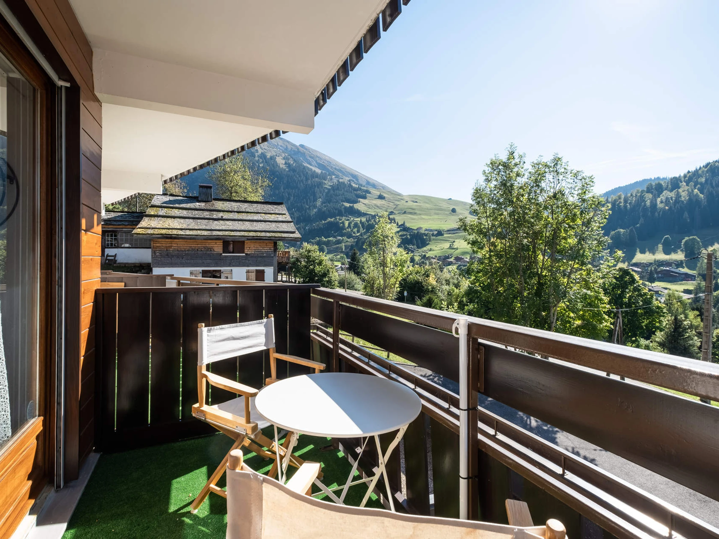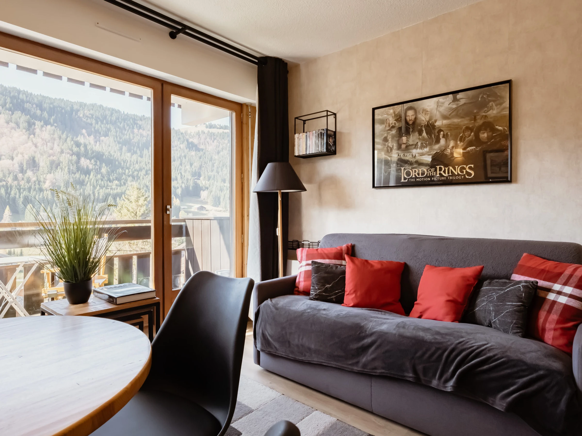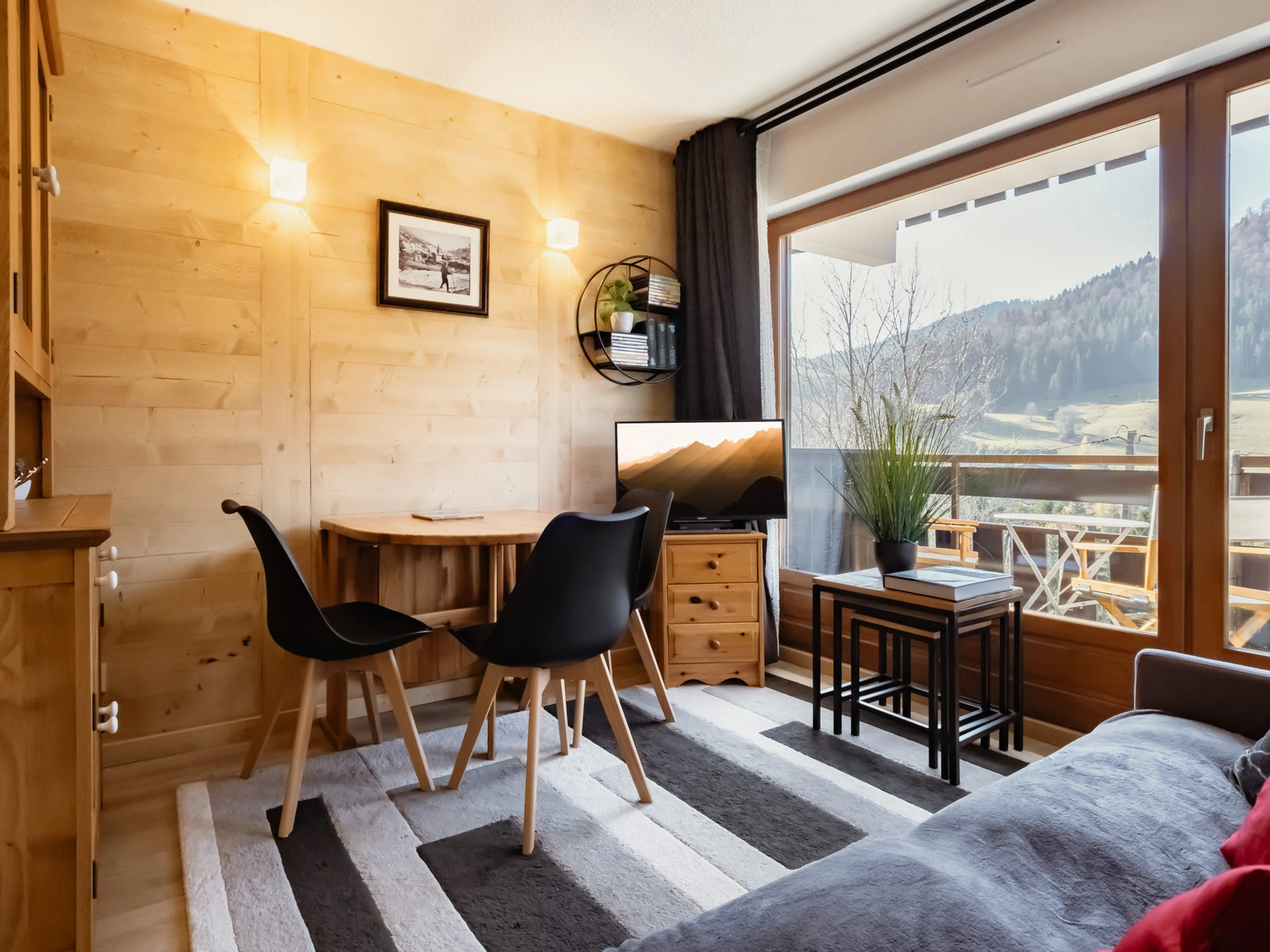 - SEJOUR (9.24 m²) : coin repas, 1 CANAPE LIT-RAPIDO (140), TV écran plat, baie fixe + porte fenêtre, accès balcon ouest, vue route du Col des Aravis, résidences voisines, montagnes