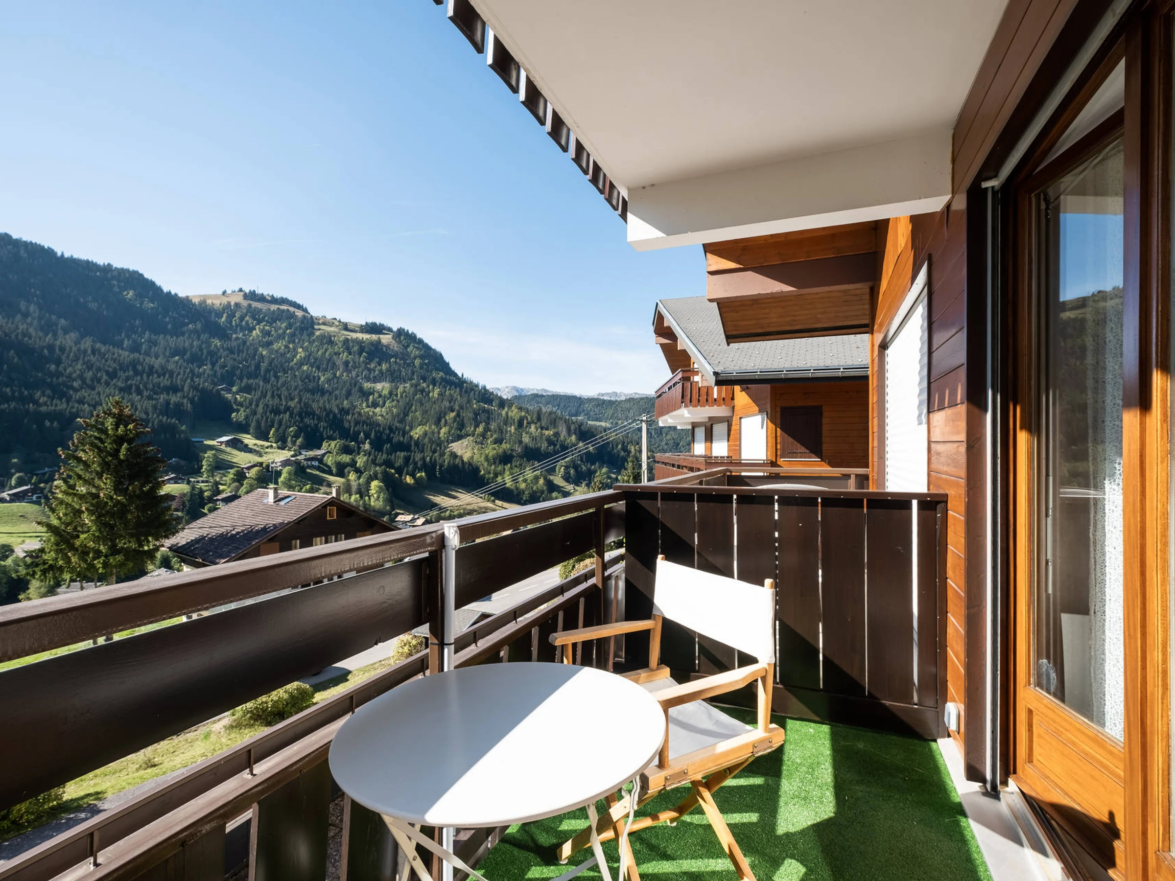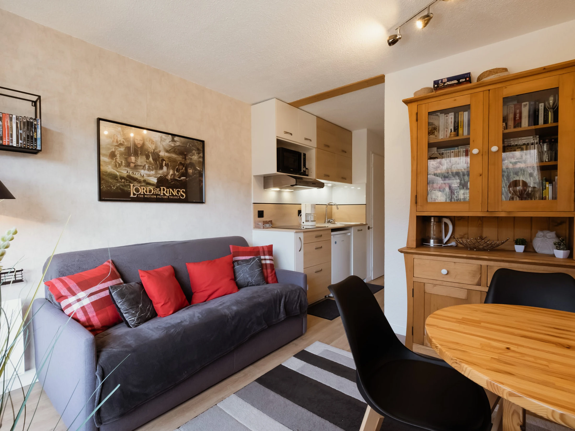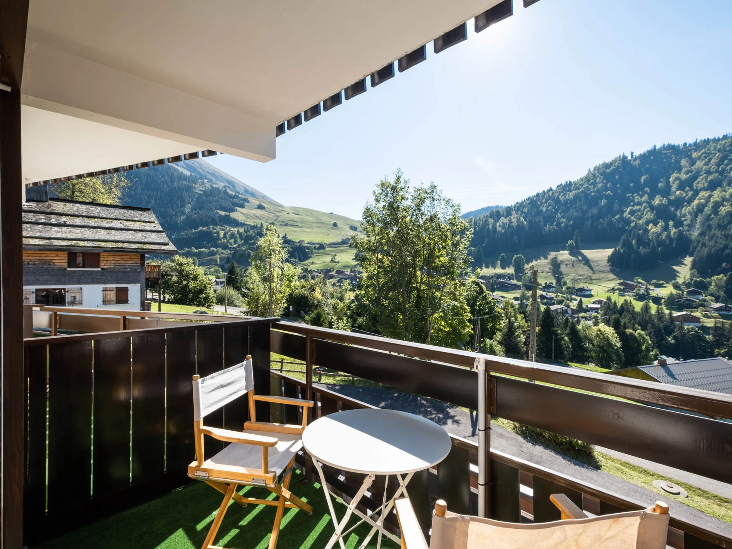 - SEJOUR (9.24 m²) : coin repas, 1 CANAPE LIT-RAPIDO (140), TV écran plat, baie fixe + porte fenêtre, accès balcon ouest, vue route du Col des Aravis, résidences voisines, montagnes