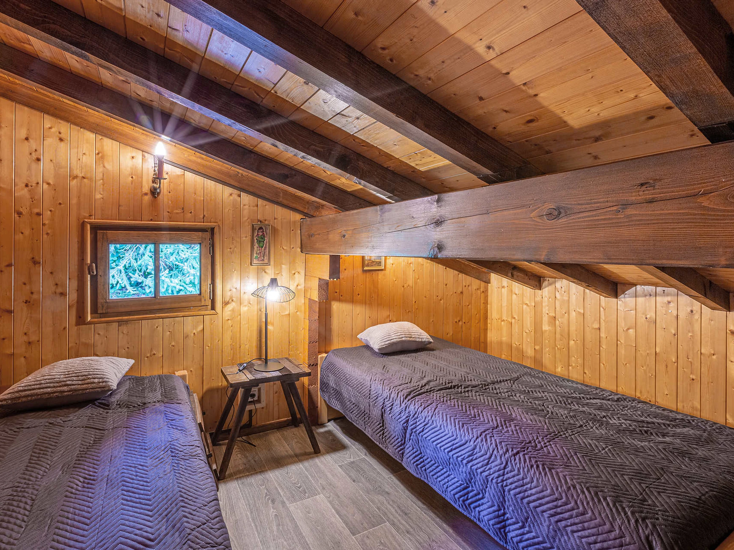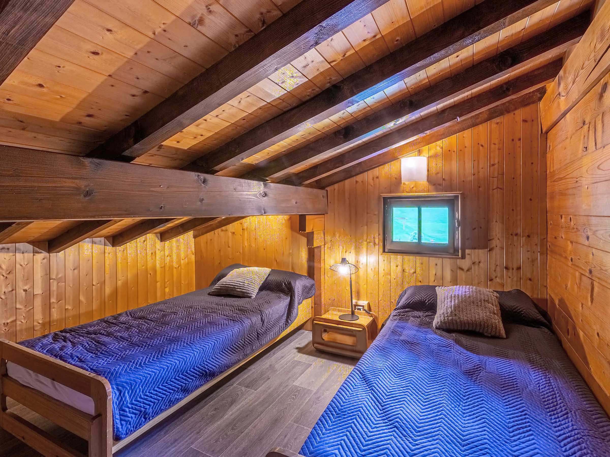 - COIN MONTAGNE (11.12 m² dont 9.30m² mansardés) : 1 LIT 1 PLACE (90) + 1 lit enfant, petite fenêtre sud, vue résidences voisines / montagne