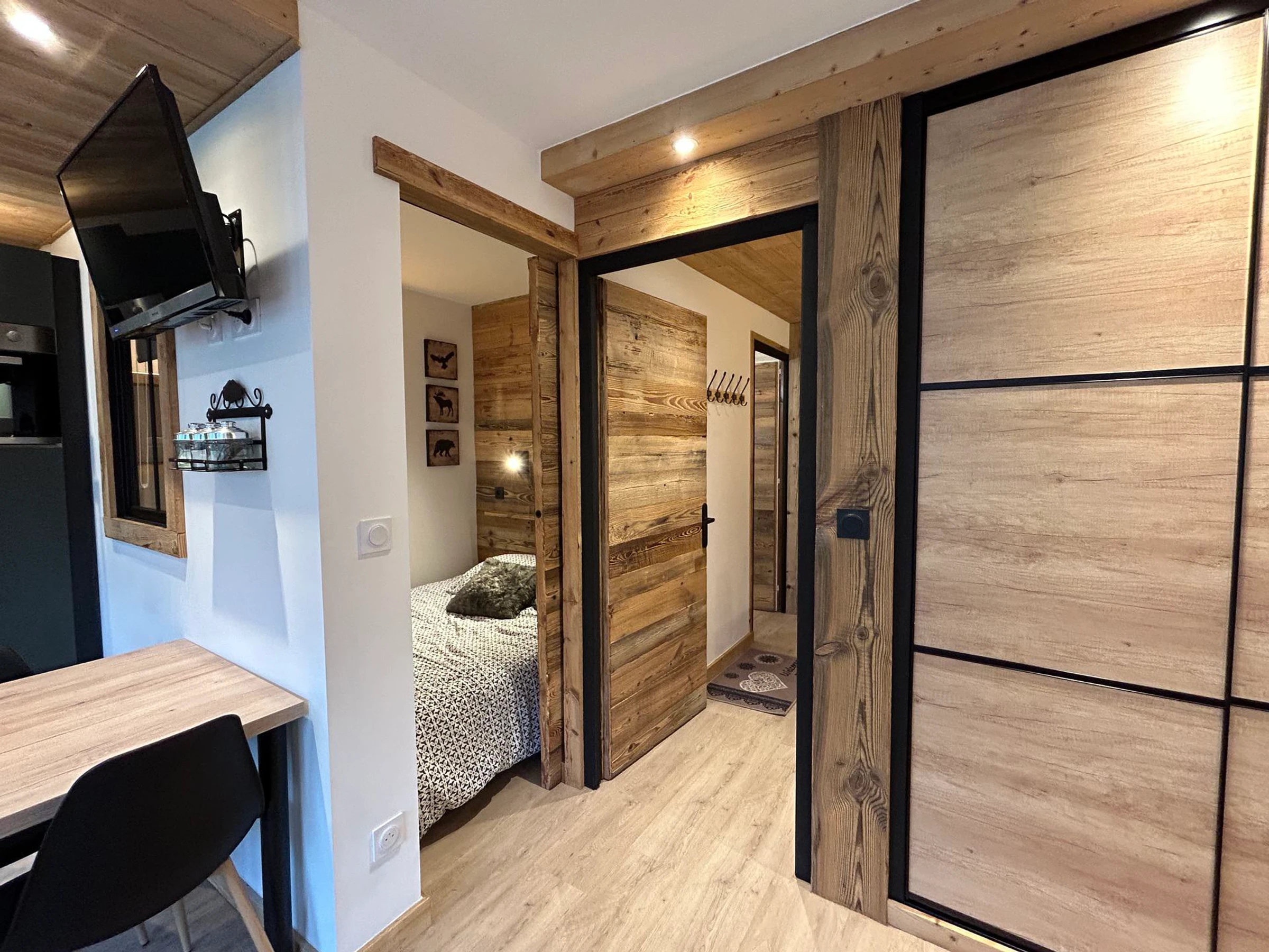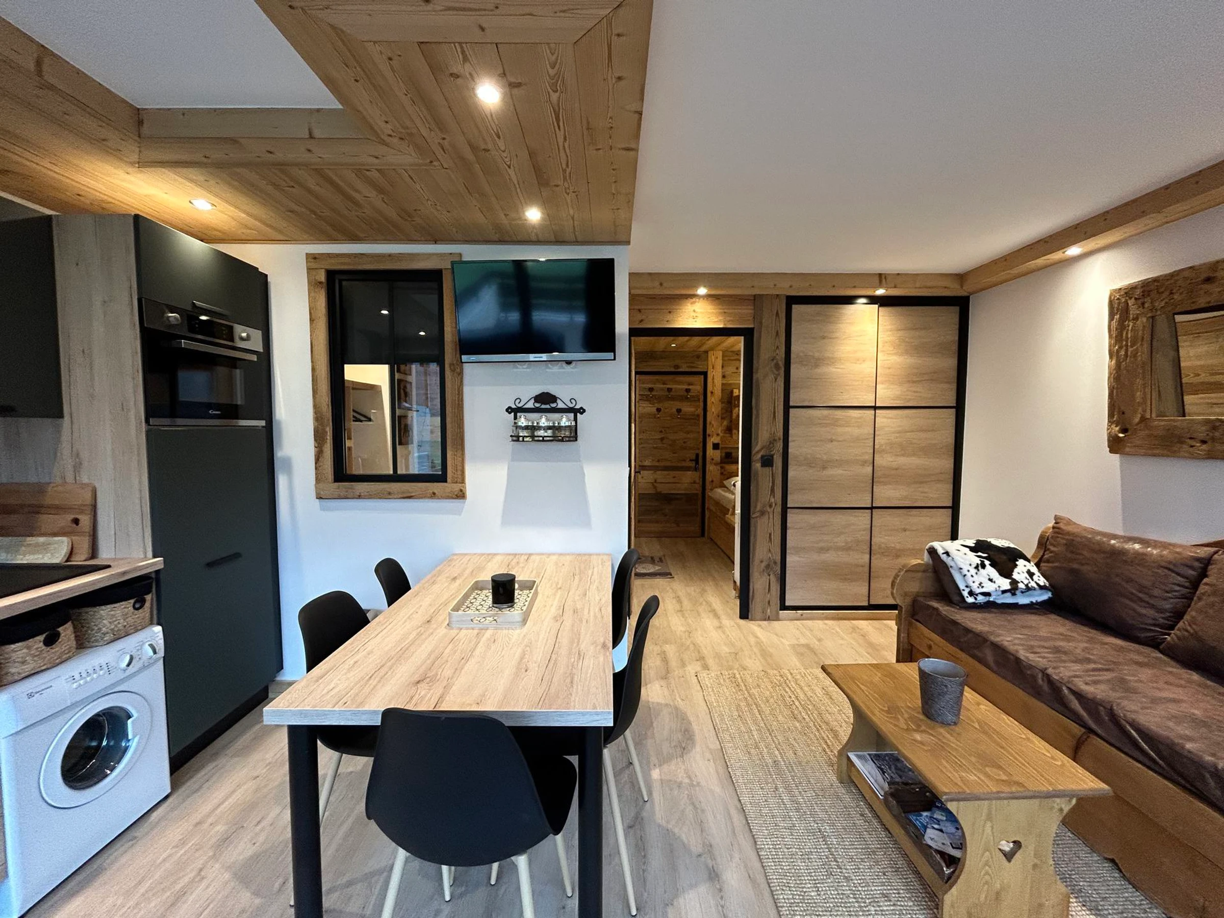 - Cuisine ouverte : 3 plaques inductions, hotte, Combiné four et micro-onde, Lave-vaisselle, frigo, cafetière NESPRESSO, Lave linge, porte fenêtre SUD sur Terrasse & chaine des Aravis