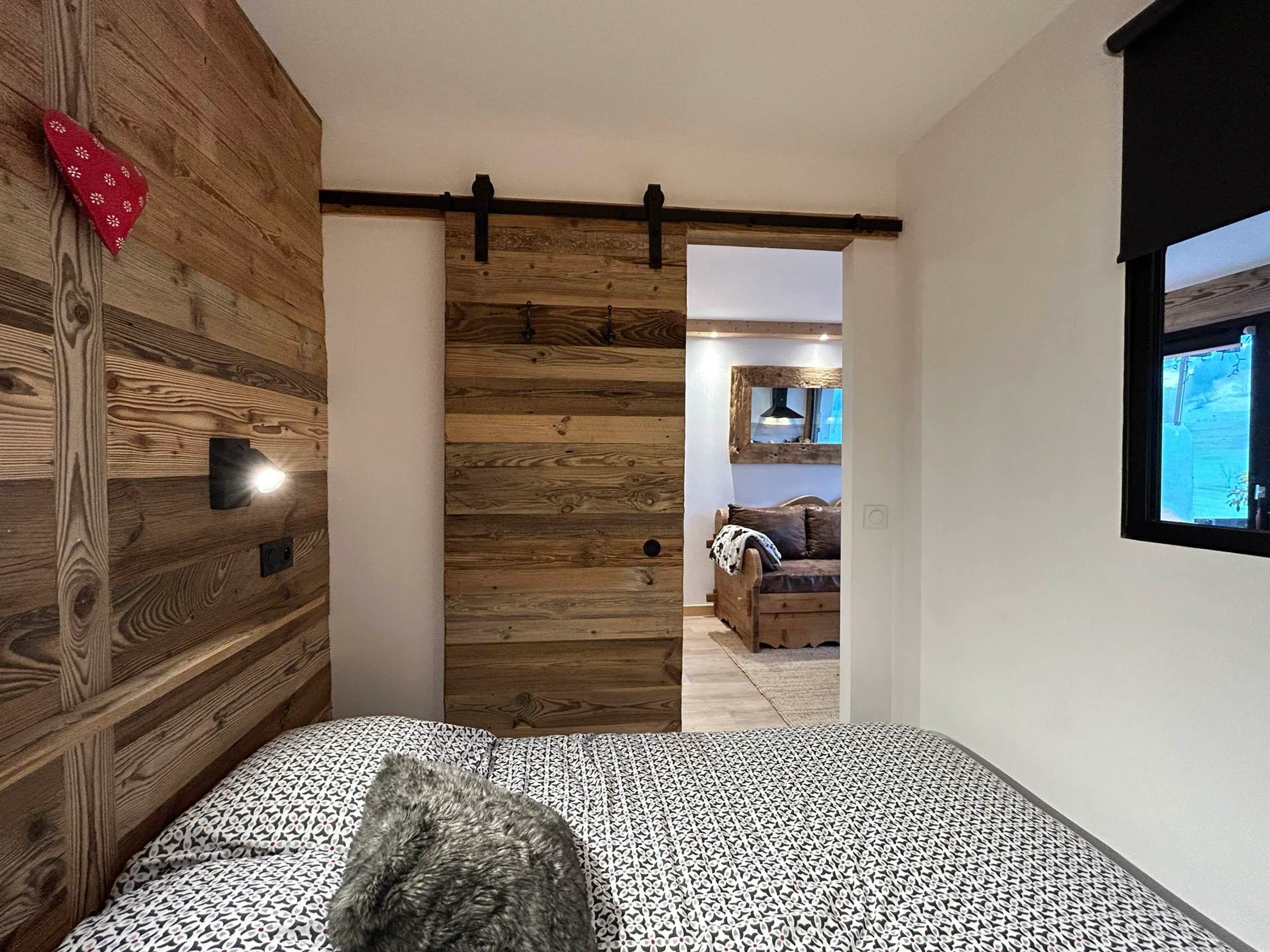 - Salon : Canapé convertible gigogne (80), TV, baie vitrée donnant sur Terrasse SUD vue Chaine des Aravis