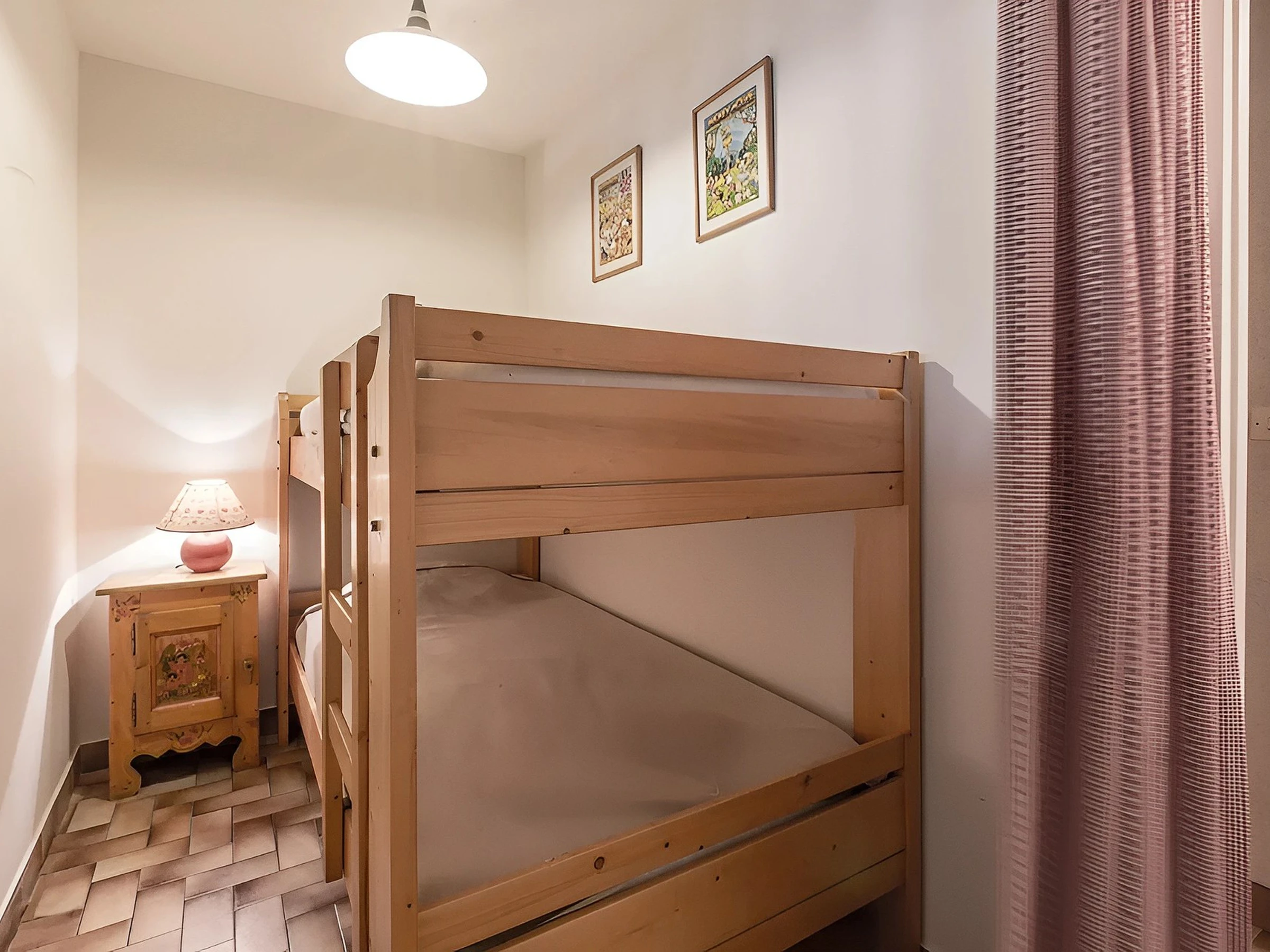 L’entrée, située au 3ème étage, mène vers un coin nuit indépendant doté de deux lits superposés (90 cm) éclairée par une fenêtre tournée vers l’arrière de la résidence, auquel s’ajoutent un WC indépendant et une salle de bains équipée d’une baignoire. La pièce de vie, conviviale réunit un salon avec canapé convertible (130 cm) et un espace repas avec une cheminée décorative. La cuisine ouverte accompagne naturellement le séjour. La baie vitrée donne accès au balcon orienté sud-ouest, offrant un aperçu sur la station et les montagnes.