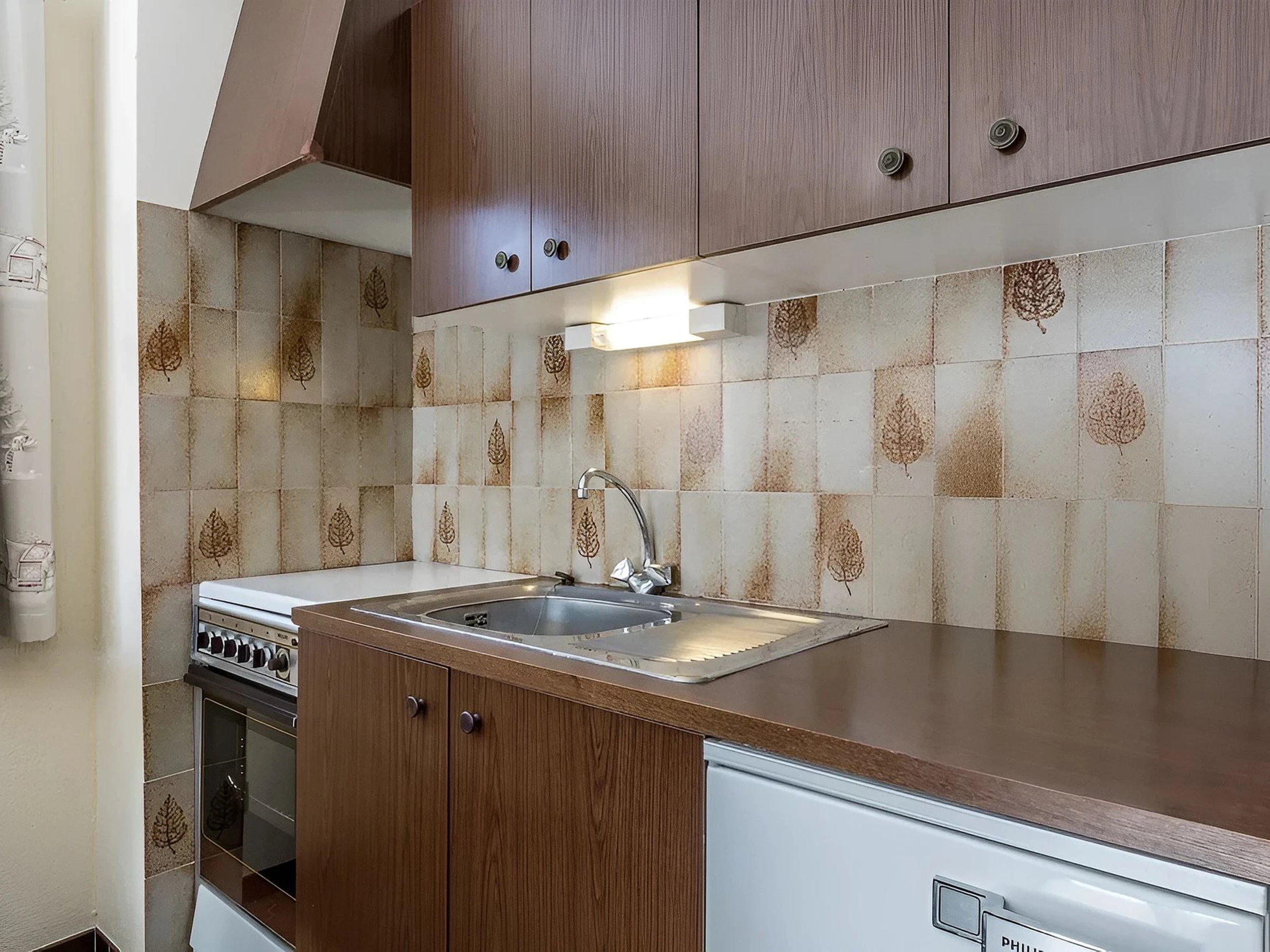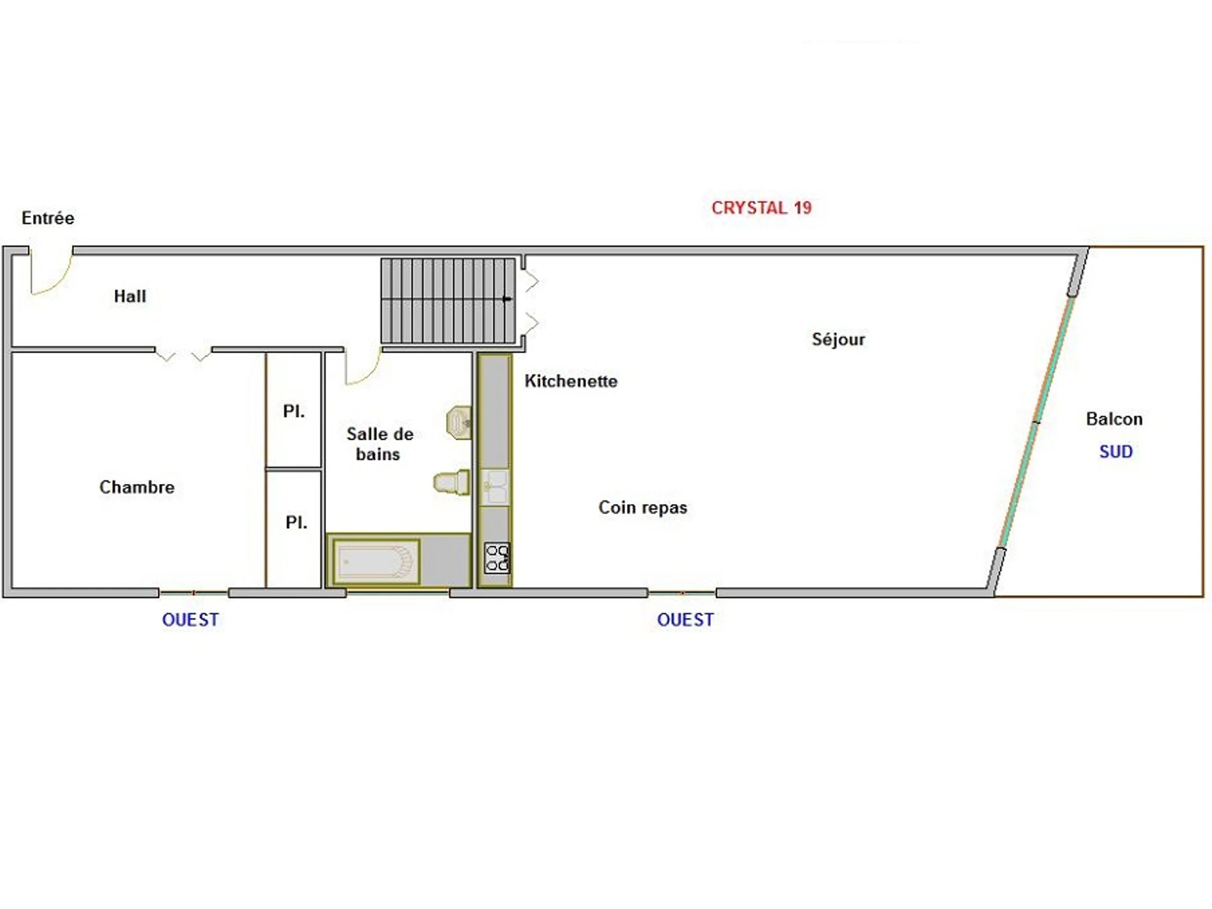 - KITCHENETTE (1.33 m²) : réfrigérateur (140 L), four, plaques électriques, fenêtre ouest, vue sur chalet voisin / montagne
