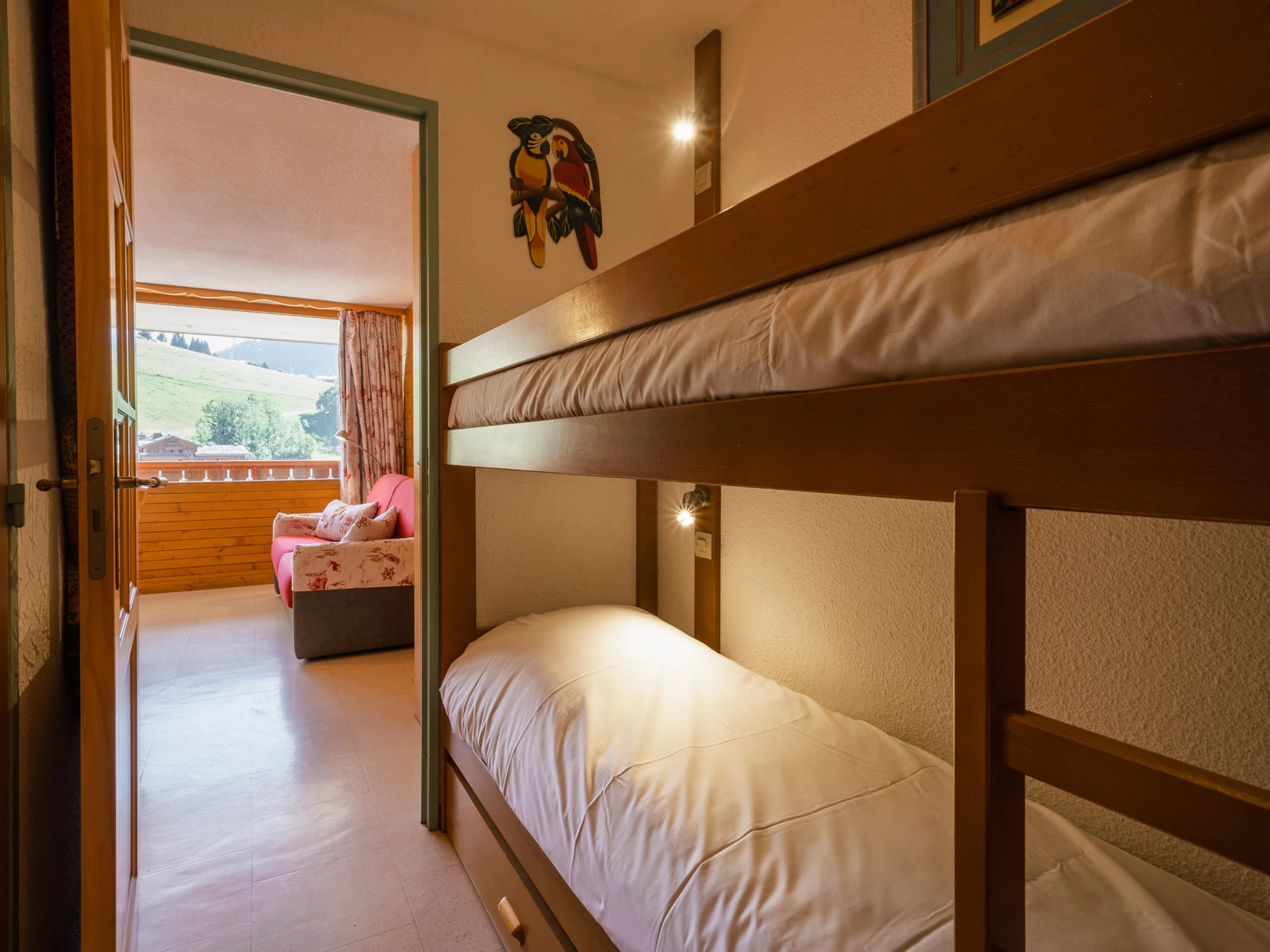 L’entrée, située au 3ème étage, intègre une chambre composée de deux lits superposés (70 cm). Le séjour illuminé par son exposition sud, accueille un coin repas et un canapé-lit (140 cm), formant un espace convivial. La cuisine ouverte, intégrée à la pièce de vie, accompagne naturellement les moments du quotidien. Une porte-fenêtre donne accès au balcon plein sud. La chambre indépendante dispose d’un lit double (160 cm) accompagnée d’une ouverture donnant sur l’arrière de la résidence.