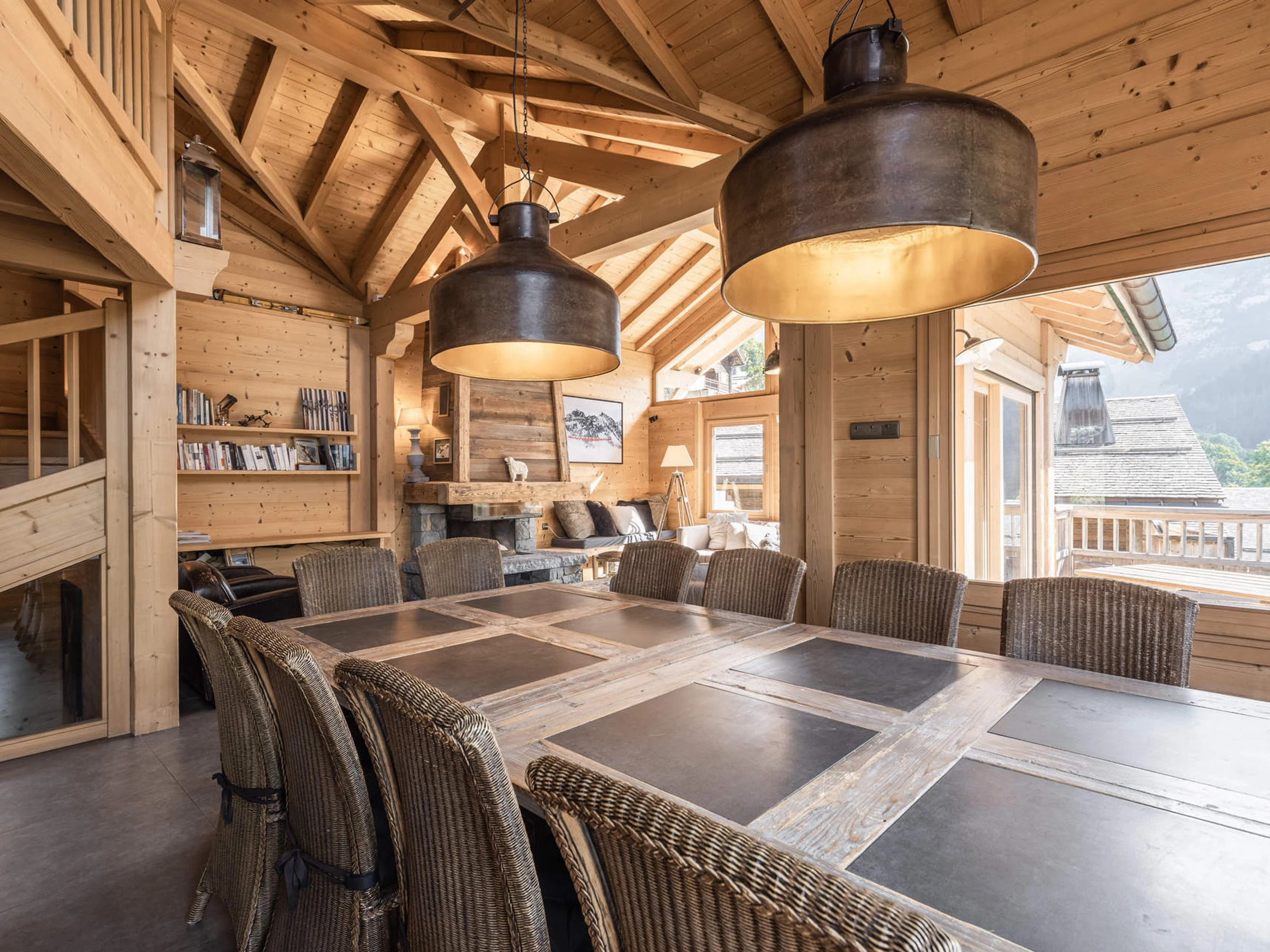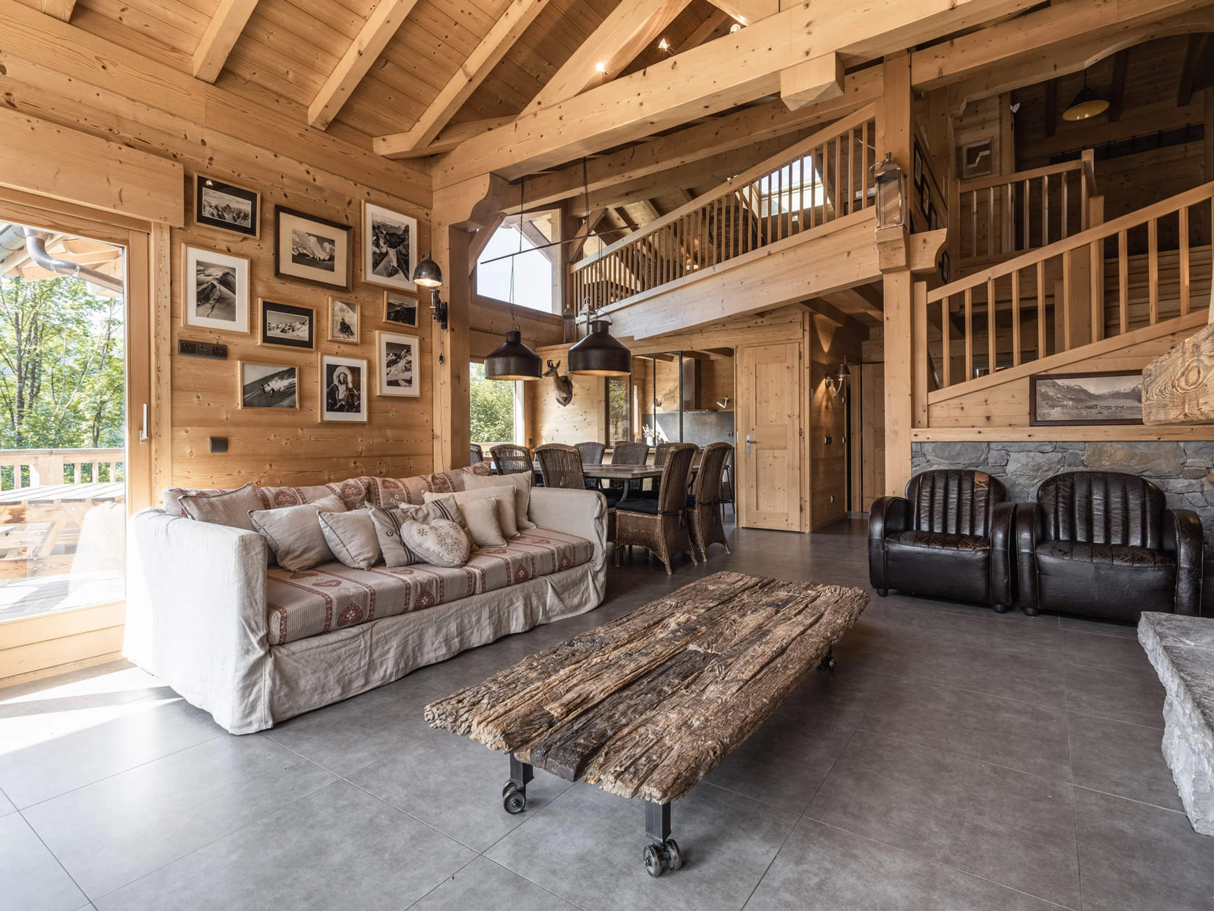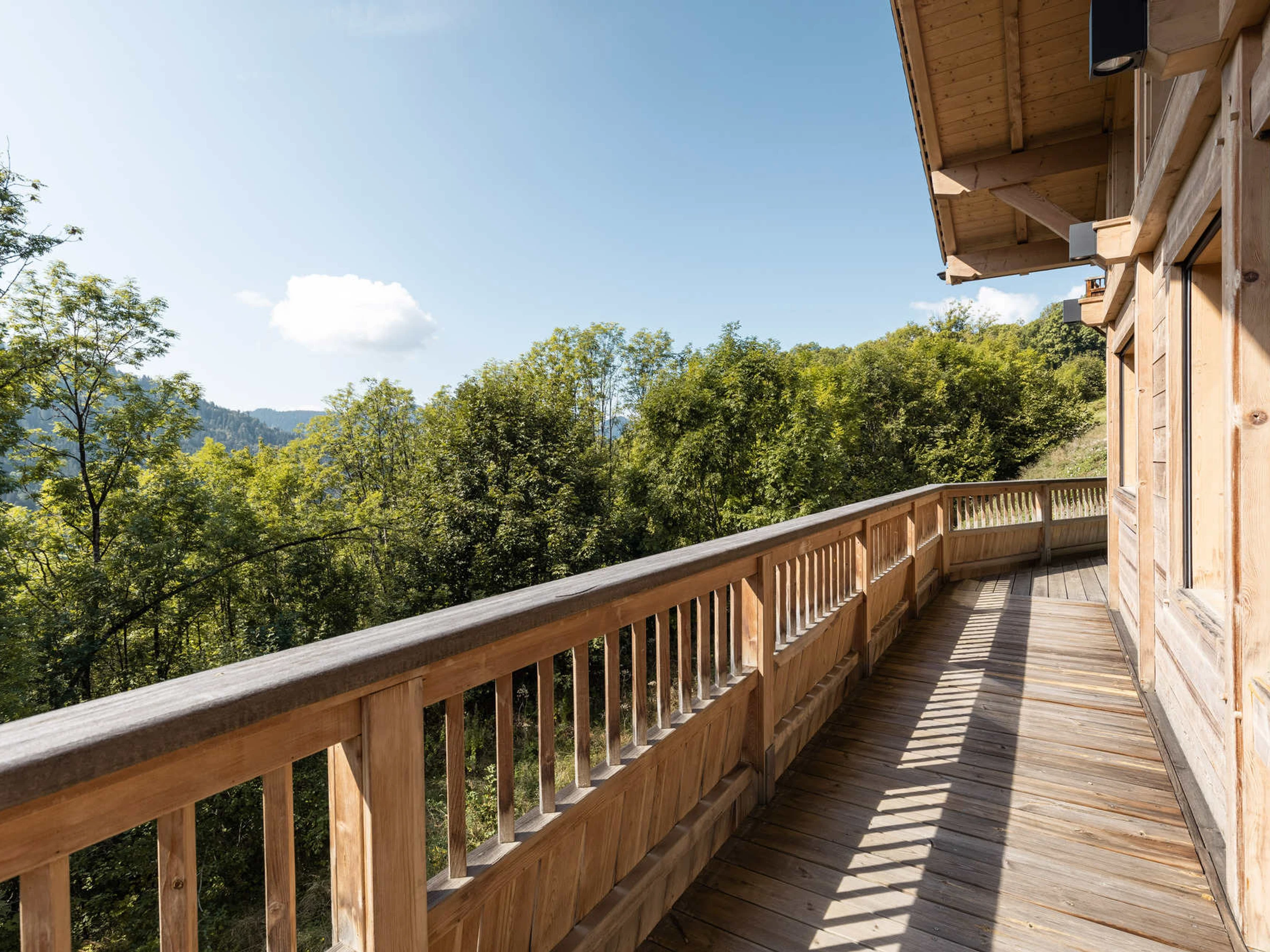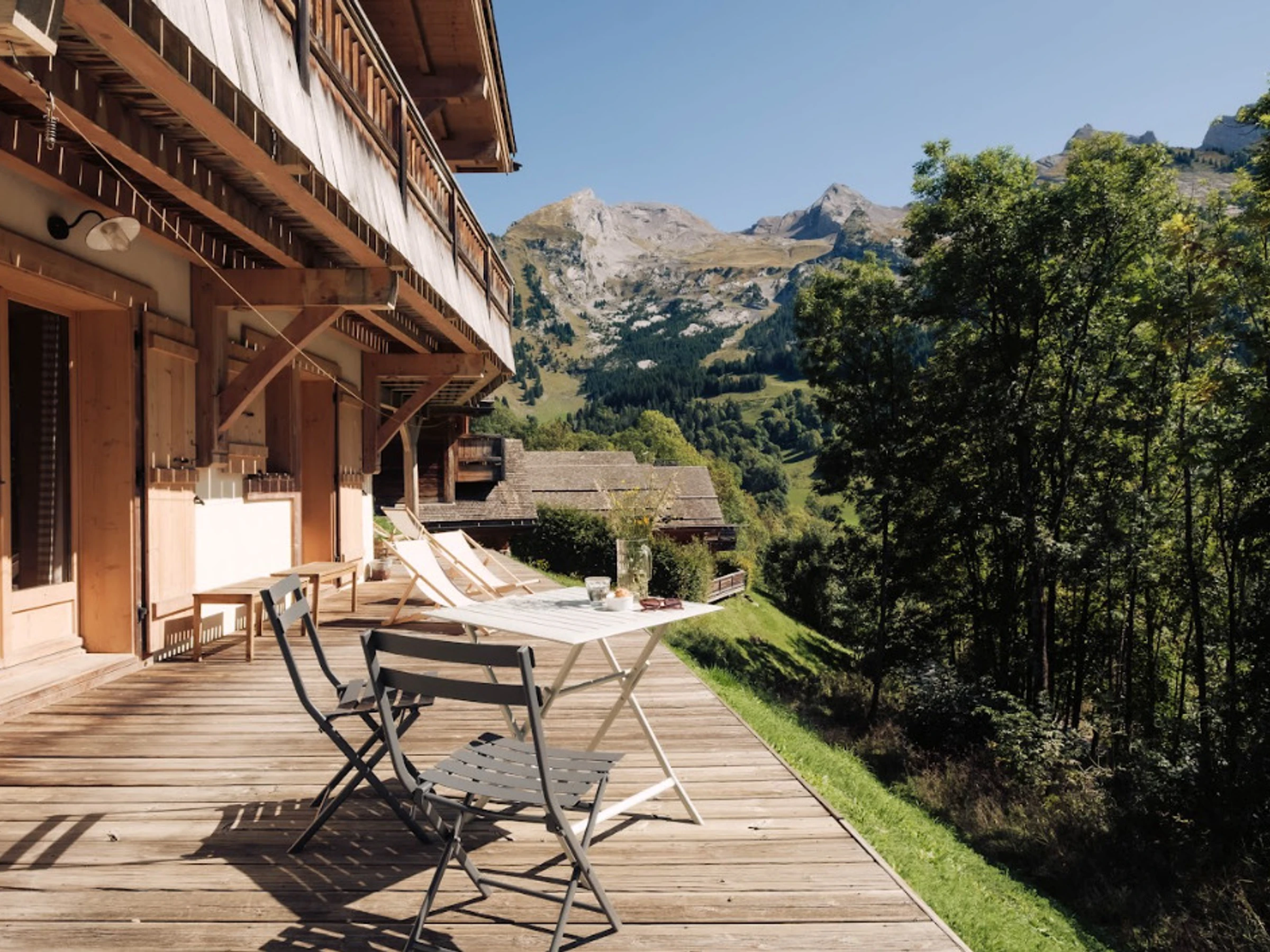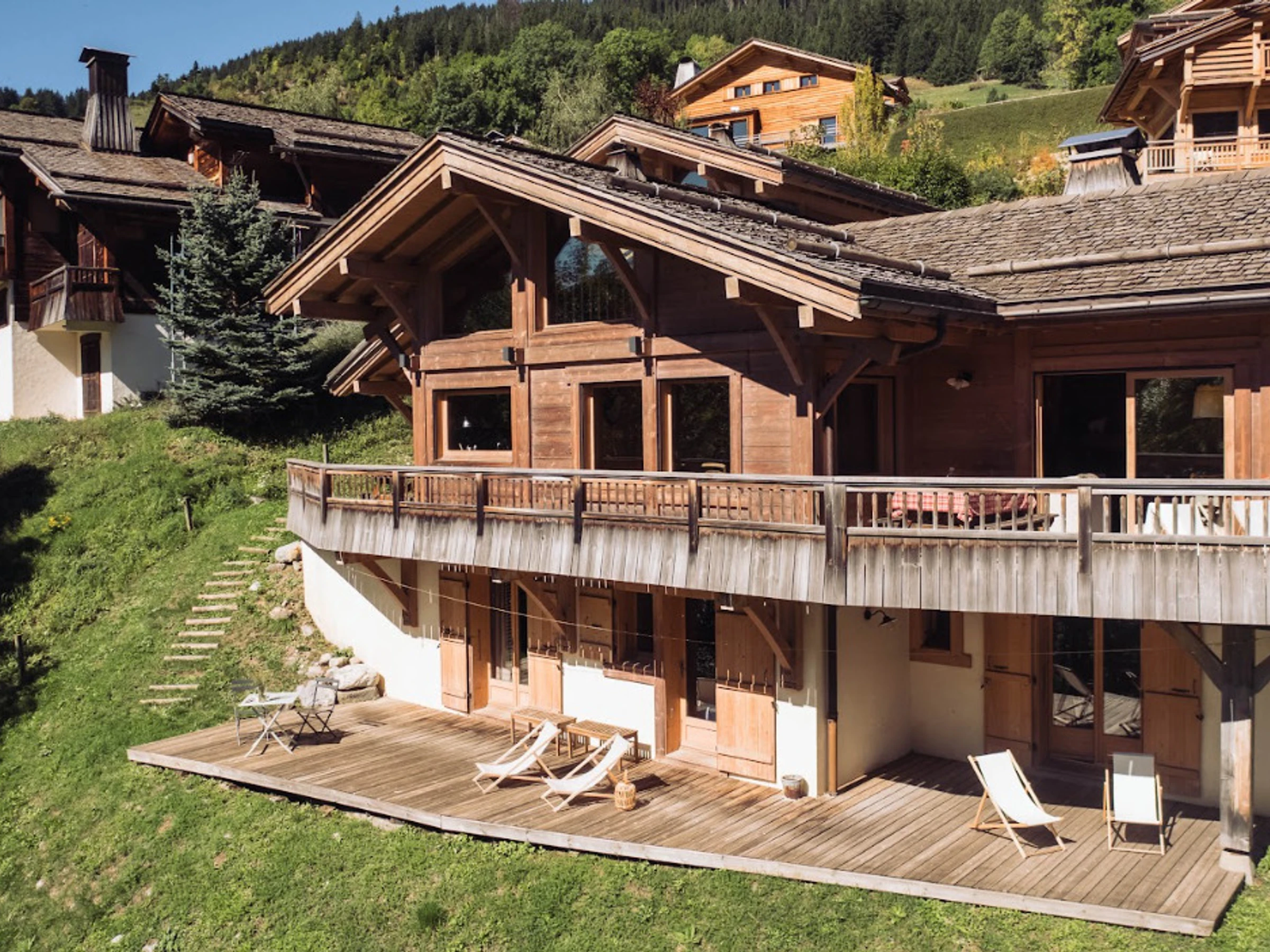 À l’extérieur, grâce à son exposition sud, le chalet s’ouvre sur plusieurs terrasses offrant une vue spectaculaire sur les montagnes. La terrasse principale invite à partager des repas en plein air ou à se détendre au soleil après une journée sur les pistes. Le chalet dispose également d’un garage pour un véhicule et d’un stationnement extérieur.