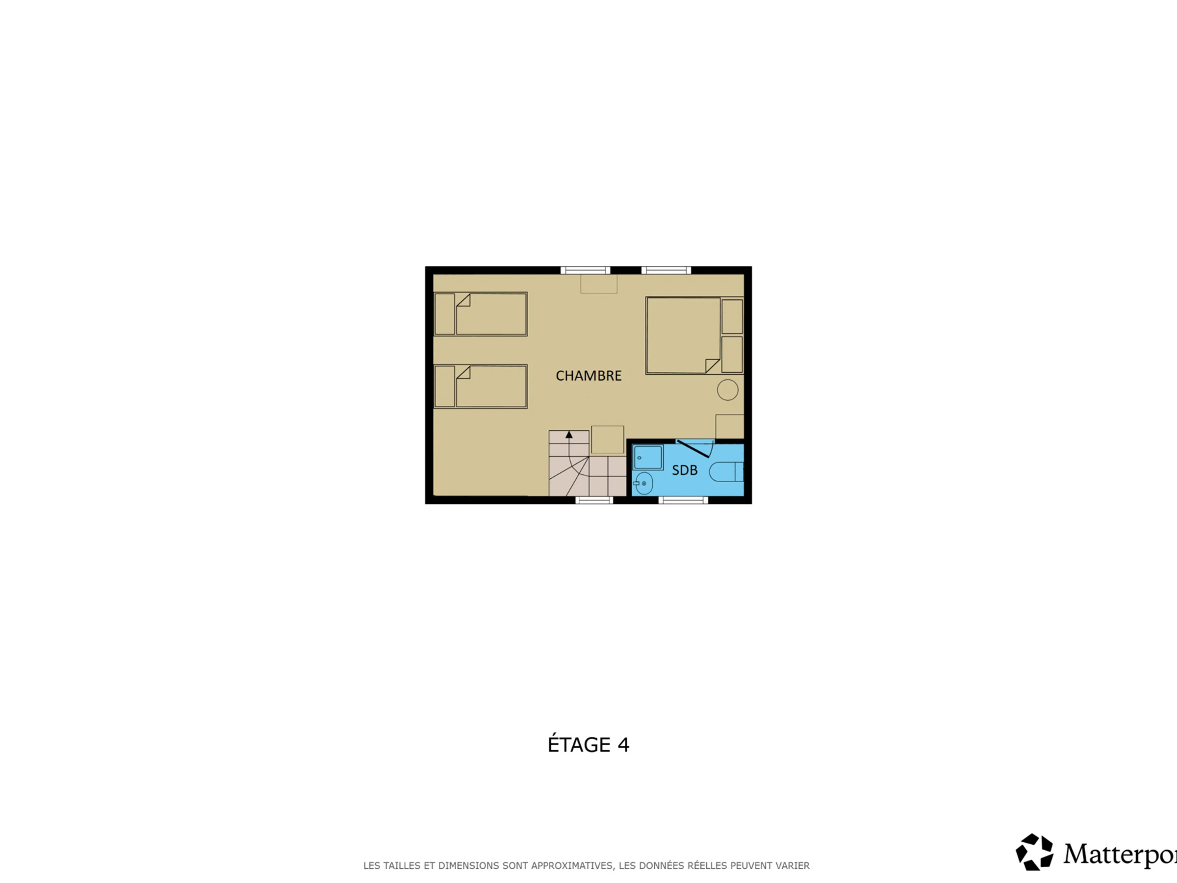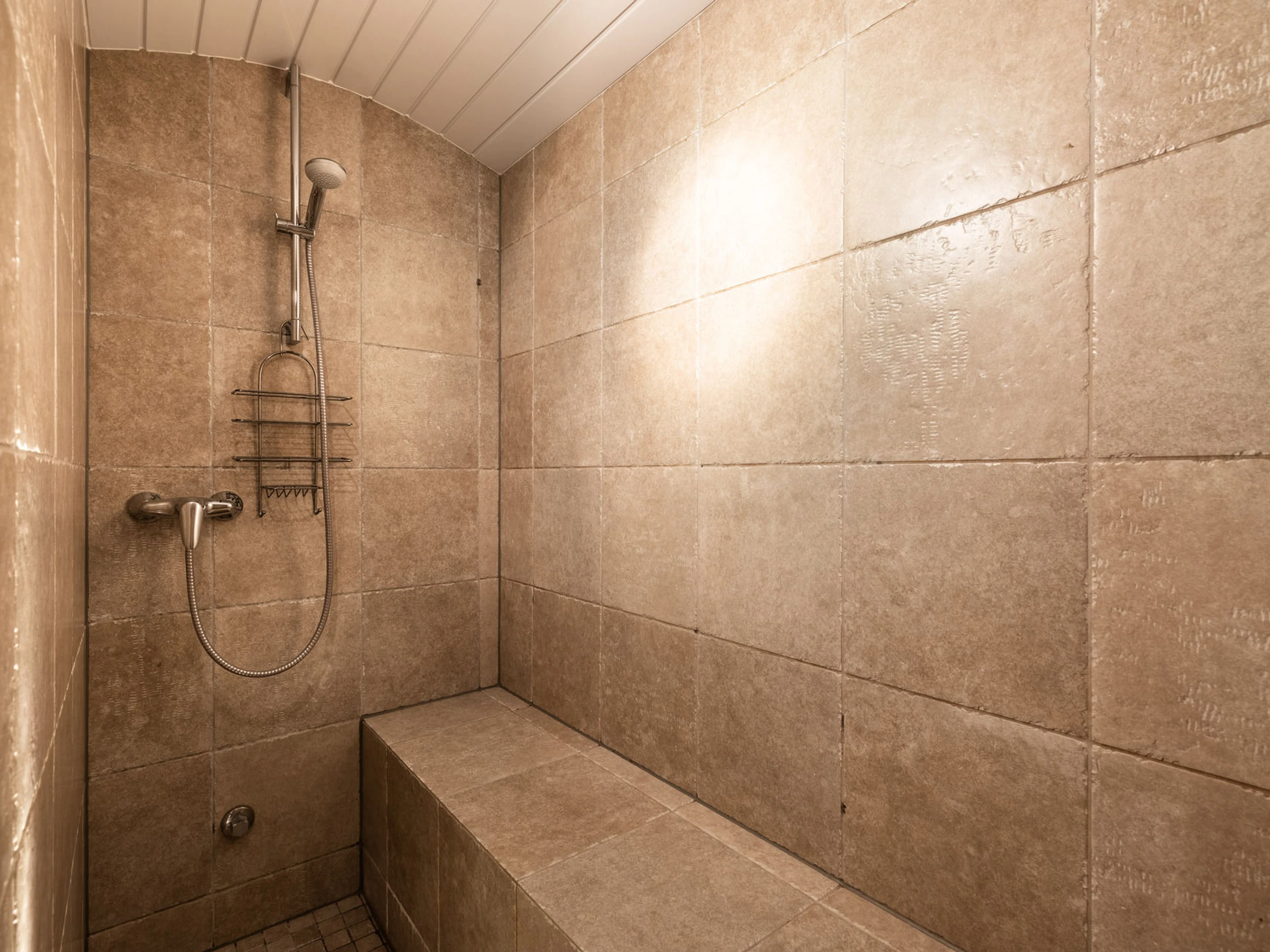 Cet étage comprend deux chambres doubles (lits 160 cm) avec salle d’eau attenante (douche), une chambre double (lit 160 cm) avec bureau et un coin nuit indépendant avec lit double (150 cm) surélevé. Les trois chambres s’ouvrent sur la terrasse inférieure, offrant un panorama apaisant et une belle intimité. Le hammam invite à des moments de détente. Une salle de bains avec baignoire, WC et un WC indépendant supplémentaire complètent ce niveau.