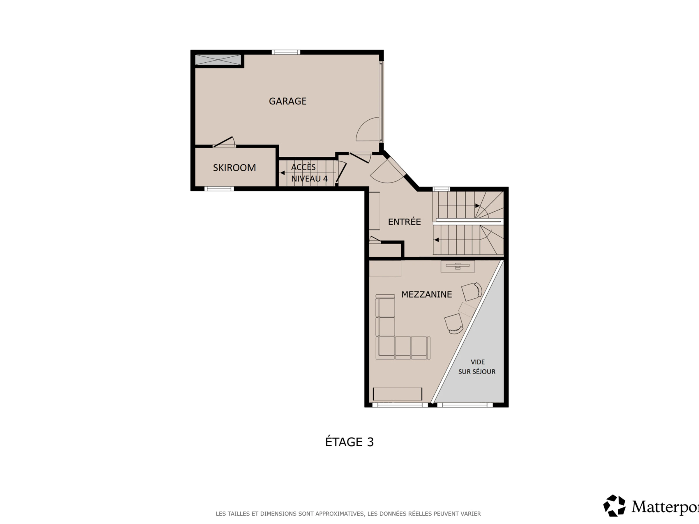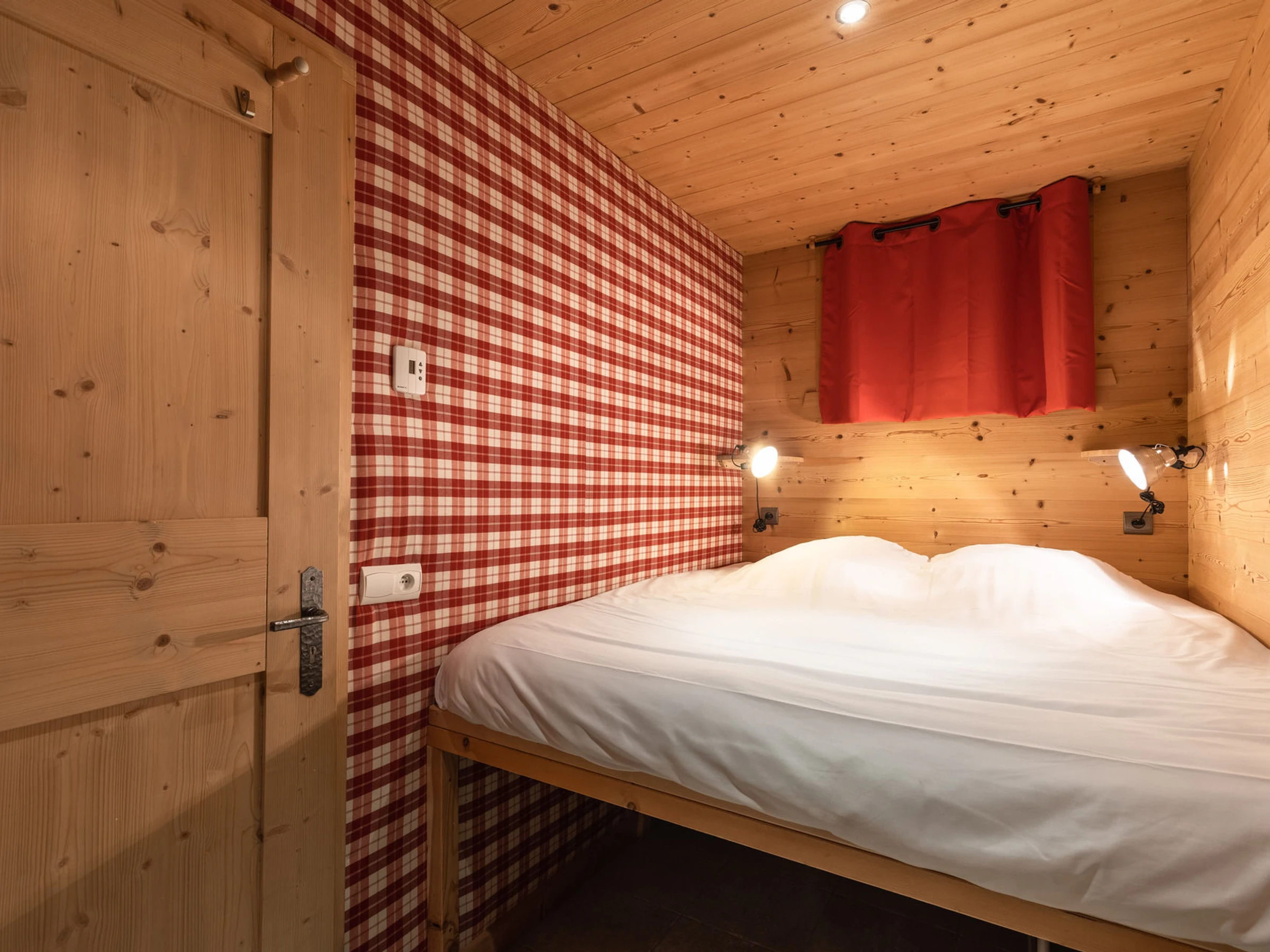 Dès l’entrée, un large hall dessert la mezzanine, aménagée en coin TV et lecture, d’où l’on profite d’une vue plongeante sur les montagnes. Ce niveau comprend également une chambre équipée d’un lit double (lit 160 cm) et de deux lits simples (90 cm), avec salle d’eau attenante (douche et WC) et fenêtre donnant sur l’arrière du chalet. Un ski-room situé dans le garage permet de ranger son matériel d’hiver.