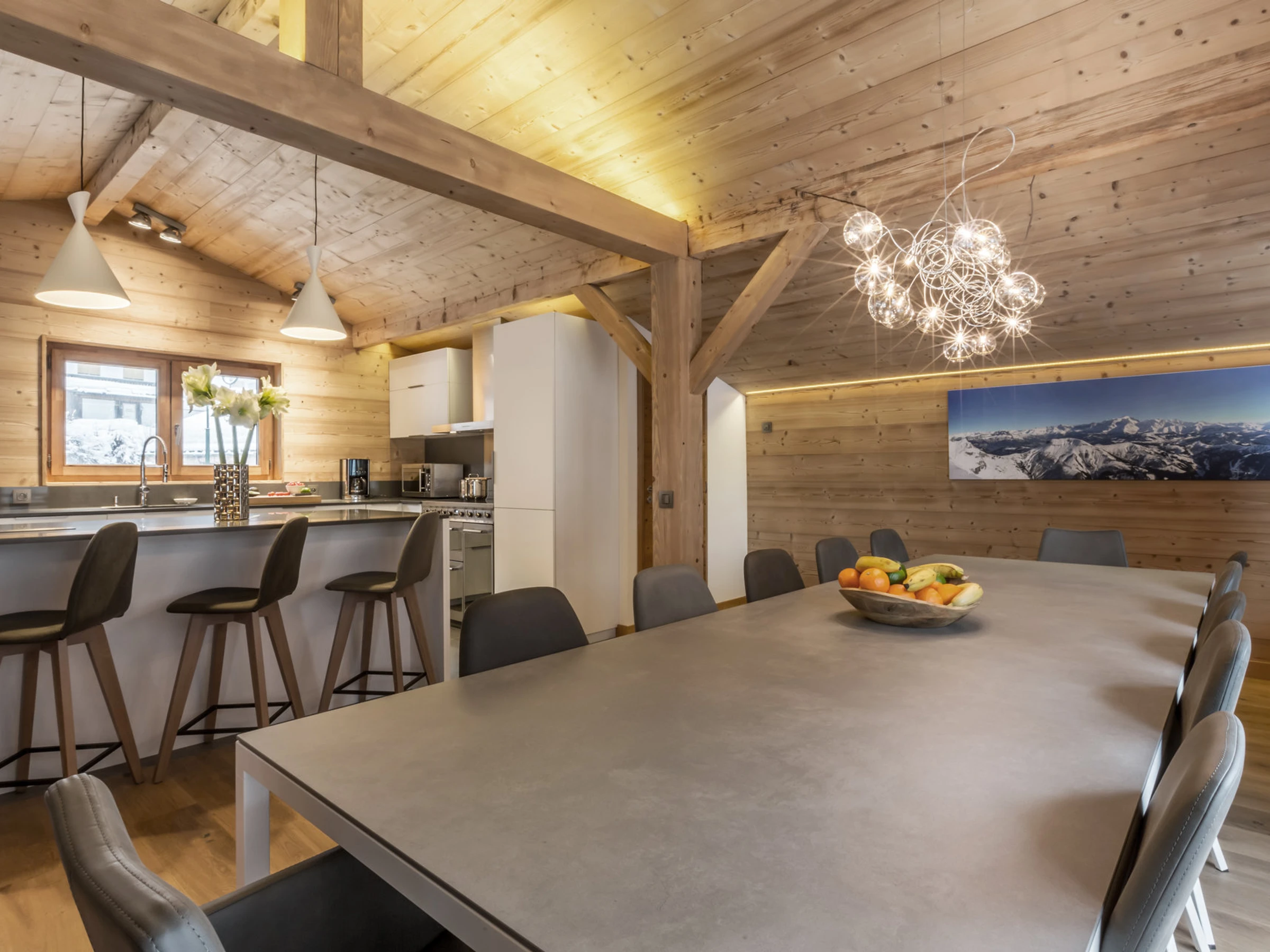 Sous une belle charpente en bois, le vaste séjour (près de 60 m²) constitue le cœur vivant du chalet. Autour du poêle suspendu, un salon convivial et un coin salle à manger s’ouvrent sur un balcon animé par le petit torrent. La cuisine ouverte, parfaitement équipée dispose d’un accès sur l’avant du chalet, côté rue principale. Un WC indépendant avec lave-mains complète ce niveau.