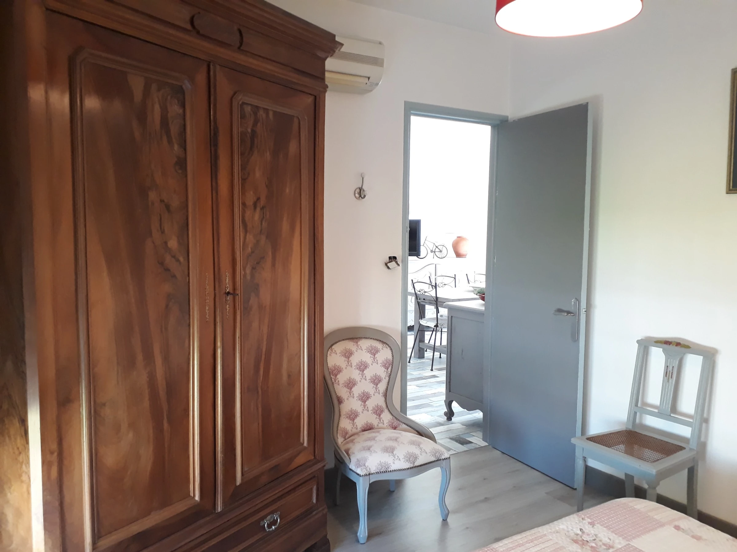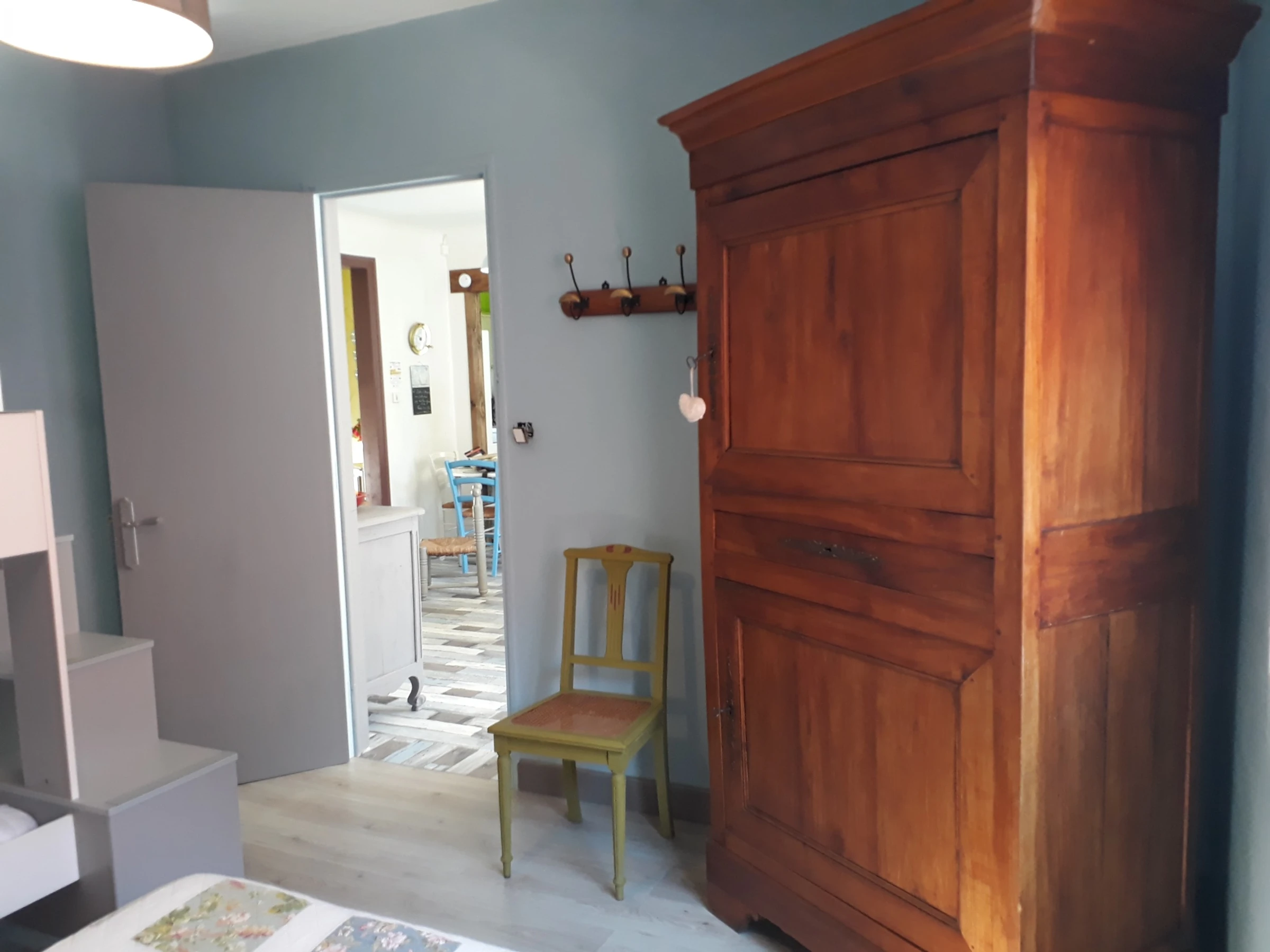 Une chambre avec un lit en 140 et deux lits superposés en 90 et placard