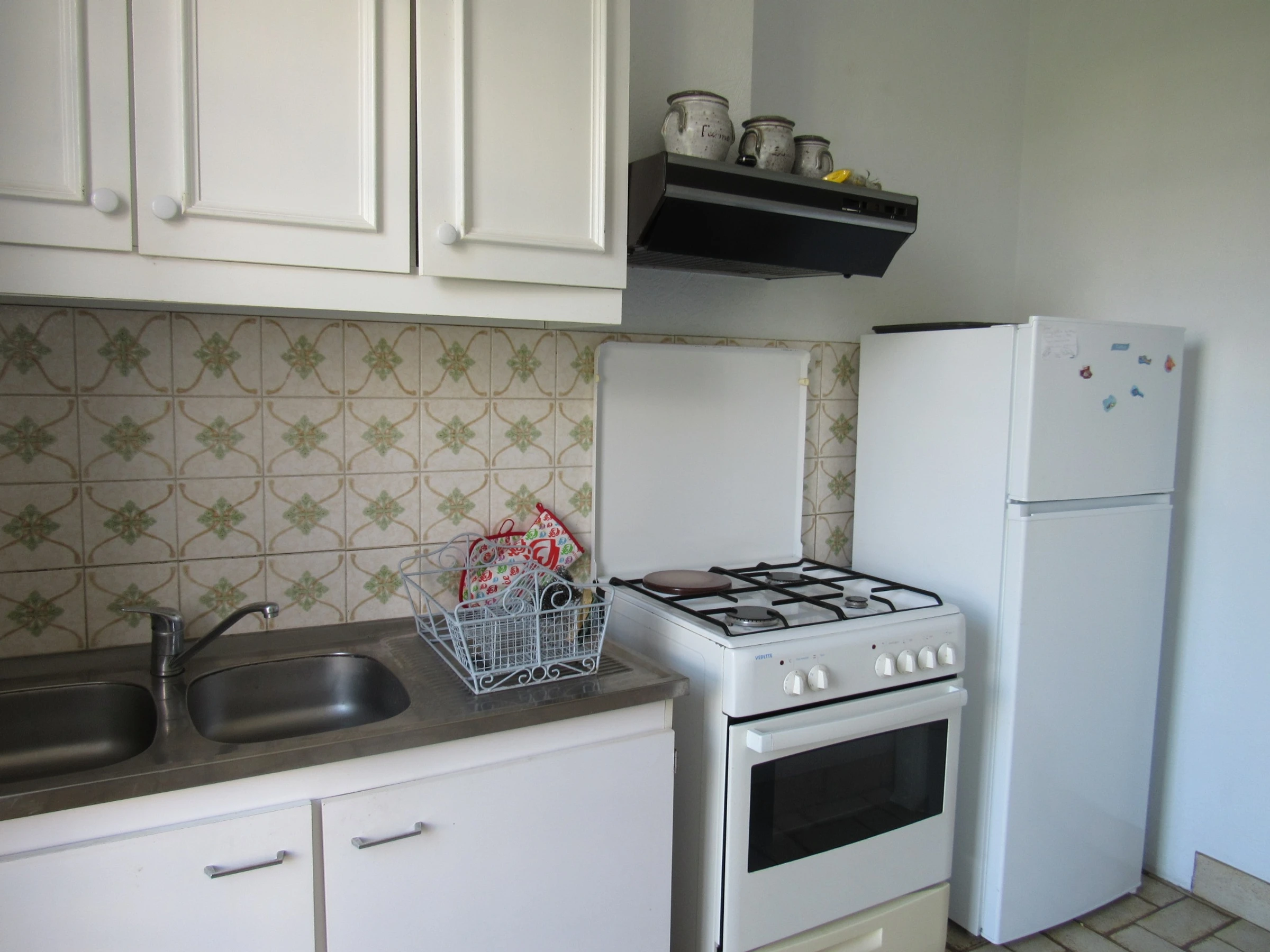 Cuisine équipée avec gazinière, réfrigérateur/congélateur, micro-ondes,