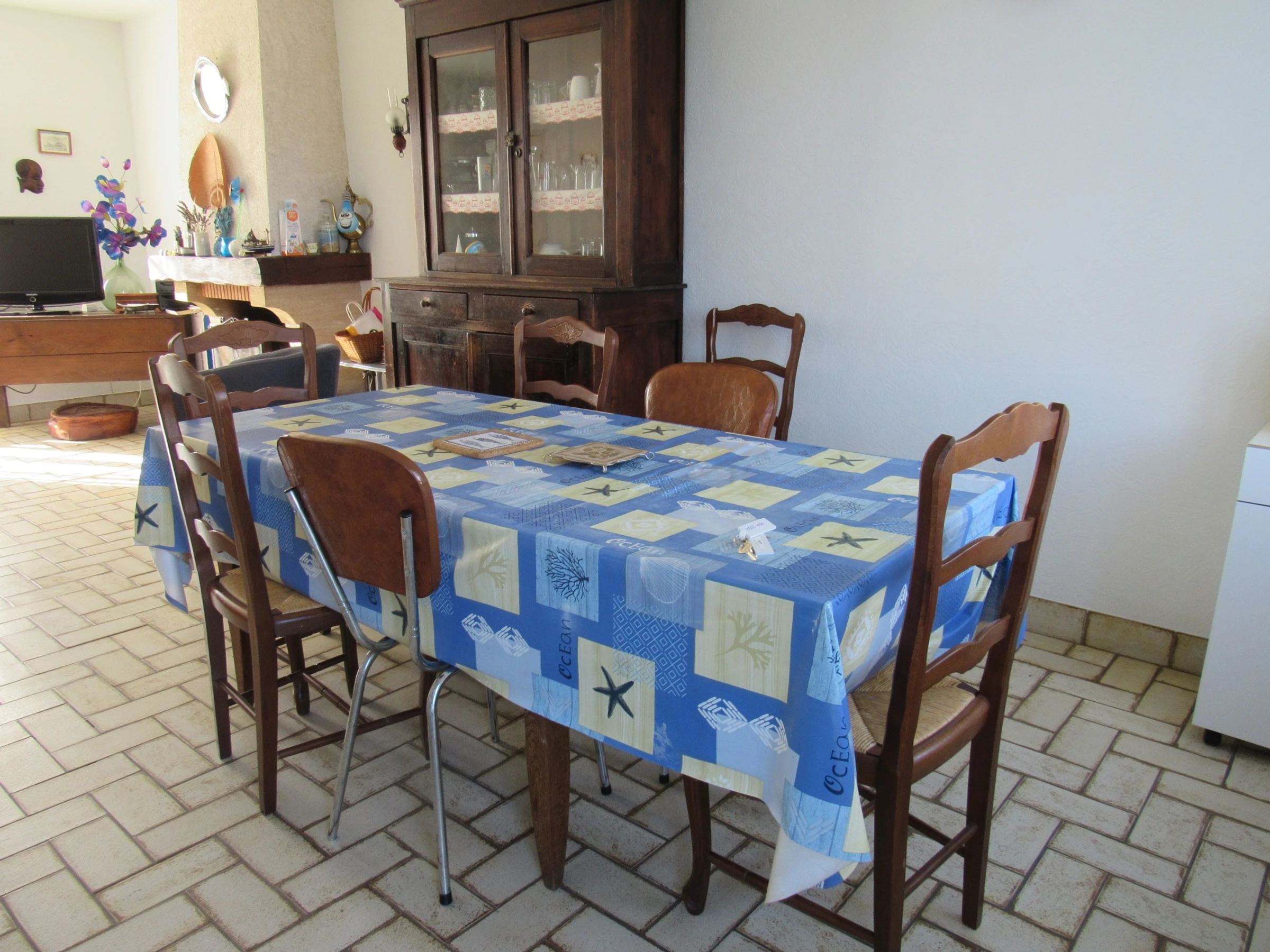 Séjour avec table pour manger, coin salon avec canapé et télévision,