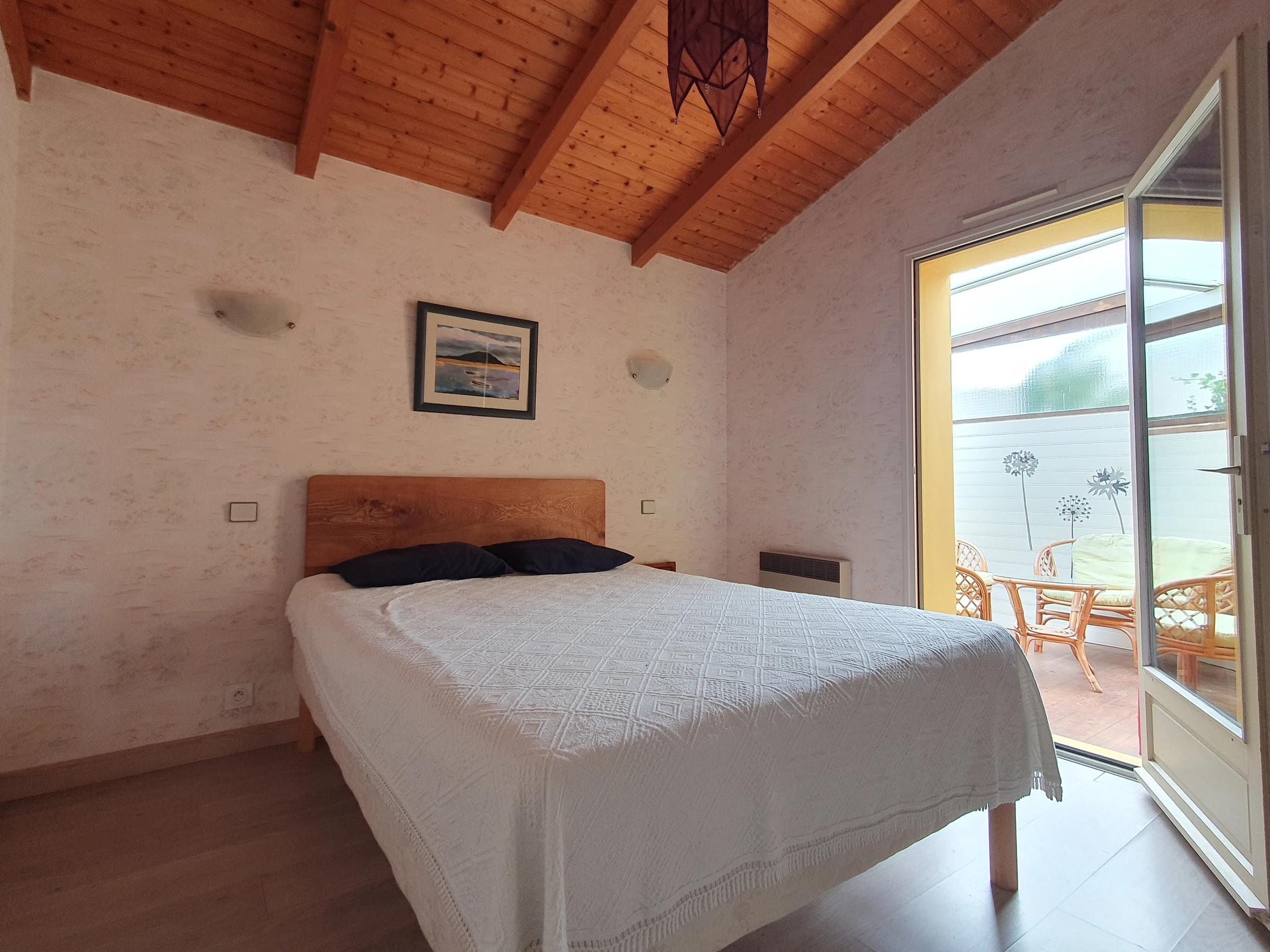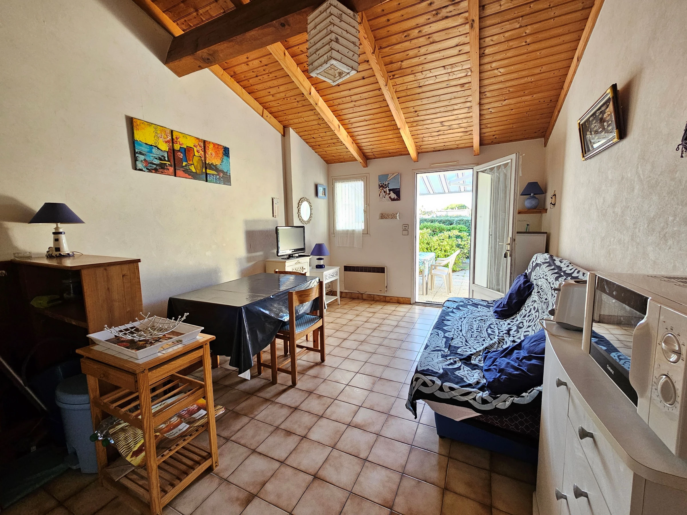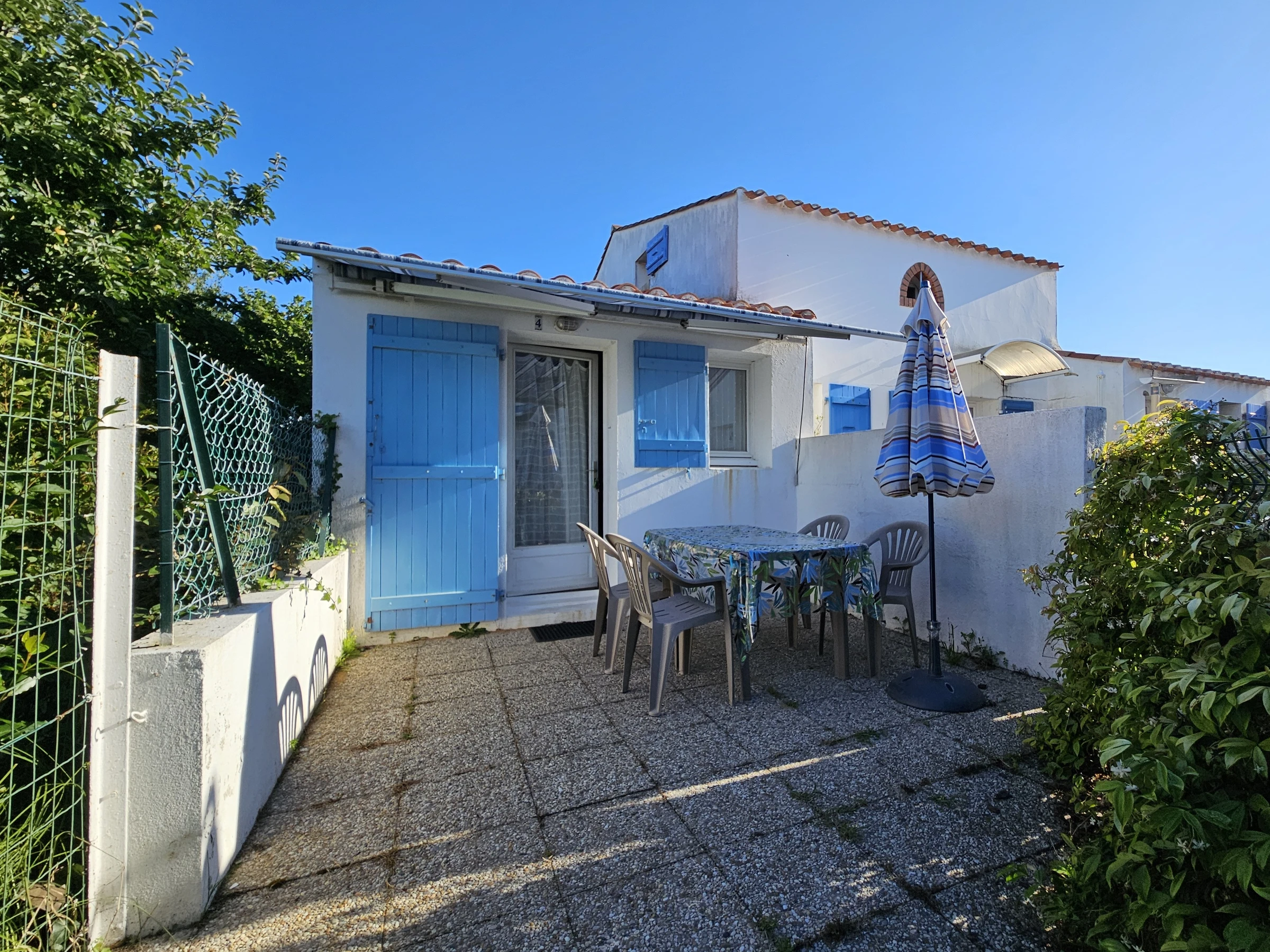 Dans petite résidence située centre du village (calme) proche des commerces, à 400 M de la plage, Comprenant : Une petite pièce principale faisant coin salon TELEVISION et clic-clac couchage 1 à 2 personnes, coin repas et Kitchenette équipée d' un mini-four, micro ondes, 2 Plaques électriques, un frigo top encastré, lave vaisselle, LAVE LINGE. Une chambre avec un lit deux personnes donnant sur petite loggia fermée avec salon en rotin. Salle d'eau avec douche, lavabo et Wc - Un coin nuit en hauteur pour ados , non adapté aux enfant de moins 7 ans (accès par échelle) sans velux mais une fenêtre donnant sur vide séjour avec un matelas deux personnes posé au sol + Un matelas une personne posé au sol - Cour et terrasse ensoleillée avec salon de jardin - parking privé -Ménage au soin du locataire. Linge de maison non fourni, location possible auprès de notre partenaire, nous contacter. Chauffage du 1er octobre au 31 mai en sus selon relevé de compteur. Location wifi possible avec box 5G : 40€/semaine