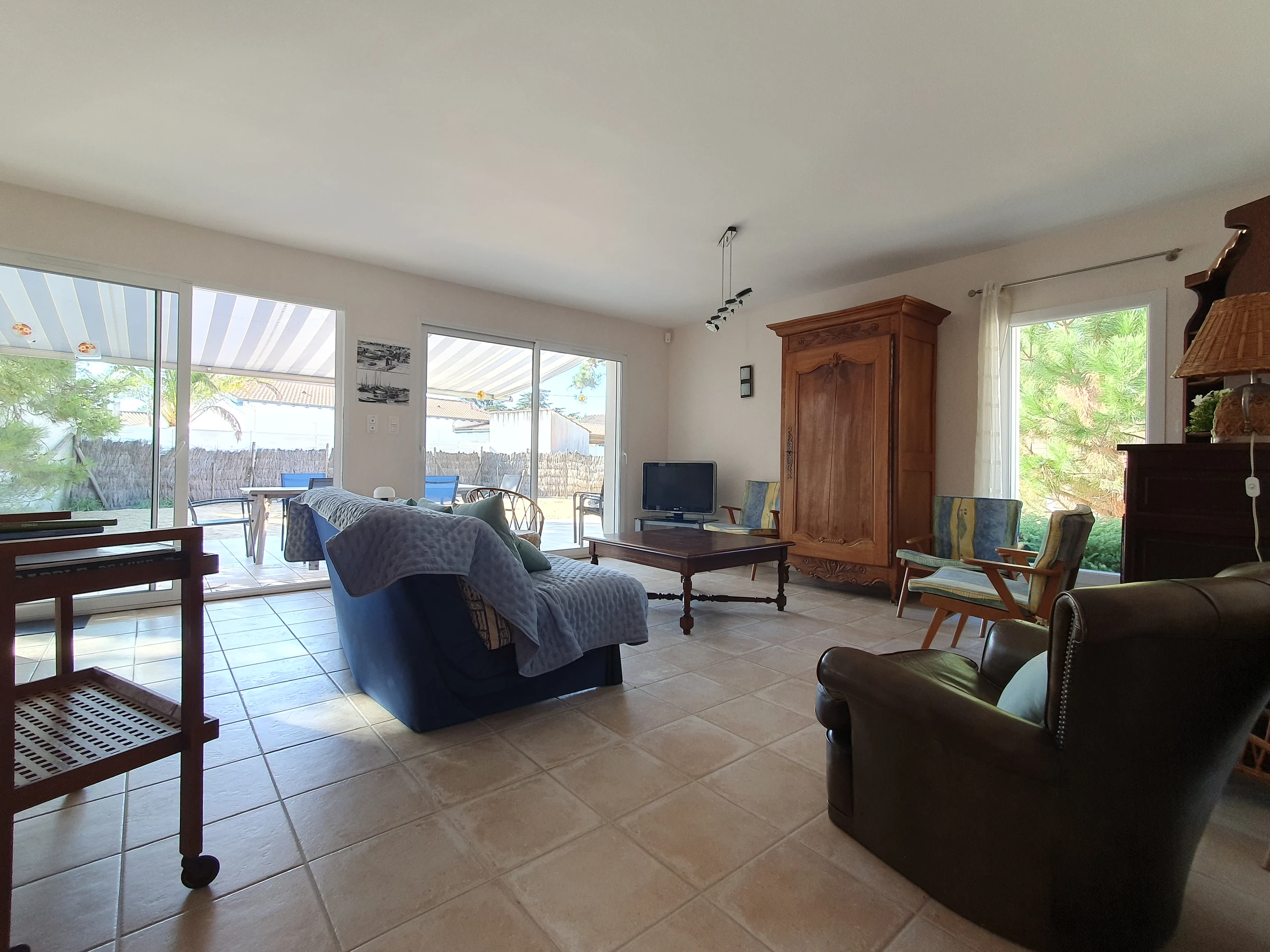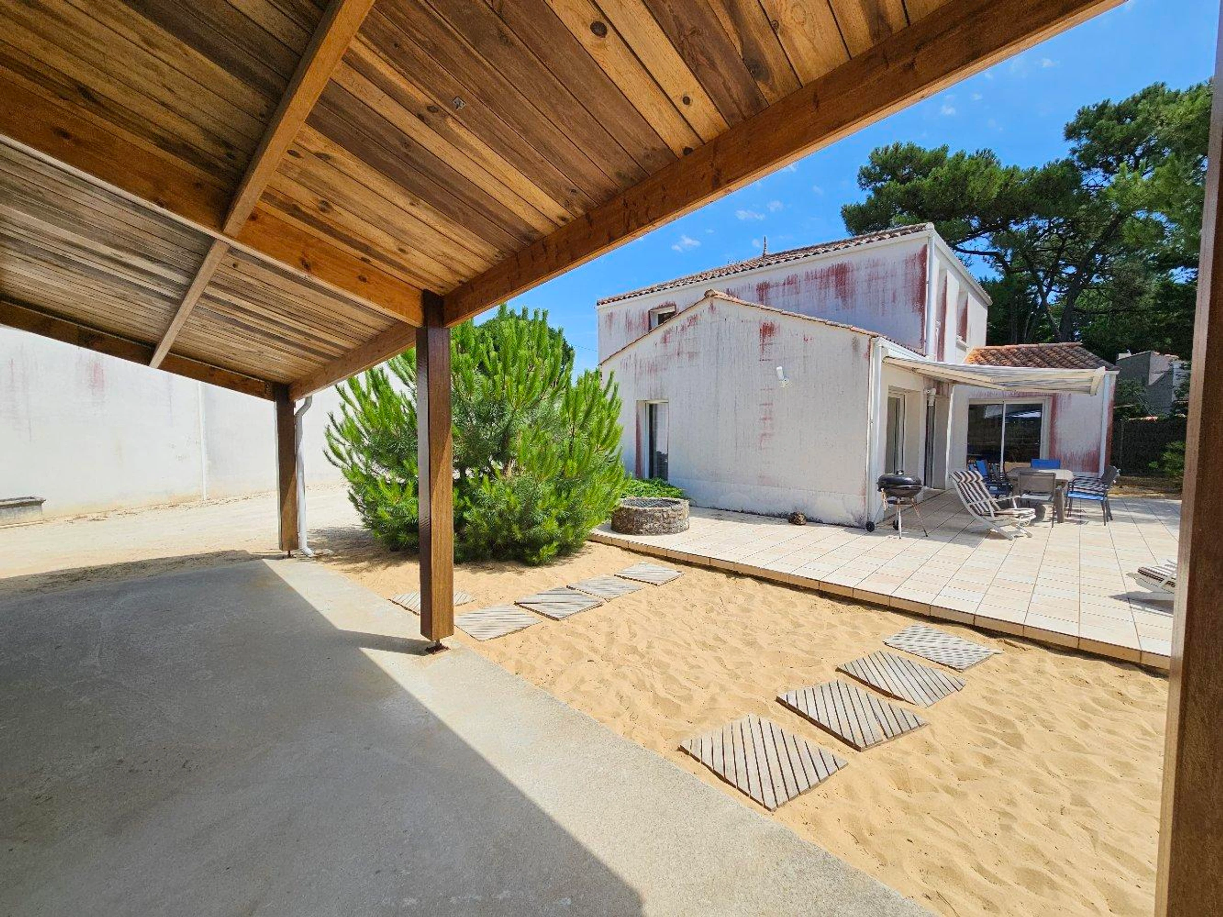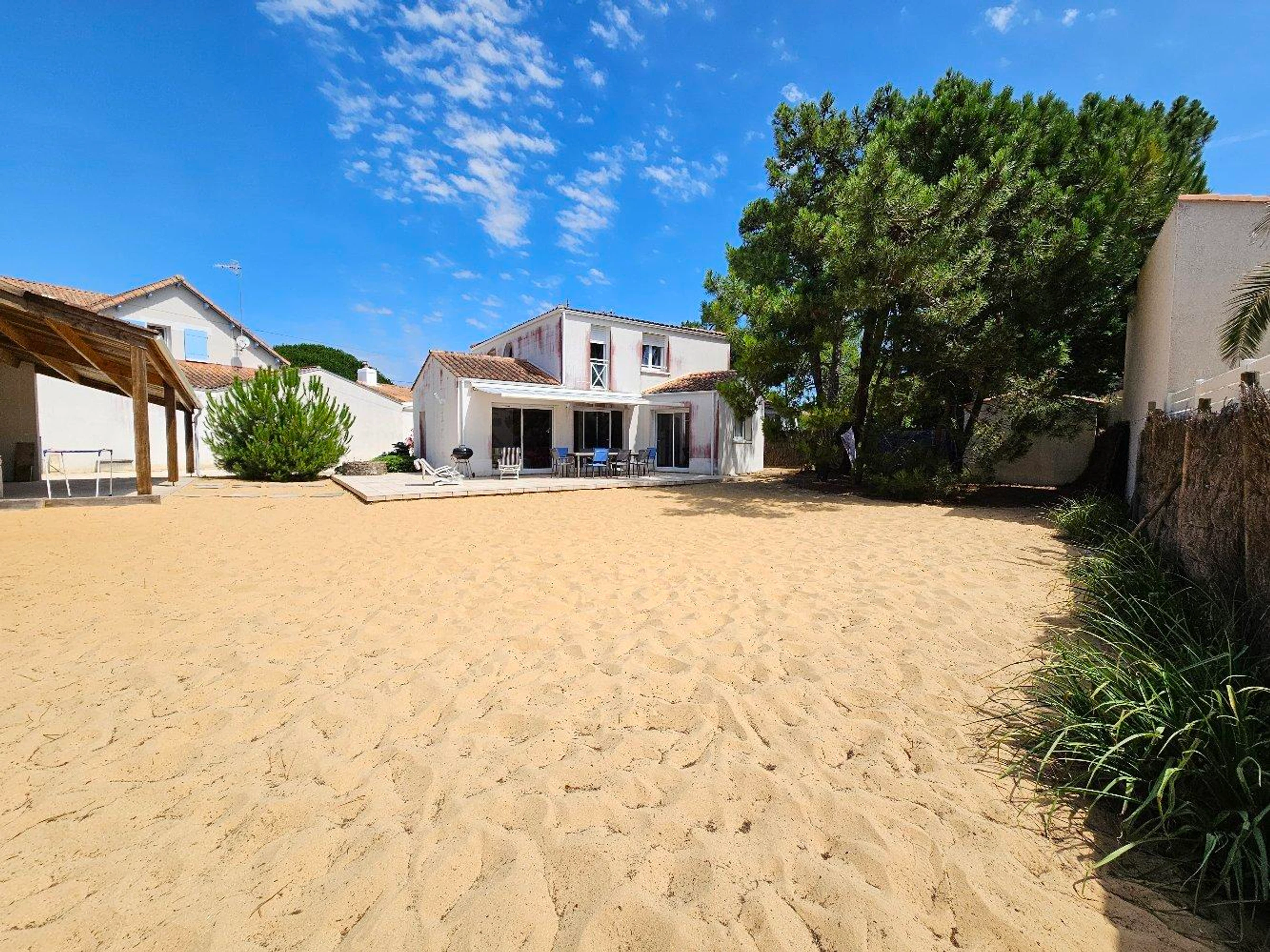 Maison à 500 M de la plage et 200 M des commerces, comprenant: Une entrée avec placard, un séjour/salon avec Télévision, une cuisine équipée (une plaque à induction, four électrique, réfrigérateur avec partie congélateur, LAVE VAISSELLE et Micro ondes). Une chambre avec un lit de deux personnes, une chambre avec un lit de deux personnes et TELEVISION, un cellier avec LAVE LINGE, congélateur et frigo, salle de bain avec baignoire et vasque sur meuble, un WC avec lave main. A l’étage : une mezzanine avec un lit d’une personne, une chambre avec un lit de deux personnes, une chambre avec deux lits d’une personne, une salle d'eau (douche, vasque sur meuble), un WC – Un jardin avec terrasse et store banne, salon de jardin et barbecue. (laisser accès passage commun pour desservir 2ème maison du fond) - Ménage au soin du locataire. Linge de maison non disponible, location de linge possible auprès de notre partenaire: ID SERVICE. EDF en sus en intersaison. location wifi possible avec box 5G : 40€/semaine