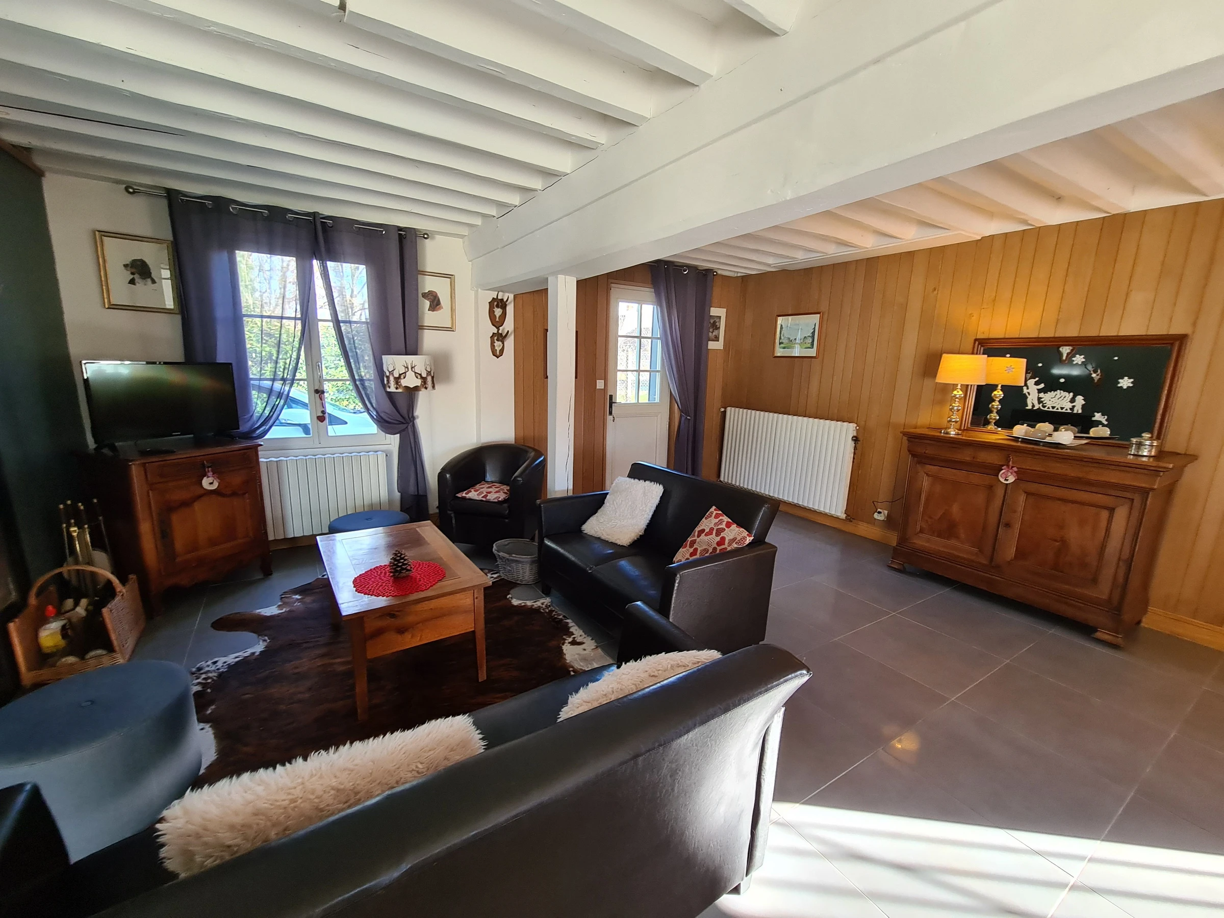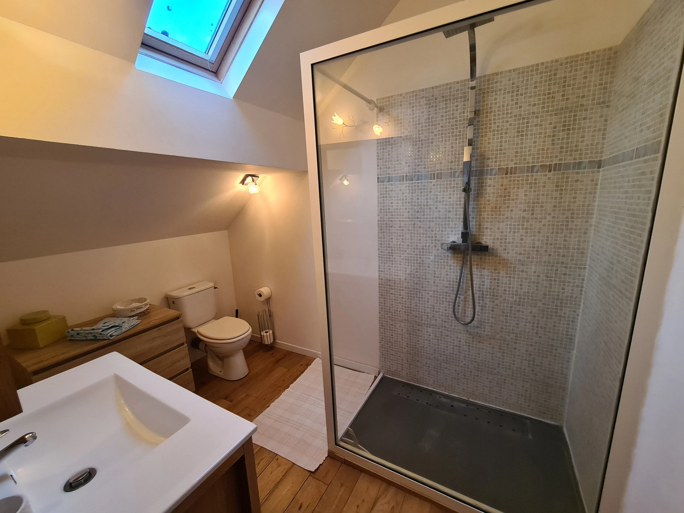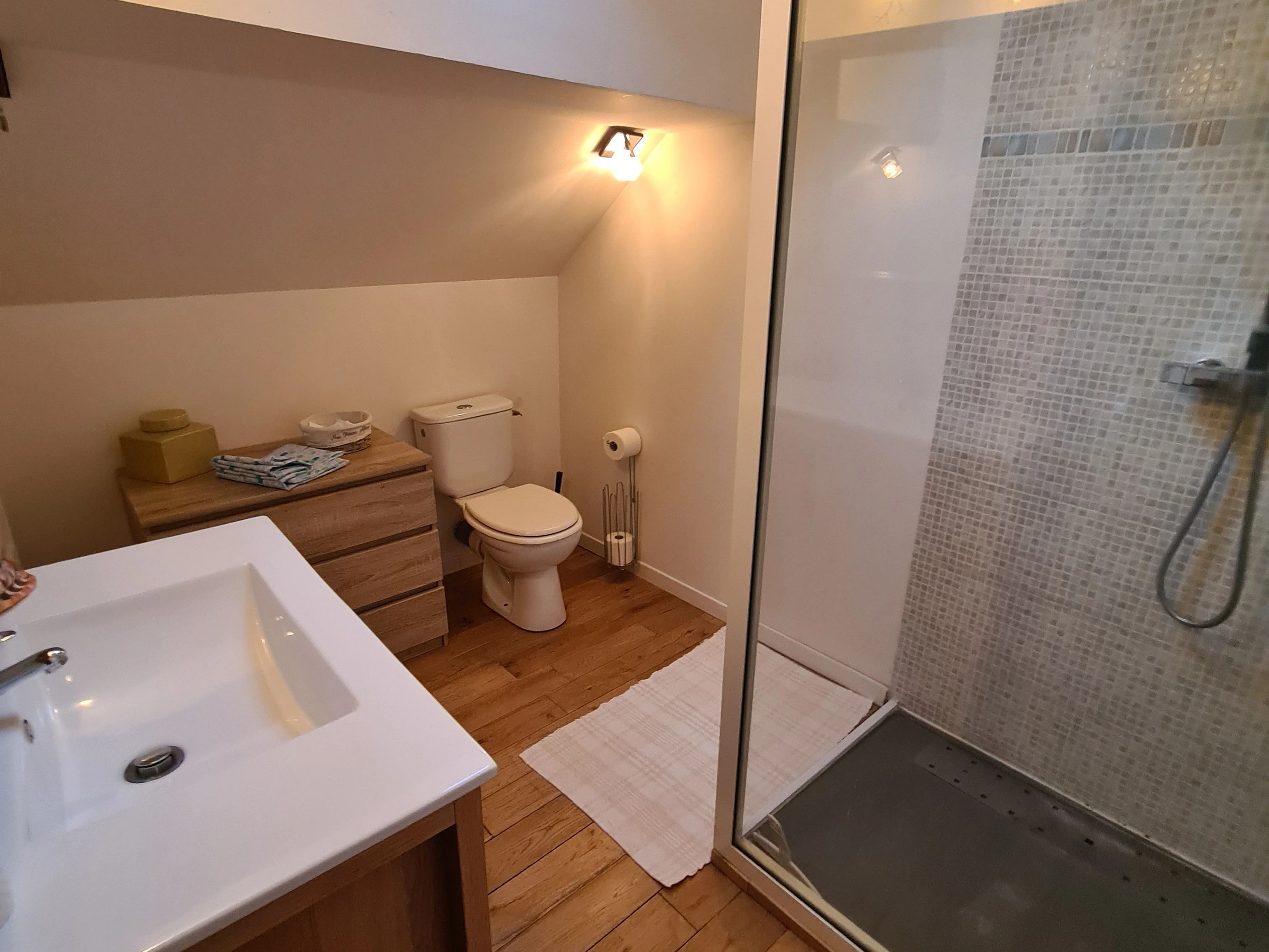 Espace à vivre de 75 m² : séjour avec cheminée, salle à manger et cuisine ouverte équipée. Chambre parentale avec un lit 140 cm et WC avec lave-mains. Salle d'eau avec wc.