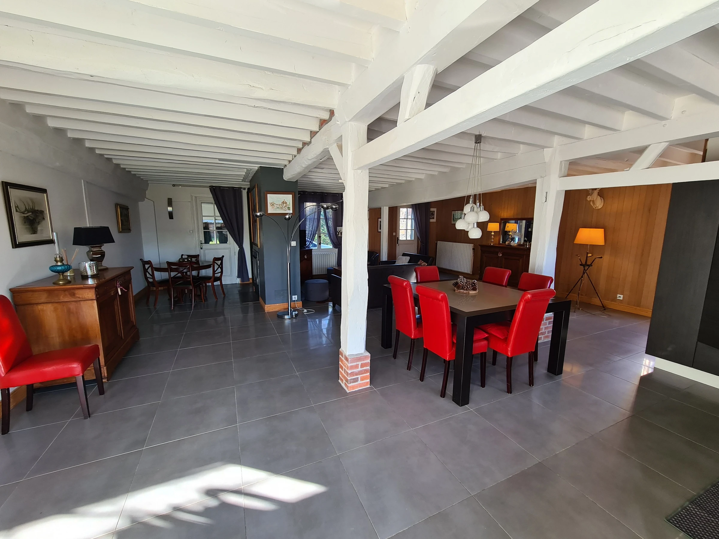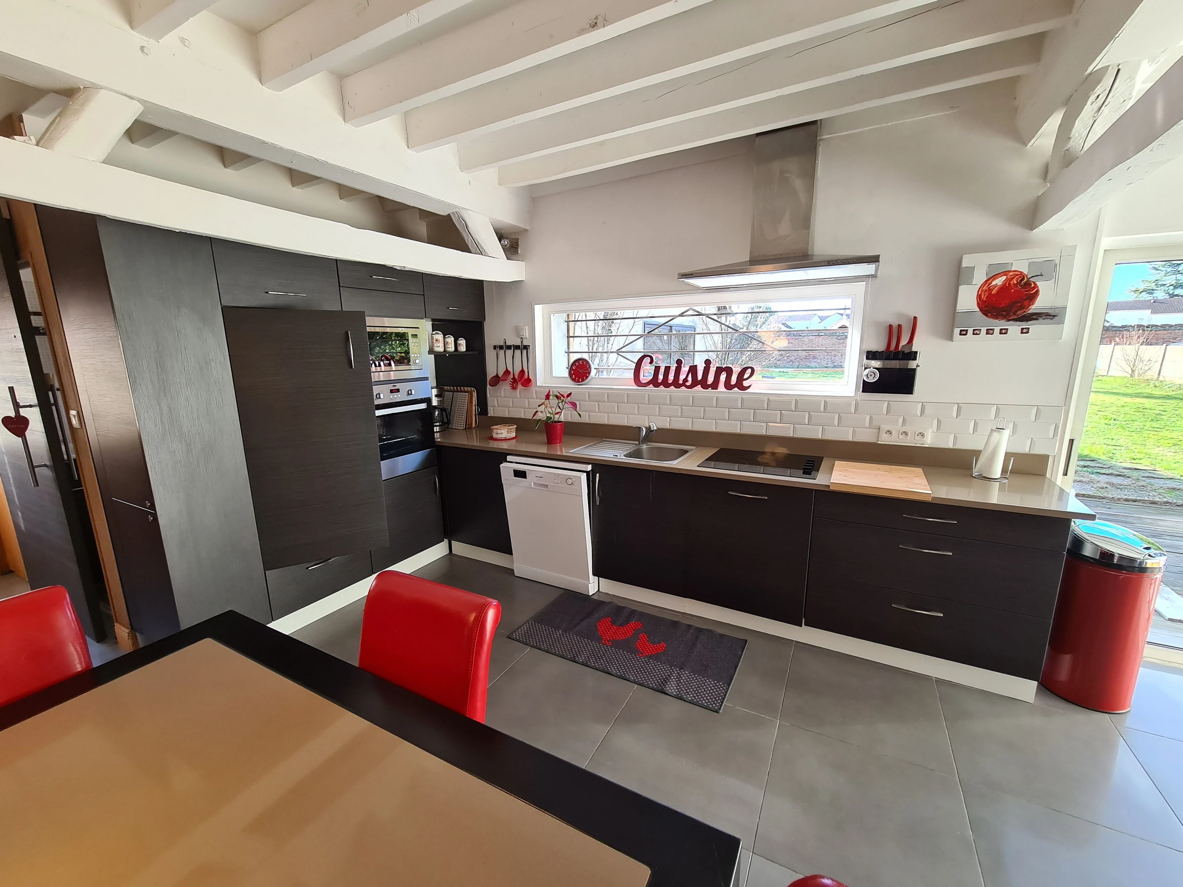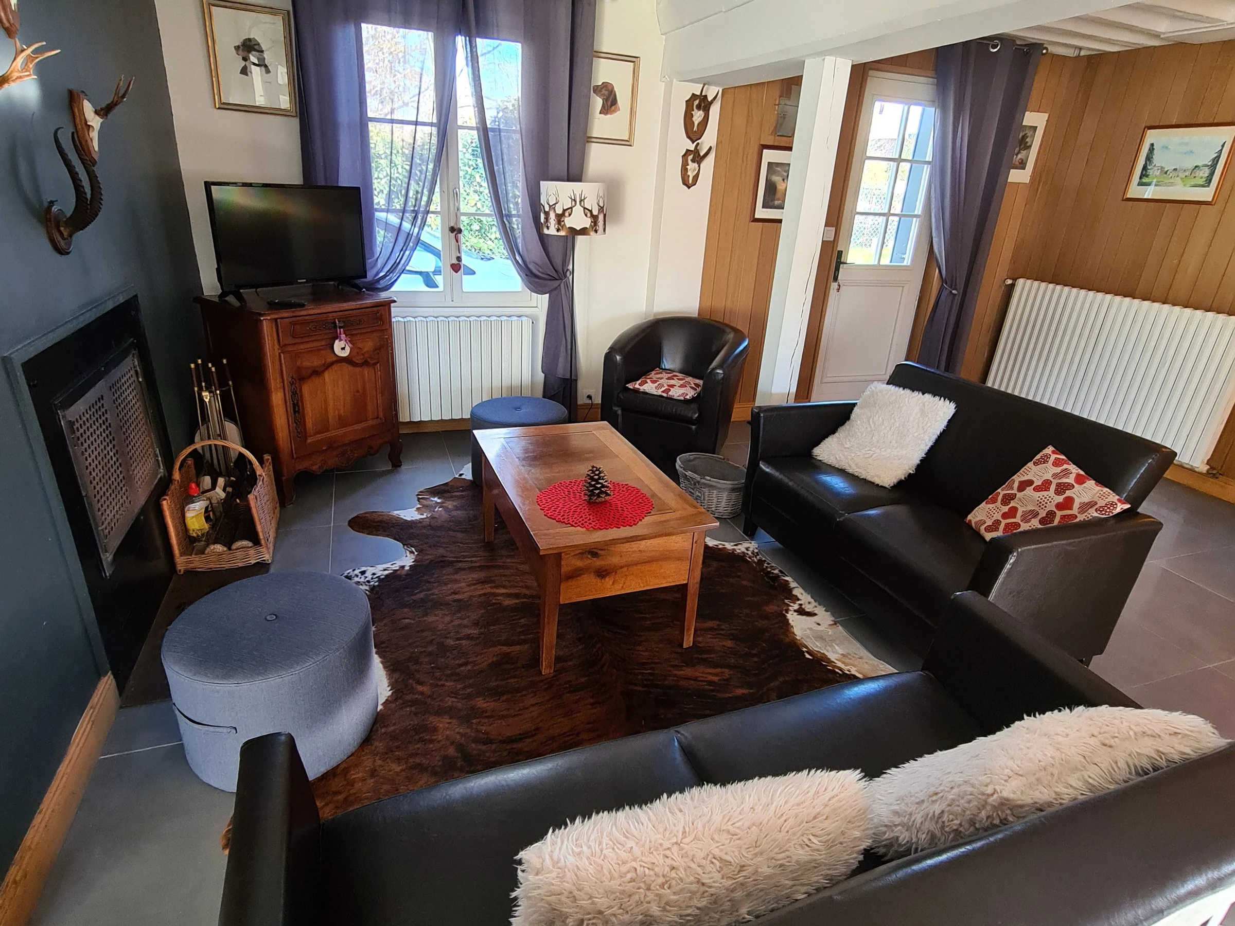 Espace à vivre de 75 m² : séjour avec cheminée, salle à manger et cuisine ouverte équipée. Chambre parentale avec un lit 140 cm et WC avec lave-mains. Salle d'eau avec wc.