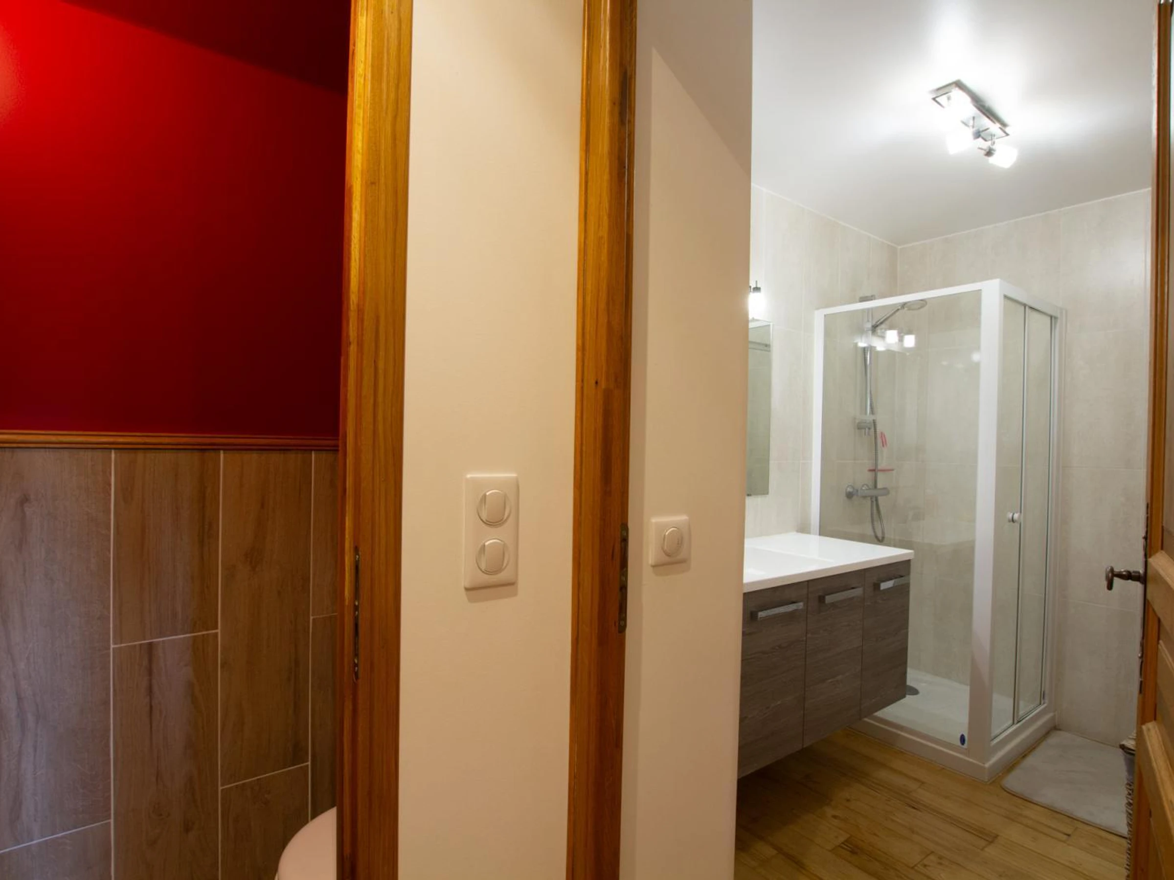 Vous disposez en descendant les 3 marches d'une 1 ère chambre avec un lit de 140 en face une salle d'eau indépendante et WC indépendants.
