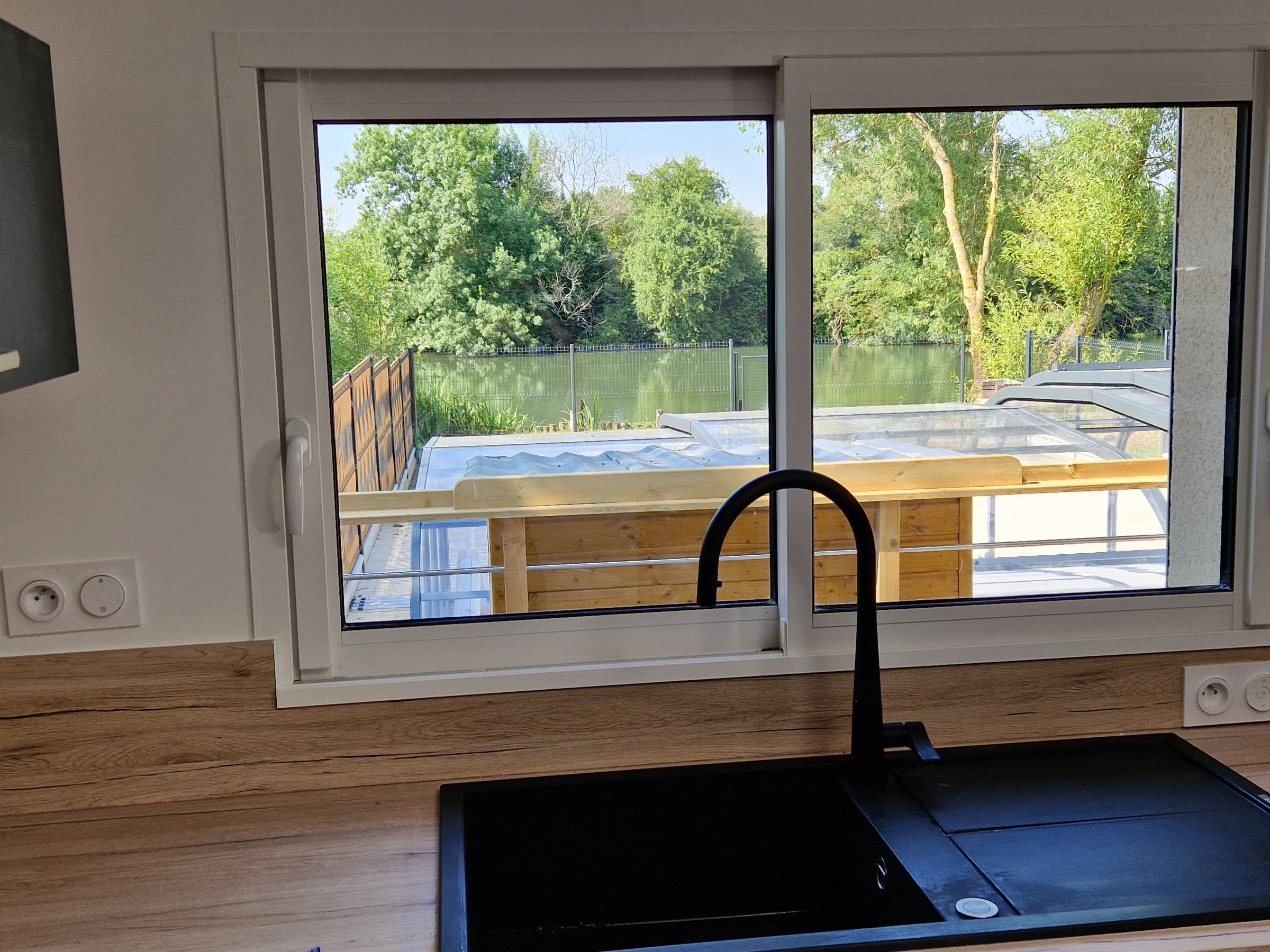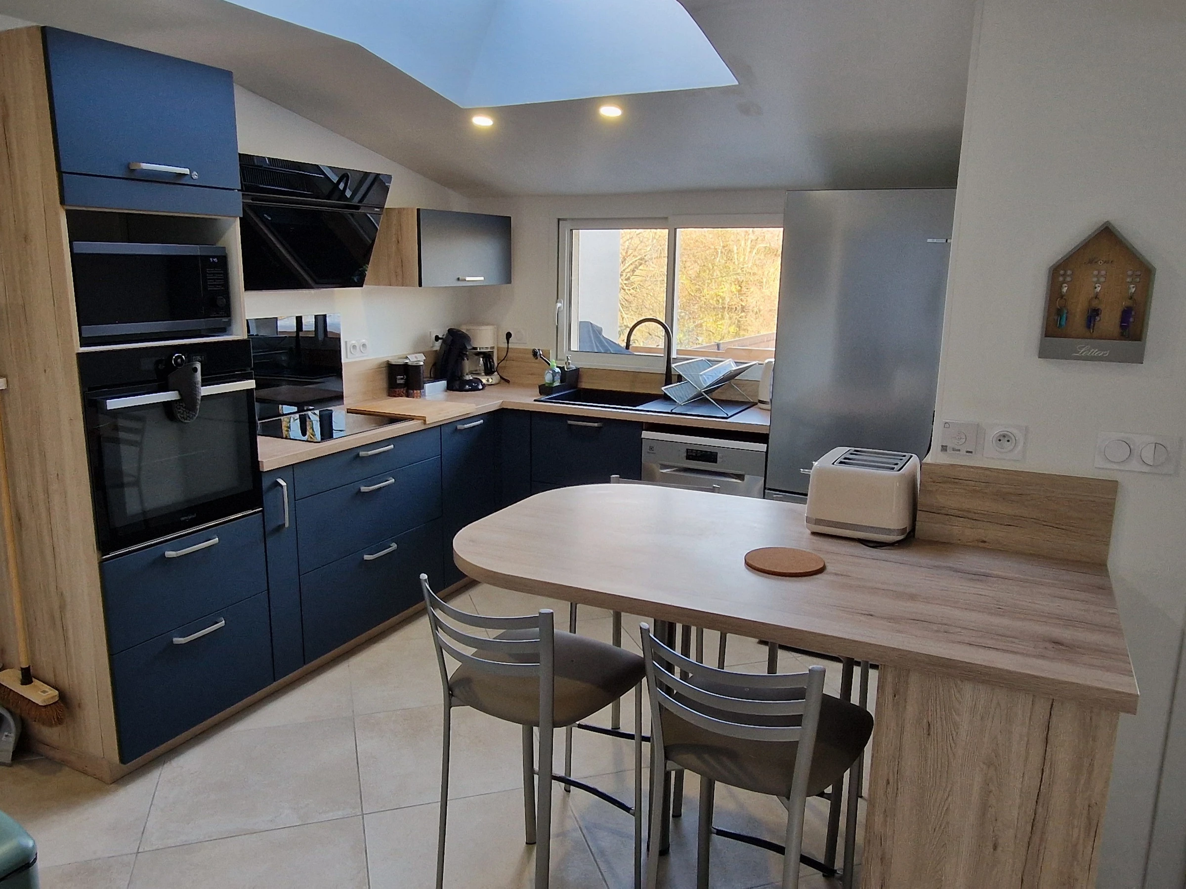 A votre disposition, une belle pièce de vie avec cuisine toute équipée, espace repas et salon avec TV, canapé, poêle à granulé, accès internet gratuit. WC au dos de la cuisine.