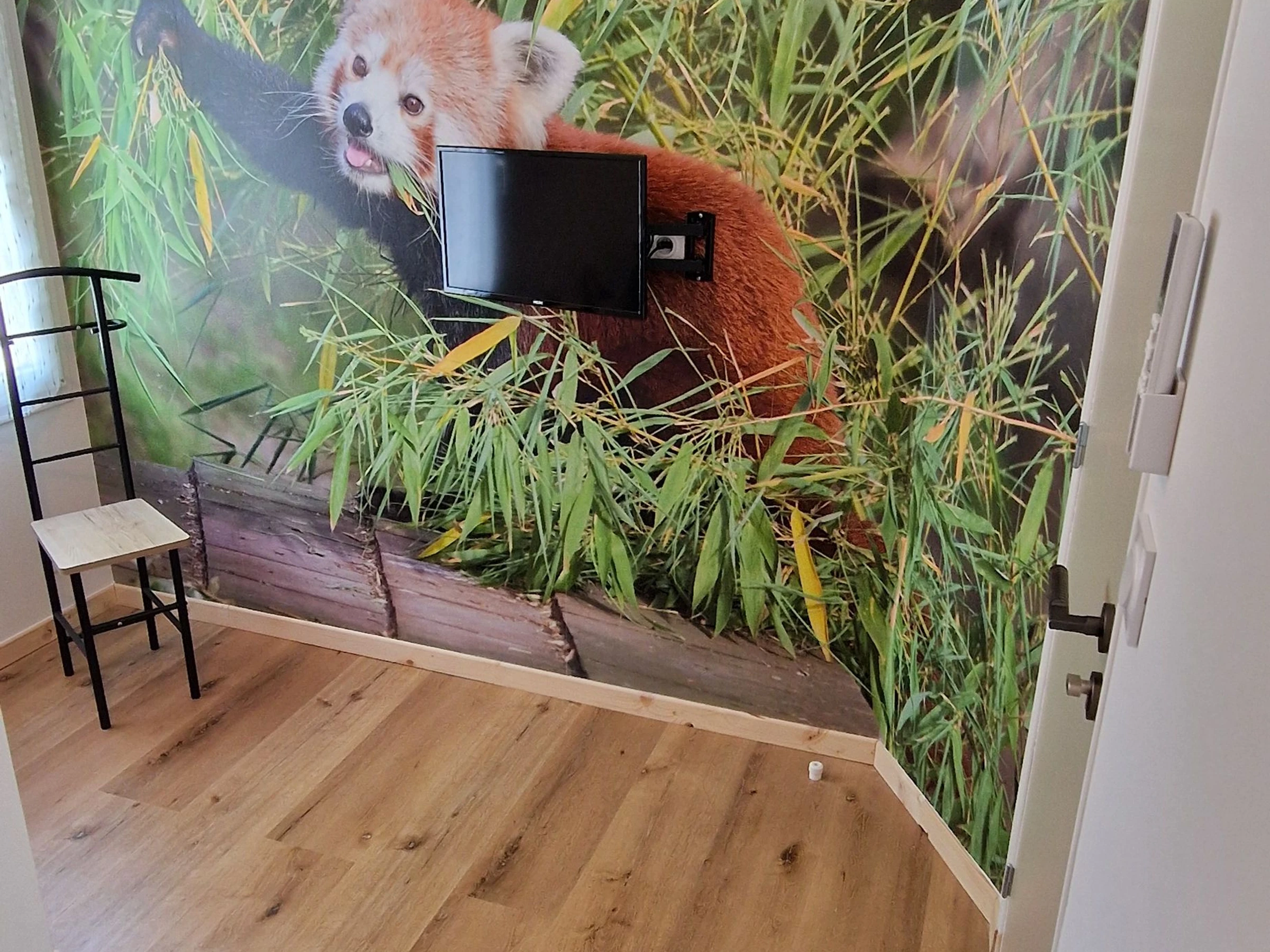 Une chambre (tapisserie panda roux) avec un lit 140 cm x 200 cm