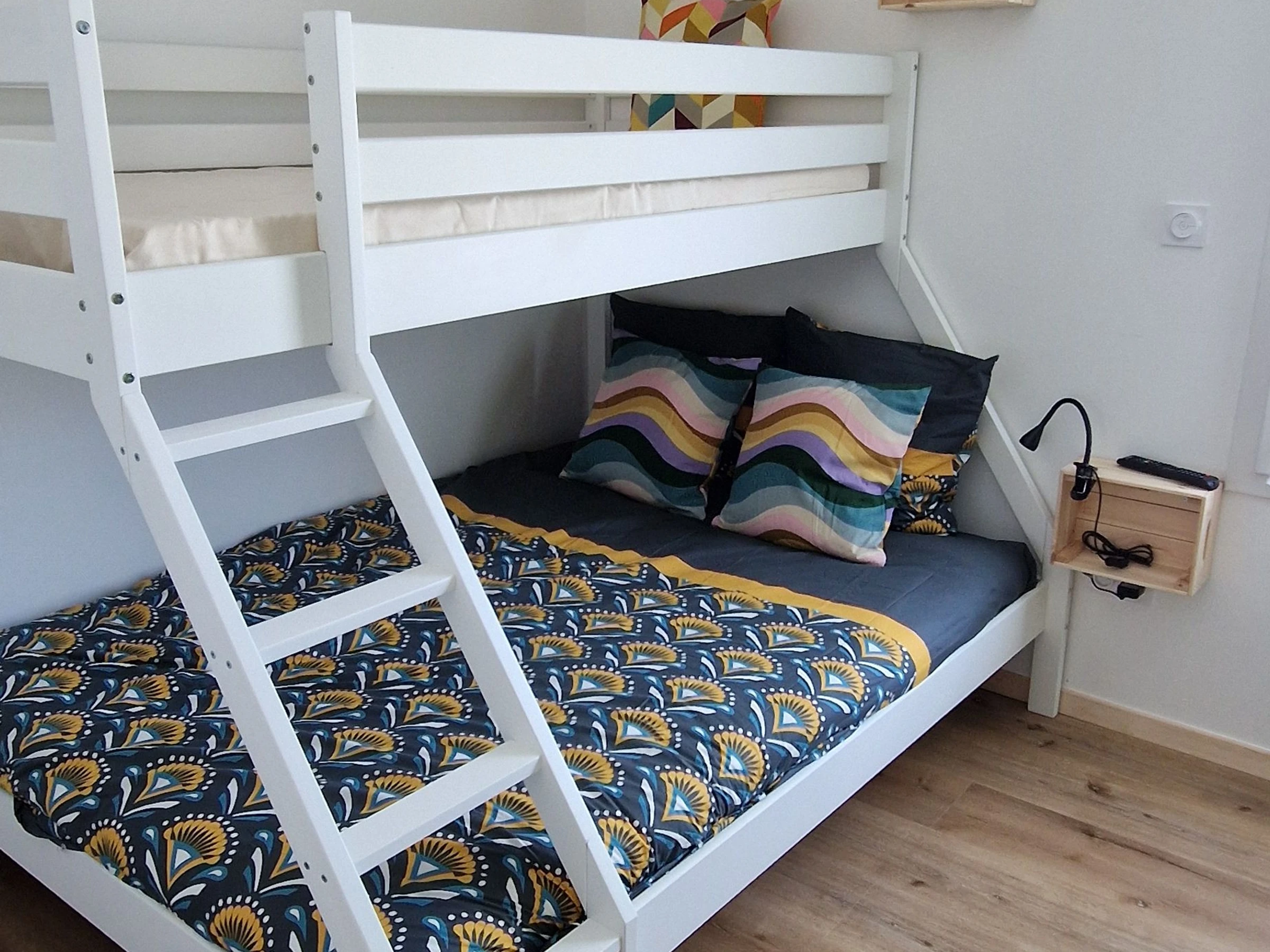 Une chambre (tapisserie lionceau) avec un lit de 140 cm x 200 cm et un lit 90 cm x 200 cm en mezzanine.