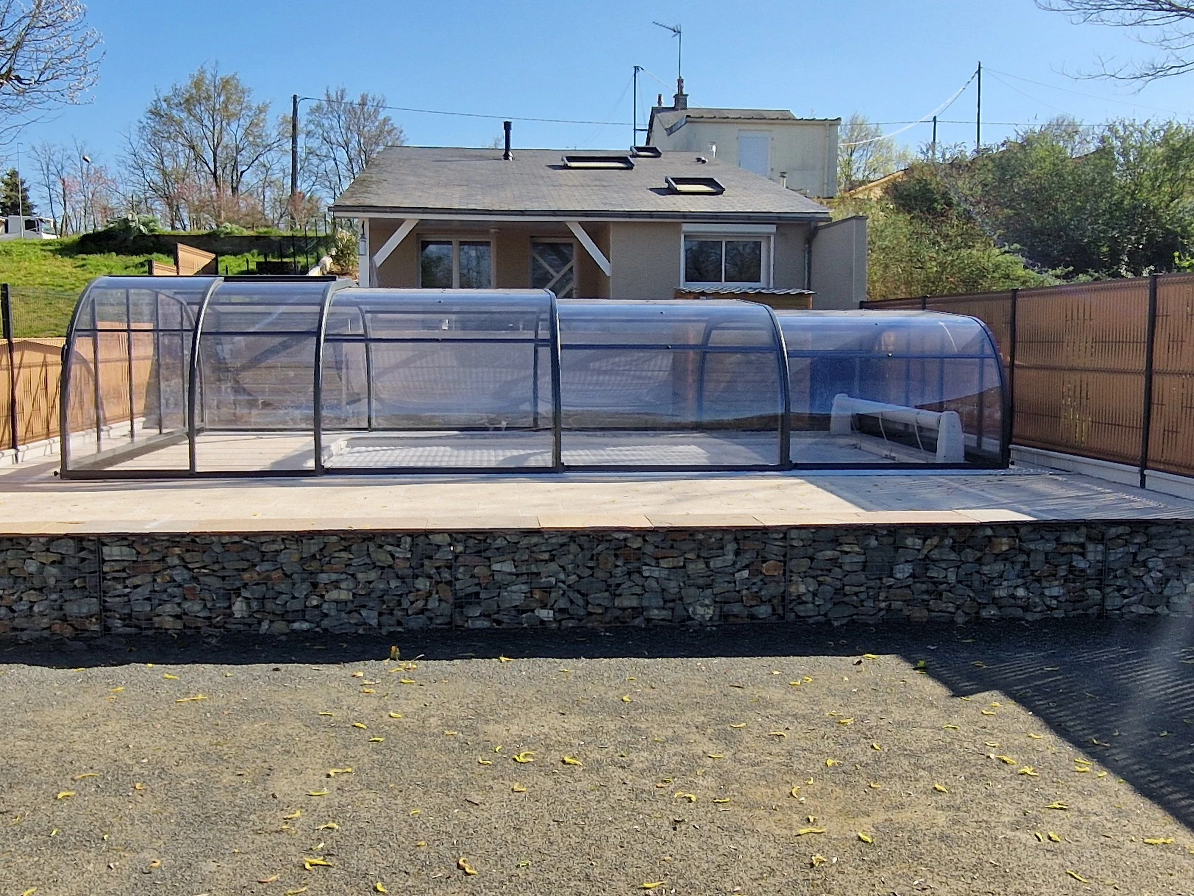 La piscine possède un rideau électrique plus un abri télescopique d’1m80 pour pouvoir être au chaud si la météo est mitigée. Une belle terrasse tout autour avec des transats.