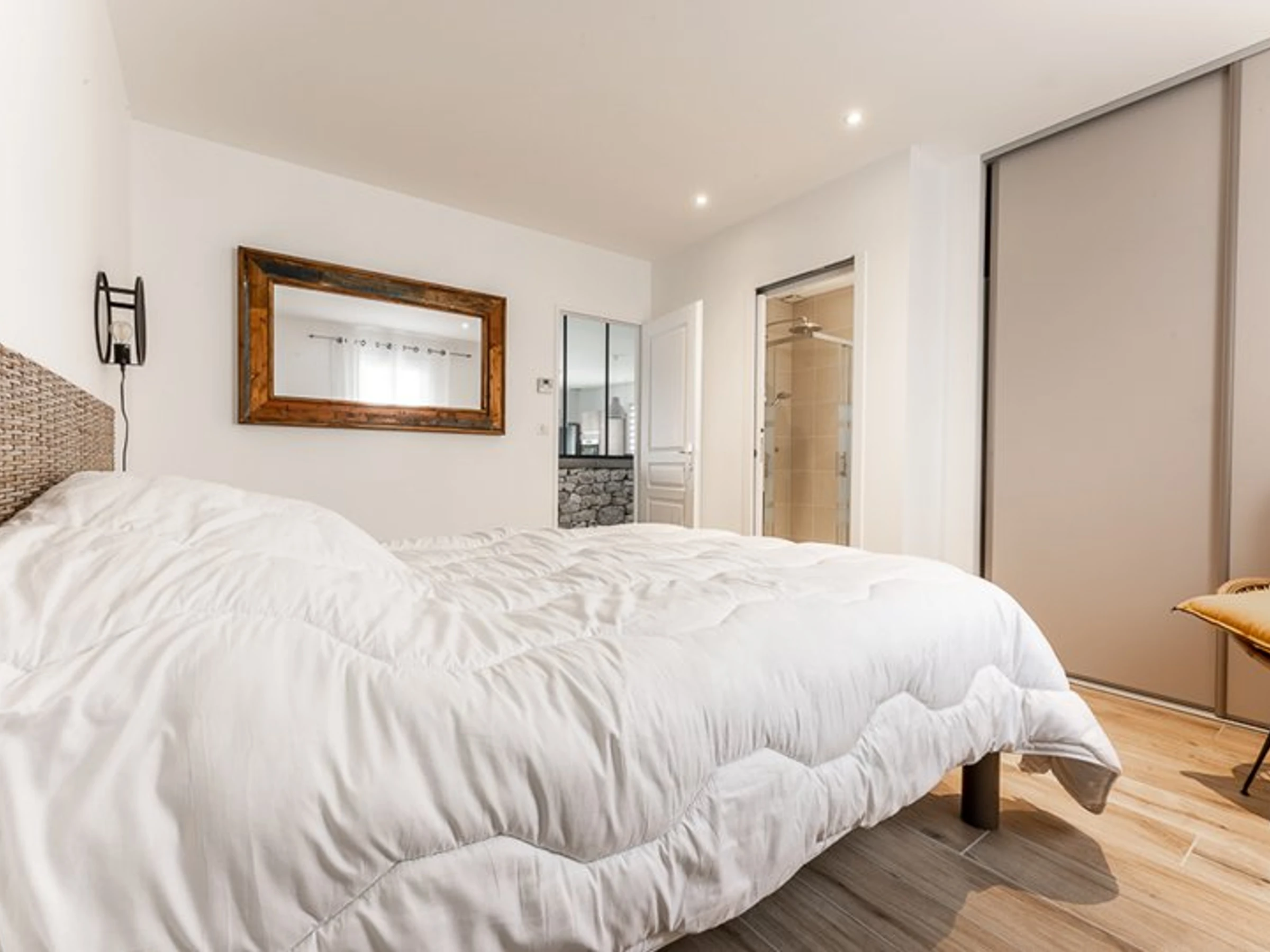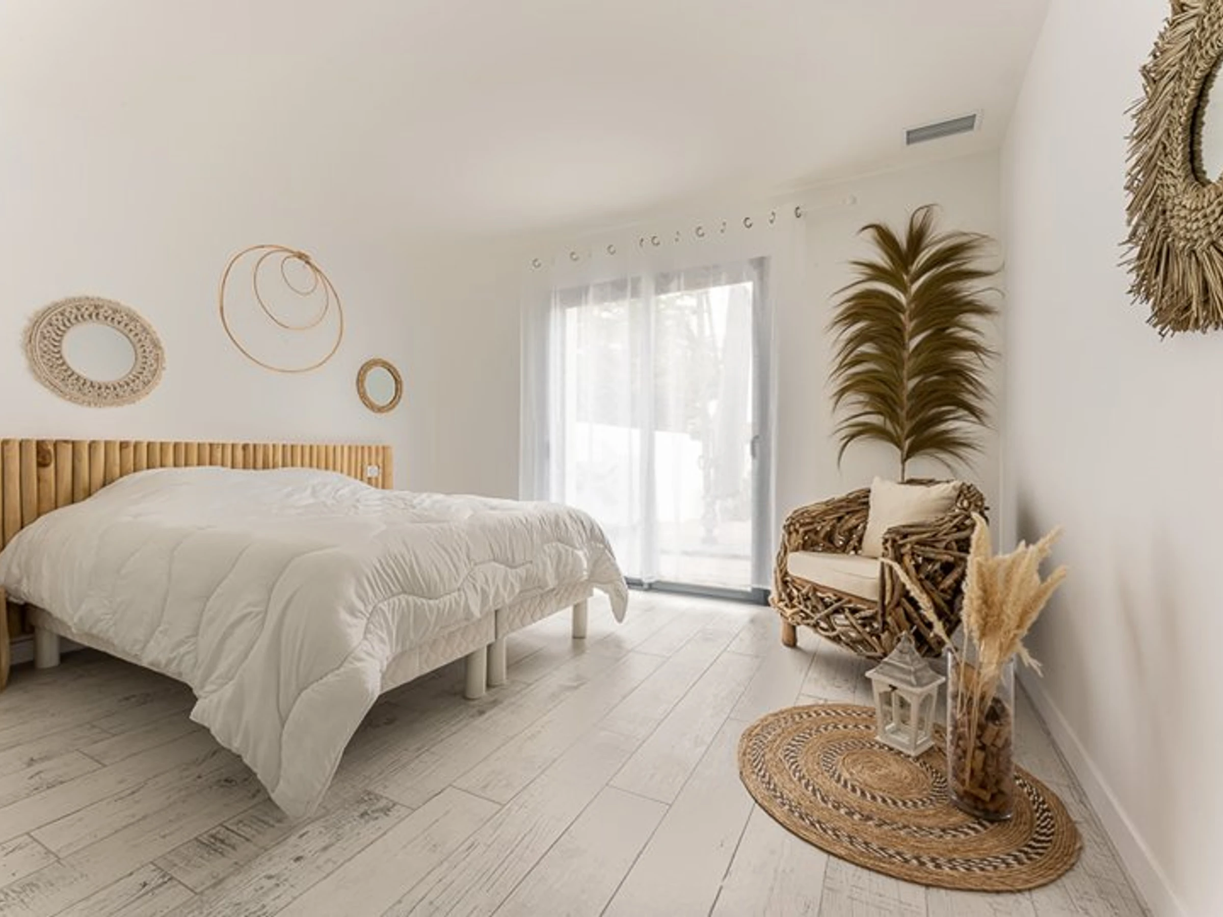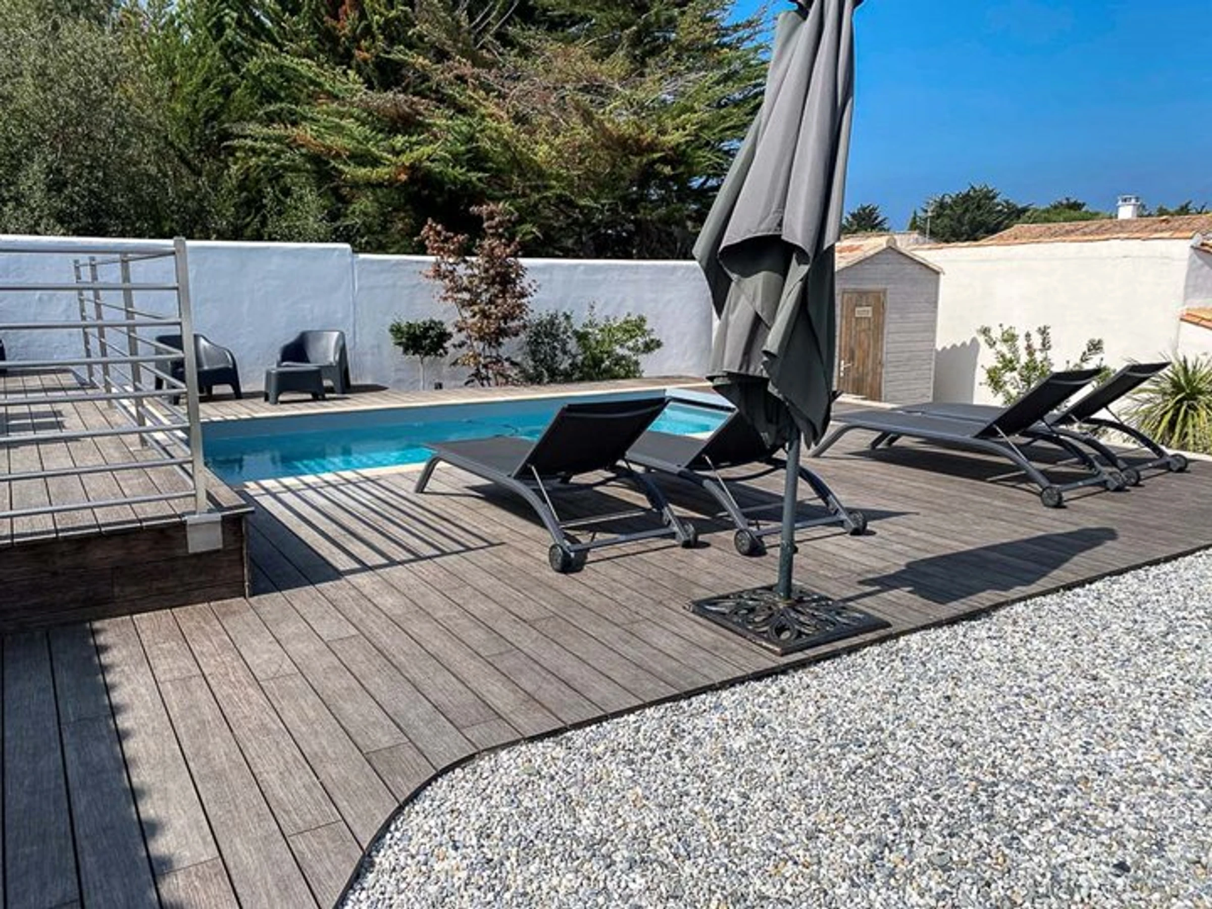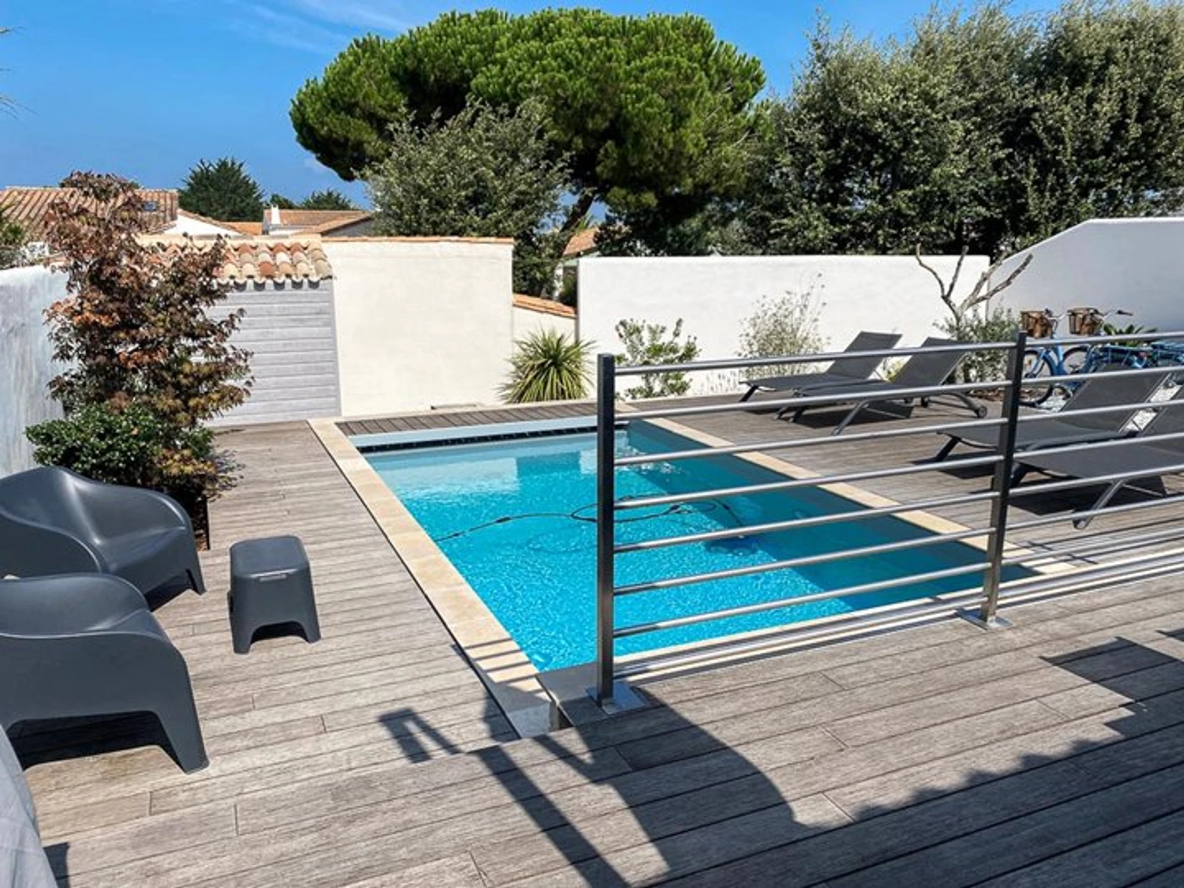 Vous apprécierez la terrasse en bois d’une superficie de 32m² , accessible directement depuis le séjour. Elle est équipée d’une plancha électrique pour vos repas en extérieur et de bains de soleil pour profiter de la piscine ensoleillée.