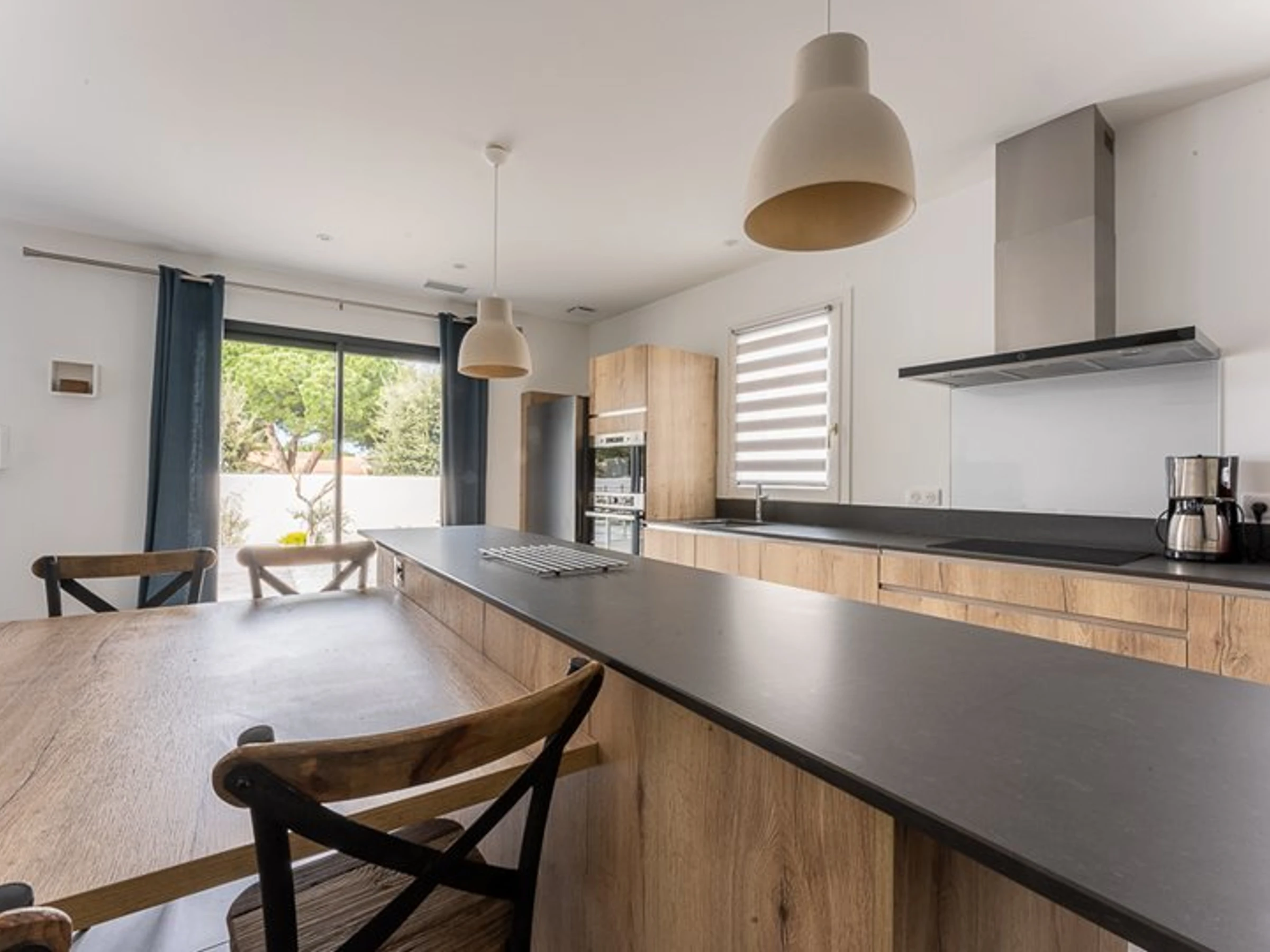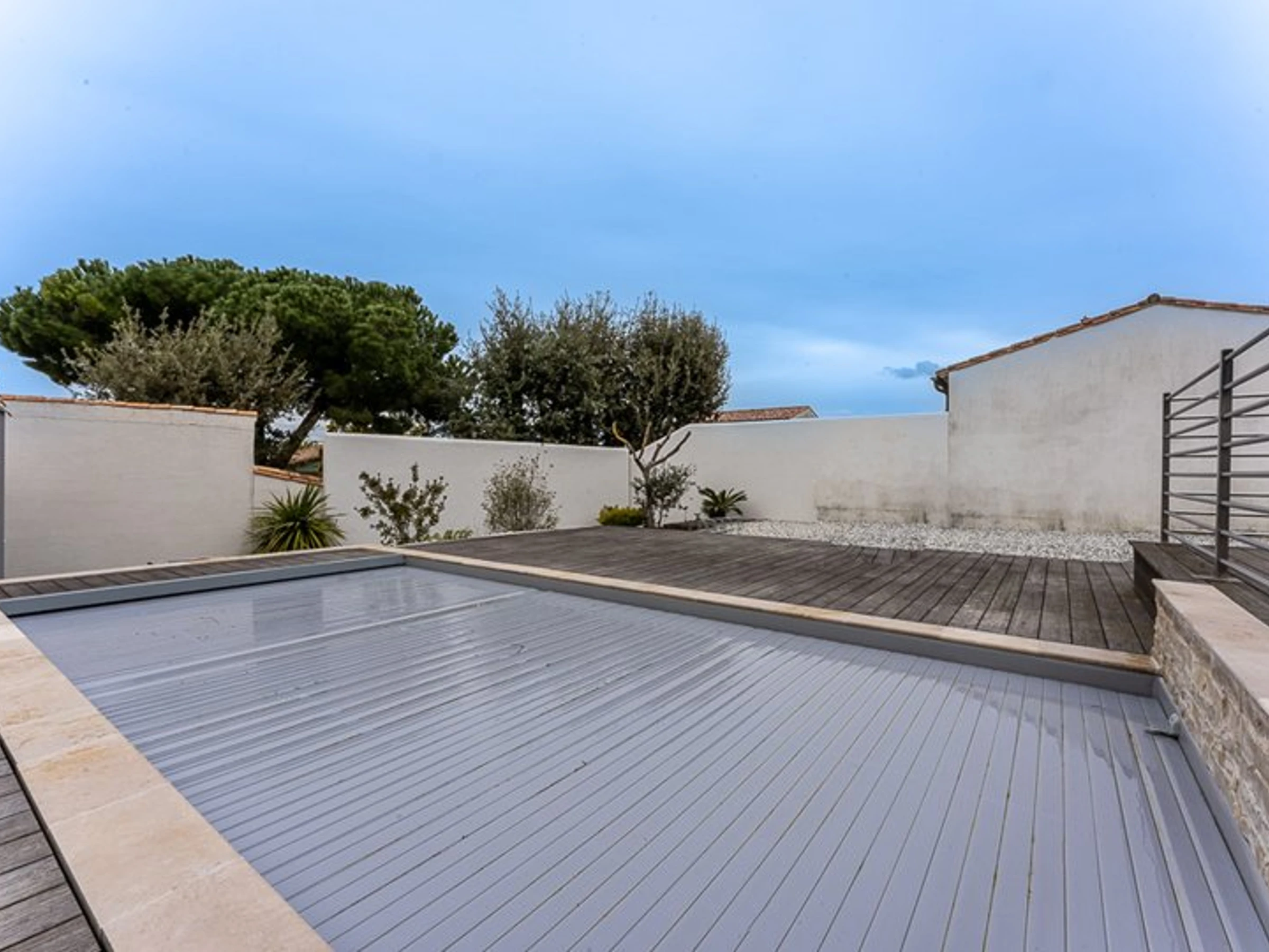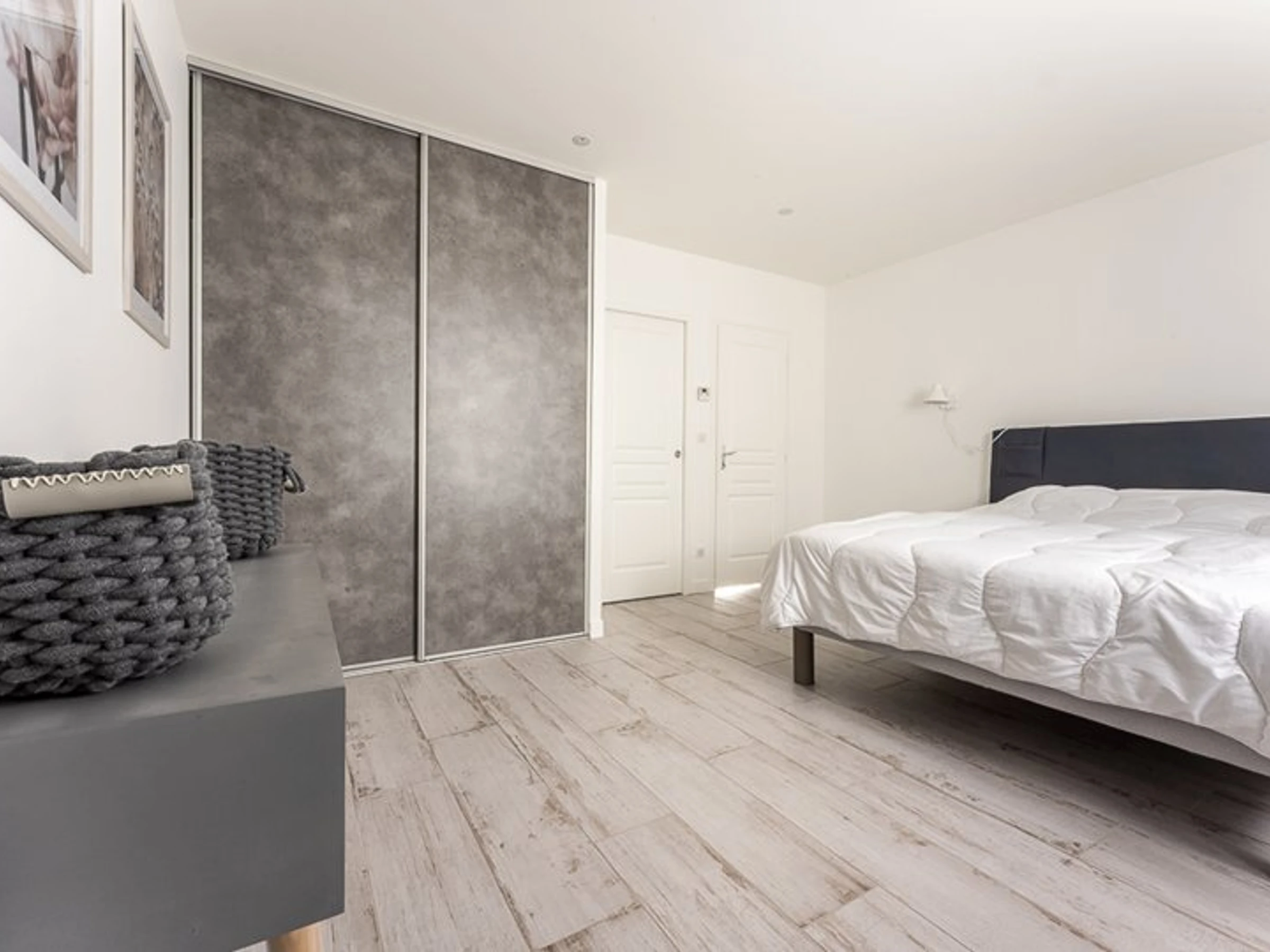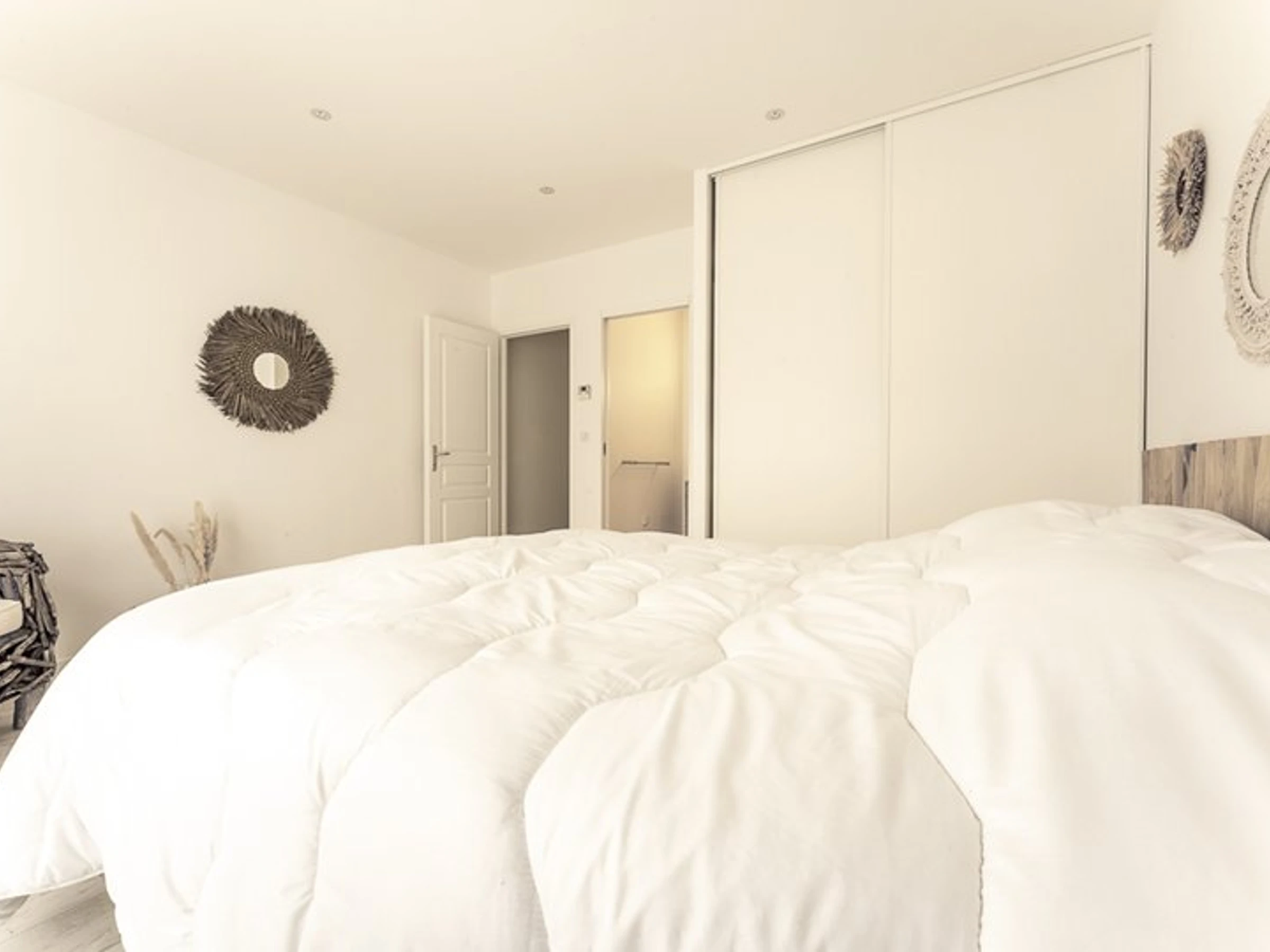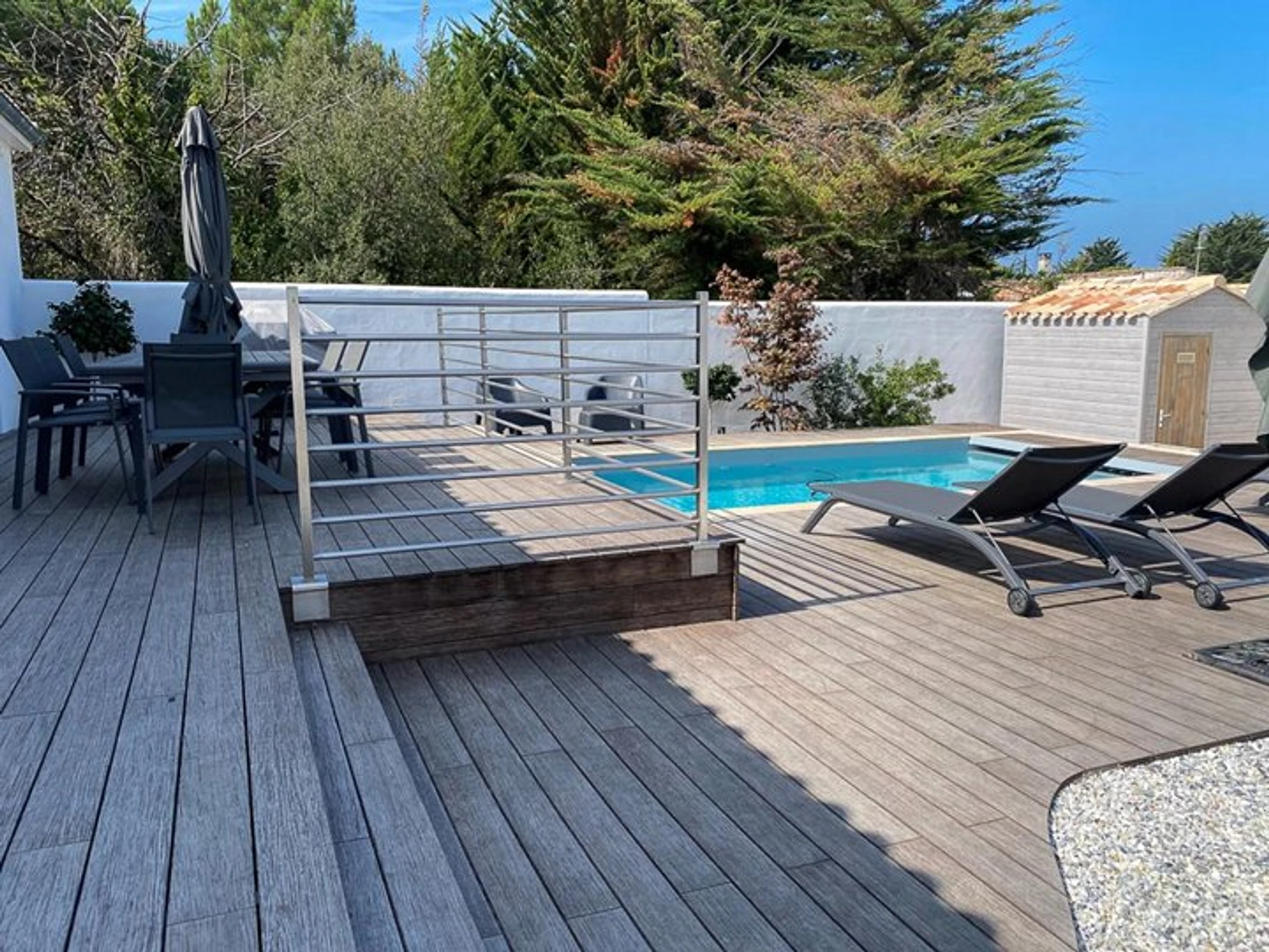 Vous apprécierez la terrasse en bois d’une superficie de 32m² , accessible directement depuis le séjour. Elle est équipée d’une plancha électrique pour vos repas en extérieur et de bains de soleil pour profiter de la piscine ensoleillée.