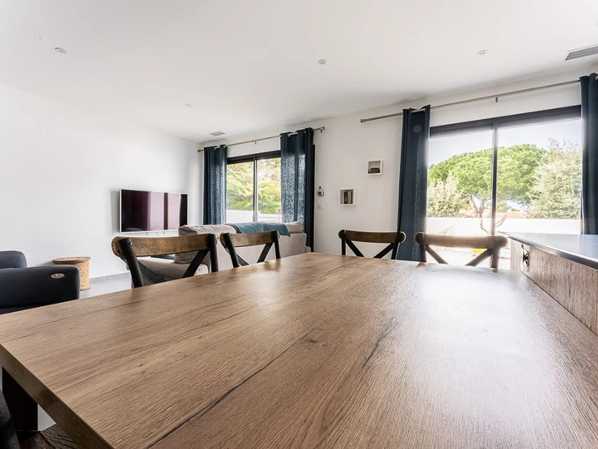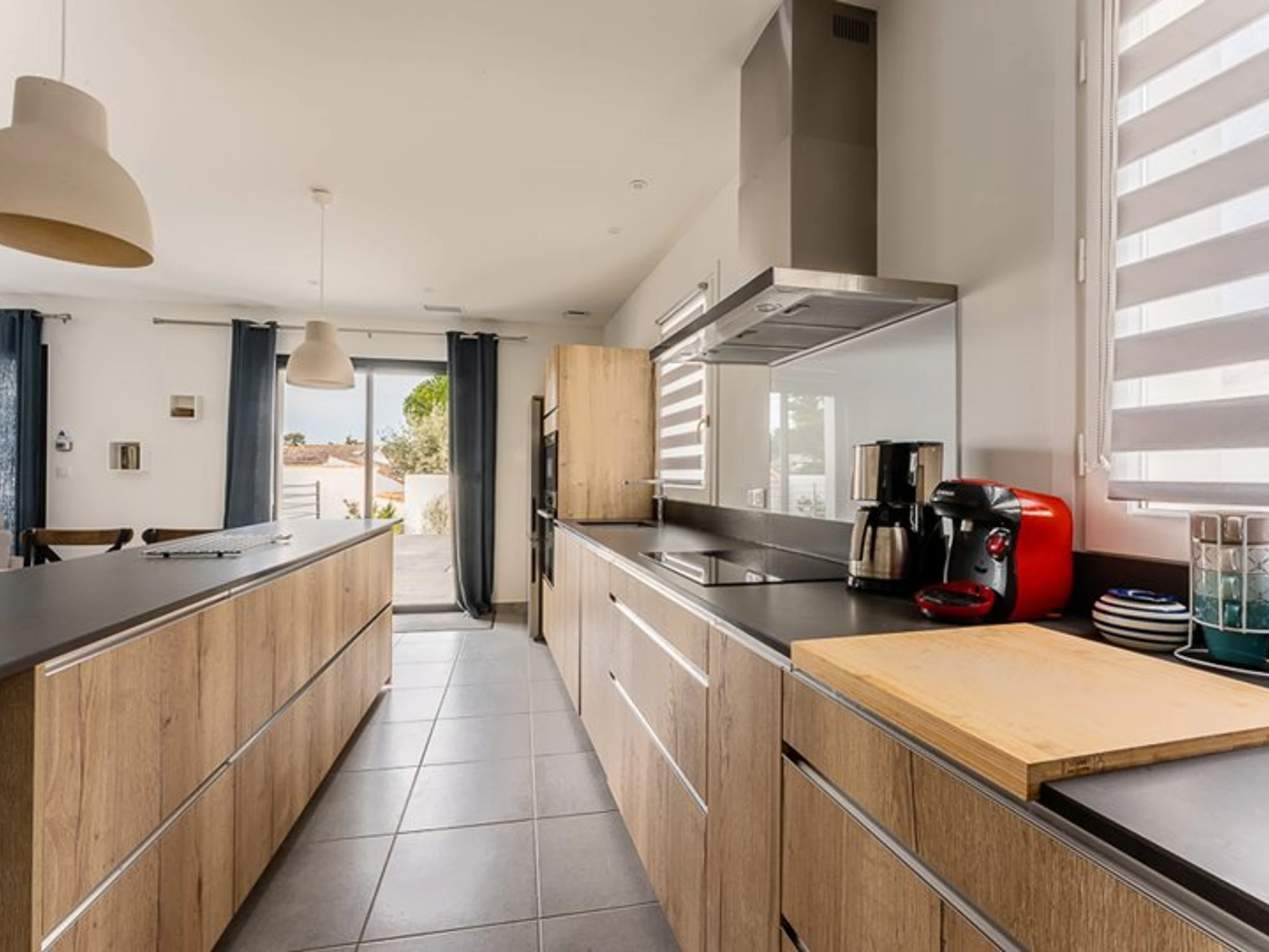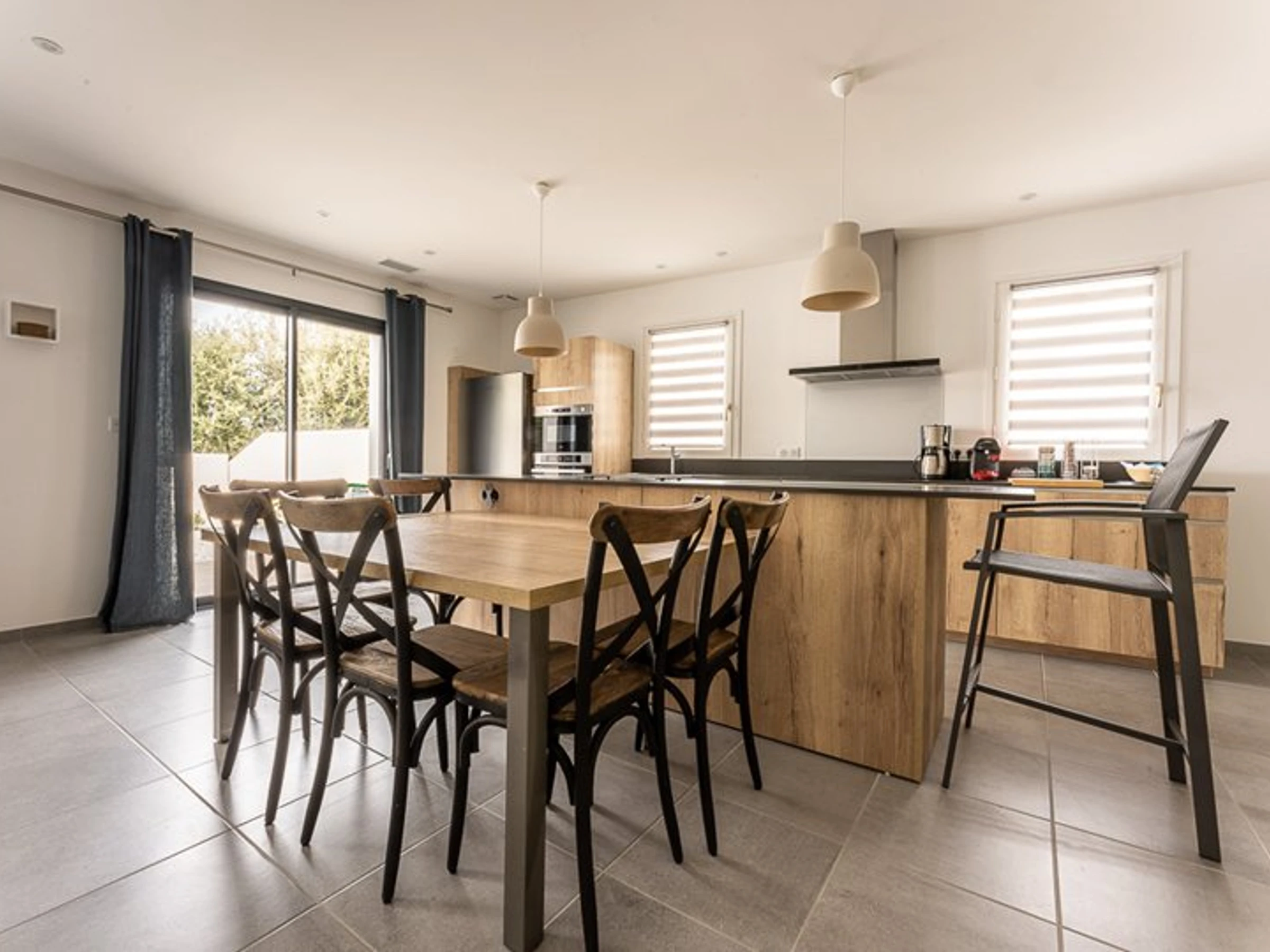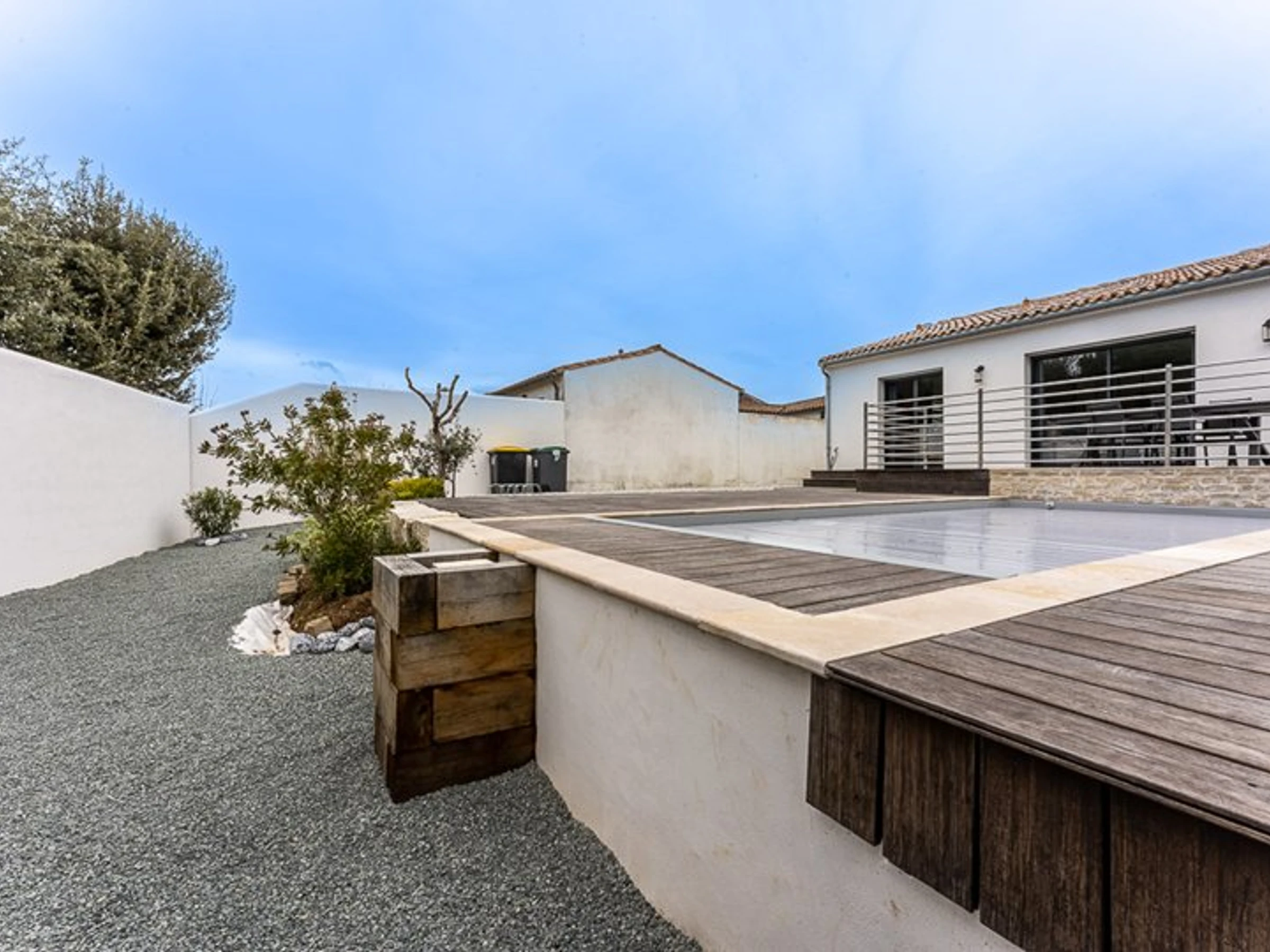 Vous apprécierez la terrasse en bois d’une superficie de 32m² , accessible directement depuis le séjour. Elle est équipée d’une plancha électrique pour vos repas en extérieur et de bains de soleil pour profiter de la piscine ensoleillée.