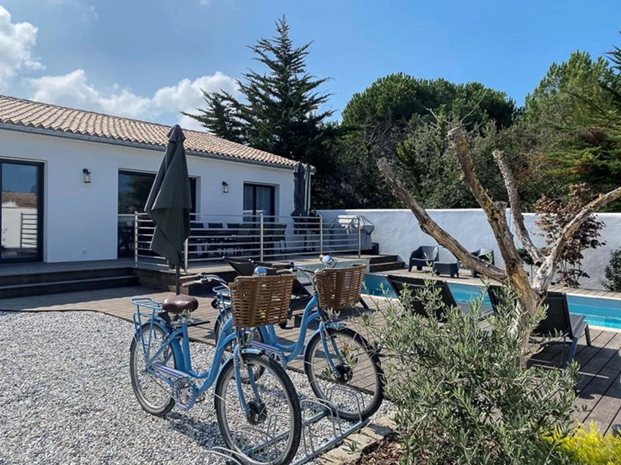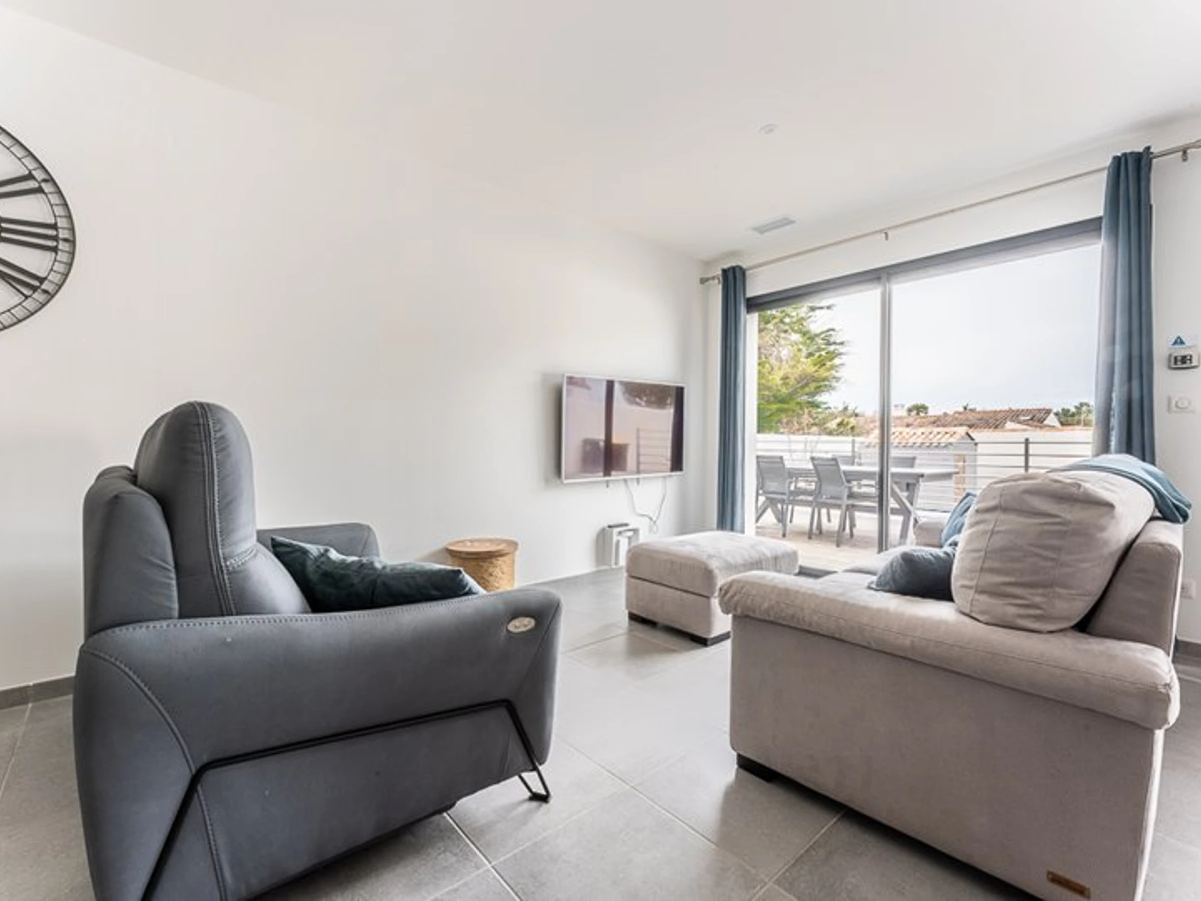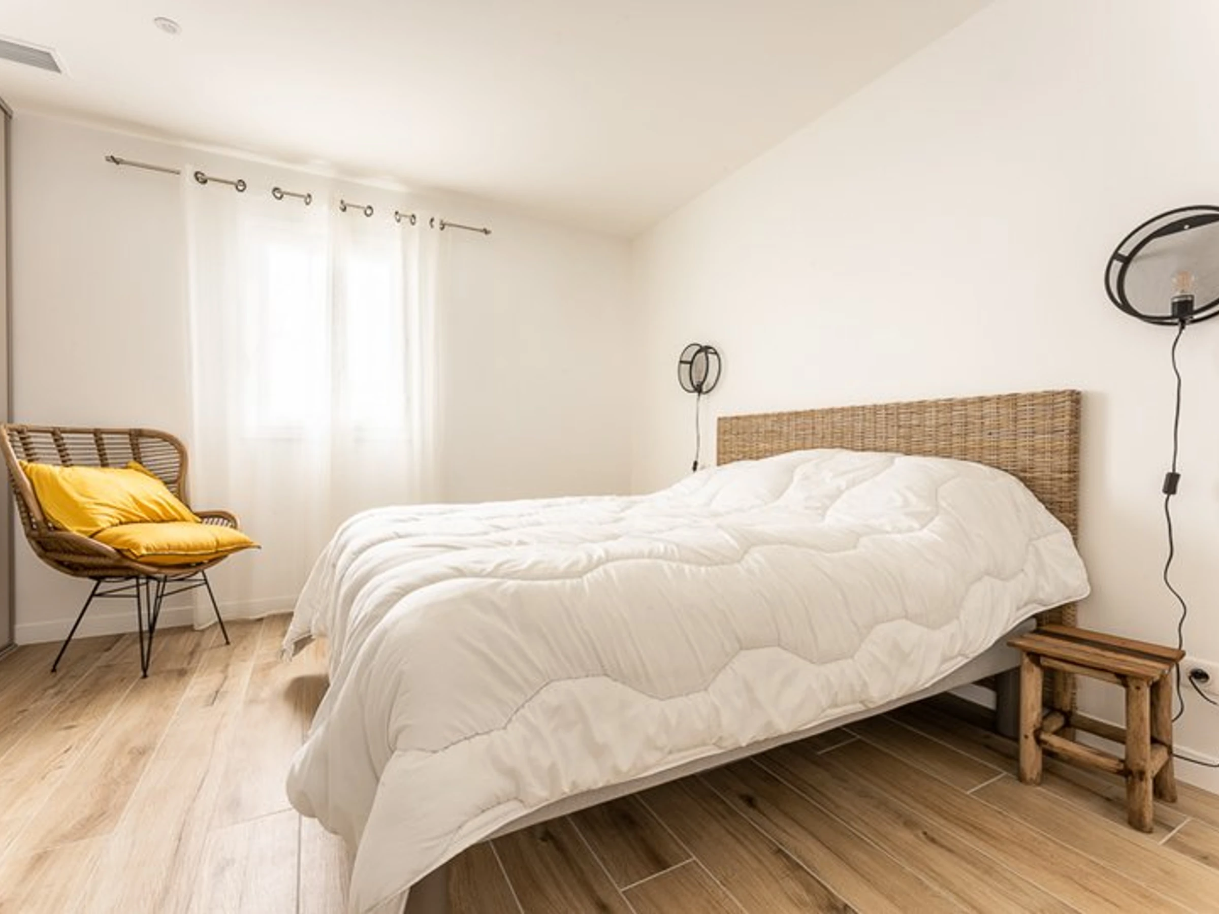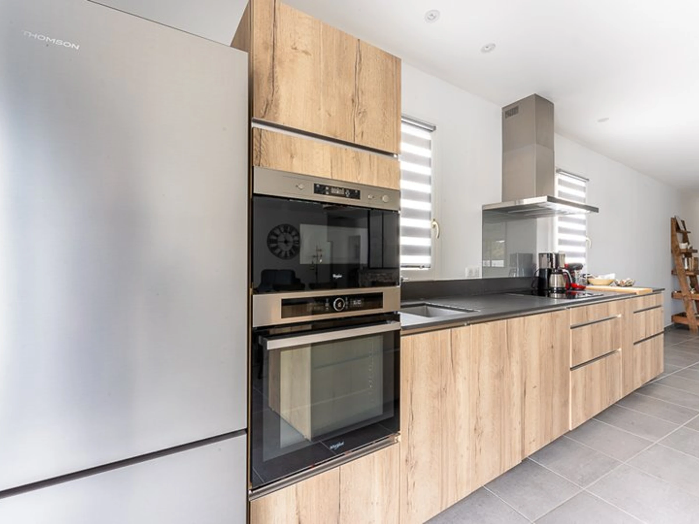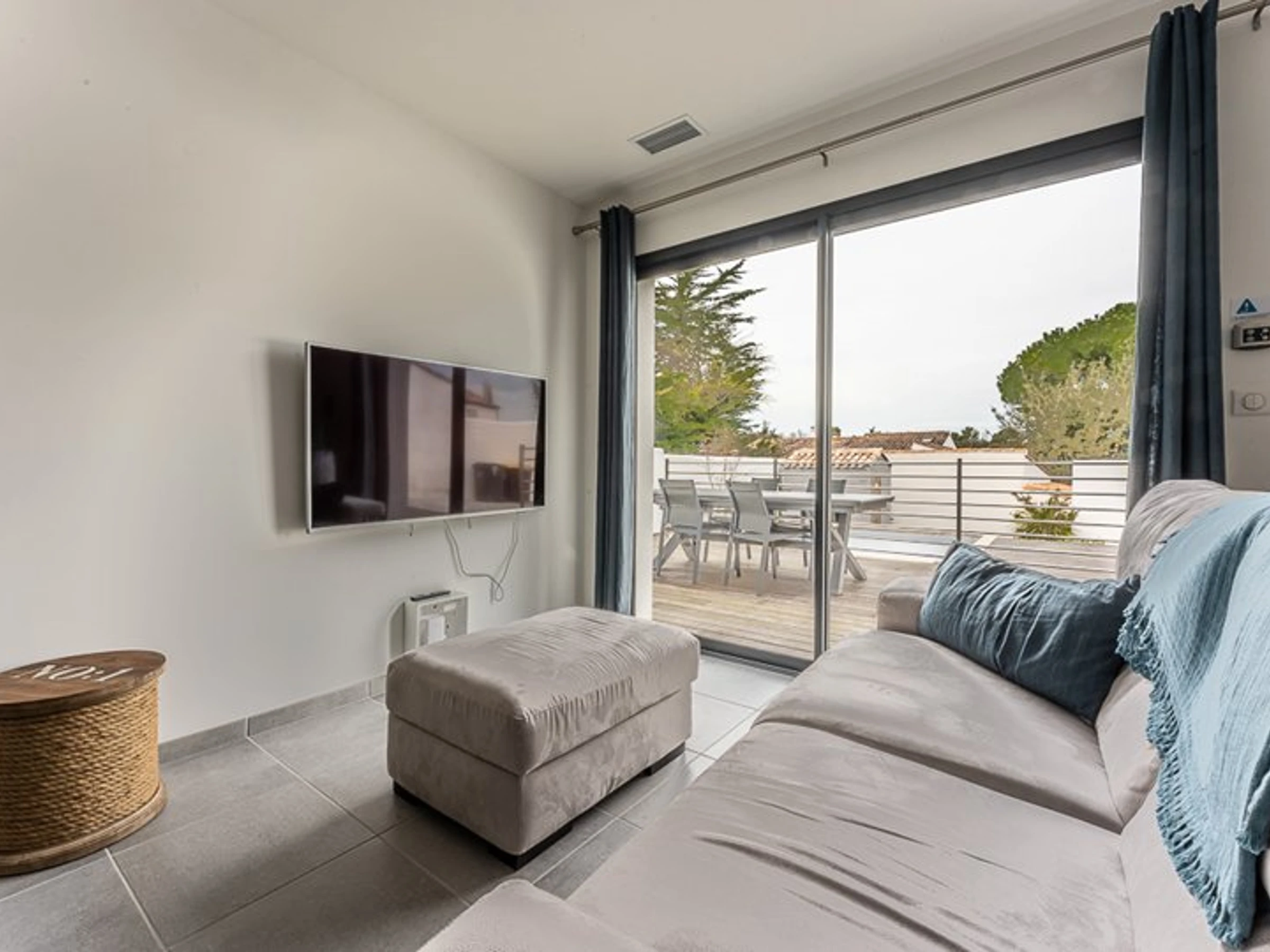 Vous apprécierez la terrasse en bois d’une superficie de 32m² , accessible directement depuis le séjour. Elle est équipée d’une plancha électrique pour vos repas en extérieur et de bains de soleil pour profiter de la piscine ensoleillée.