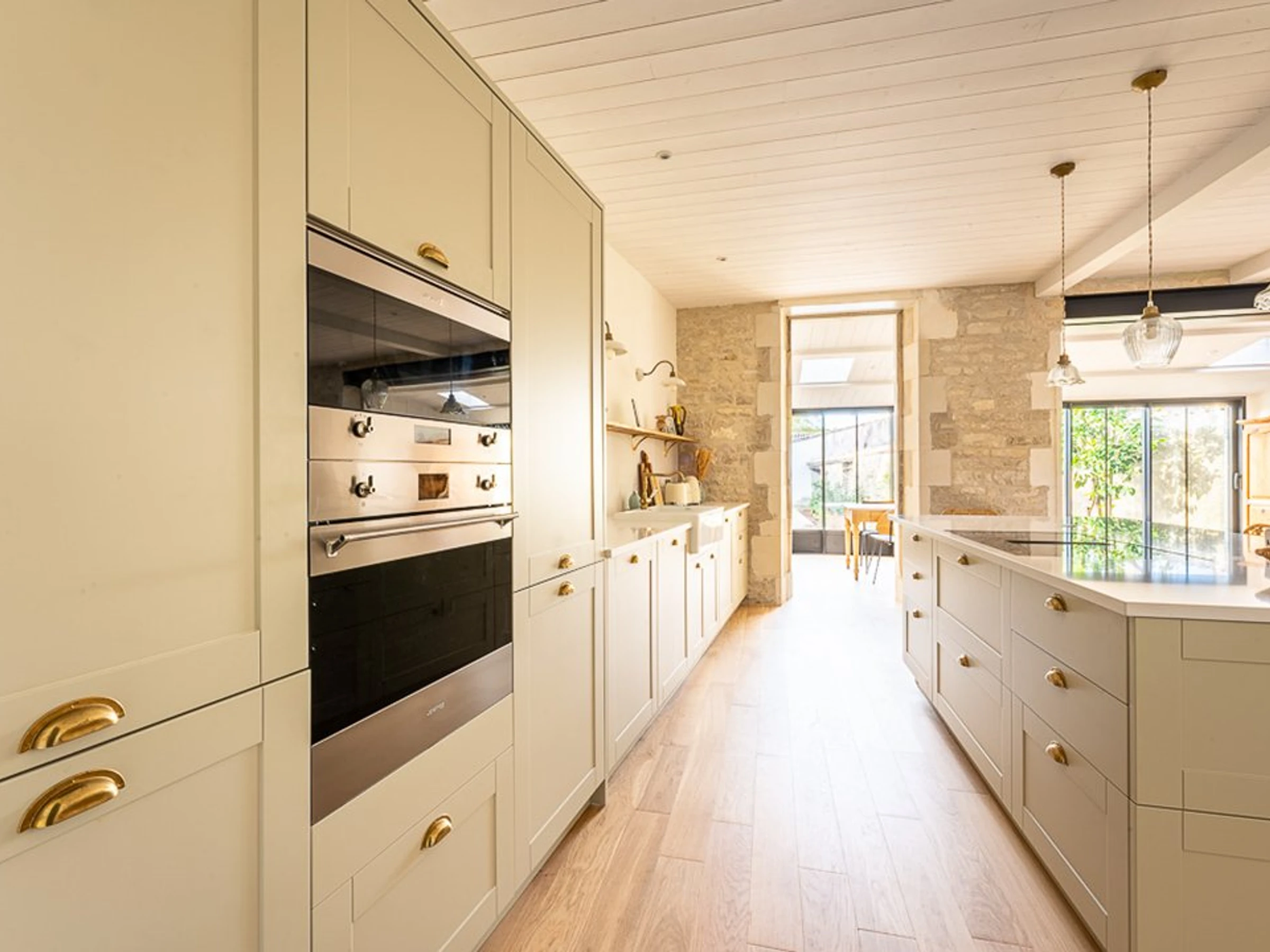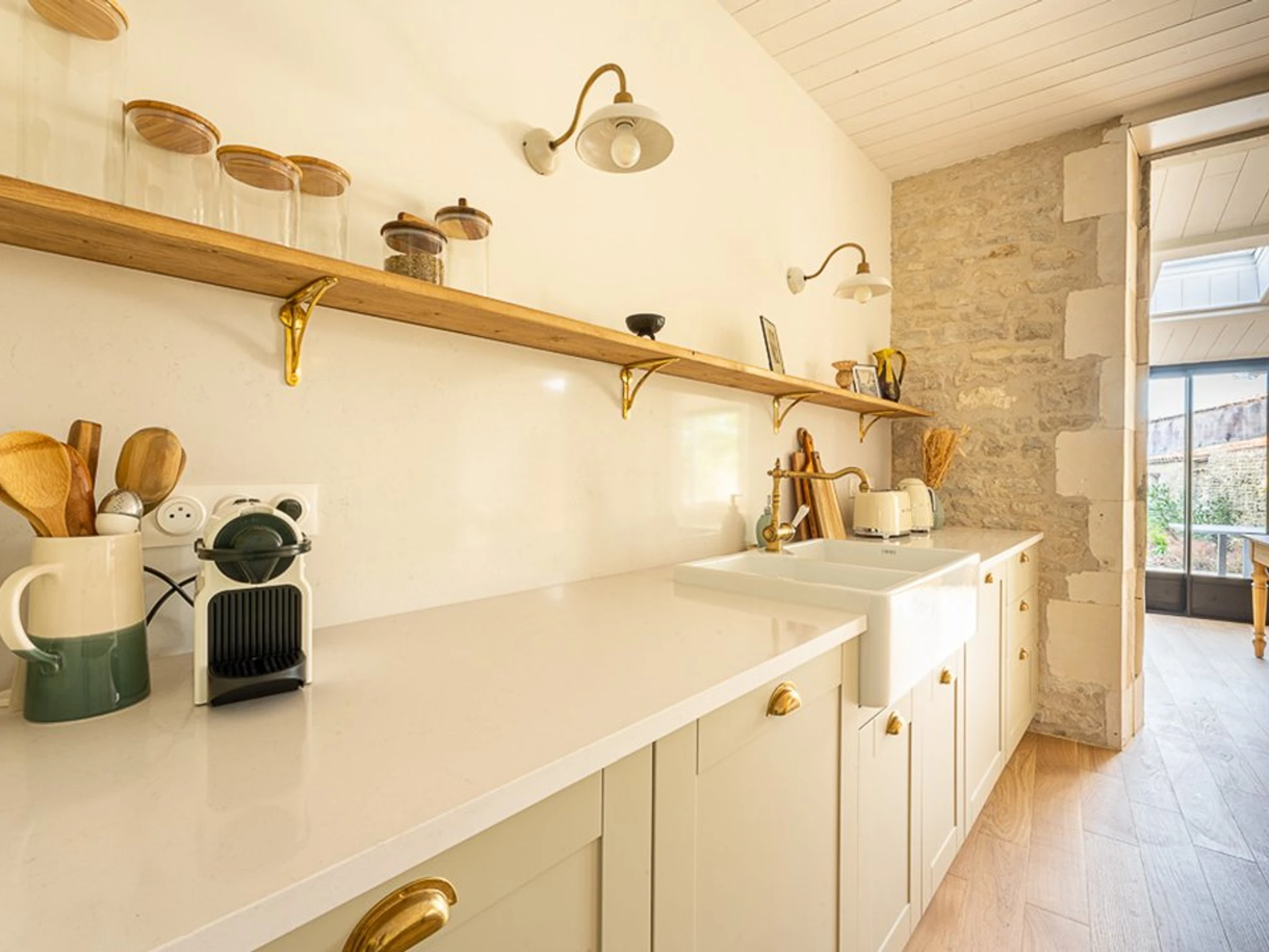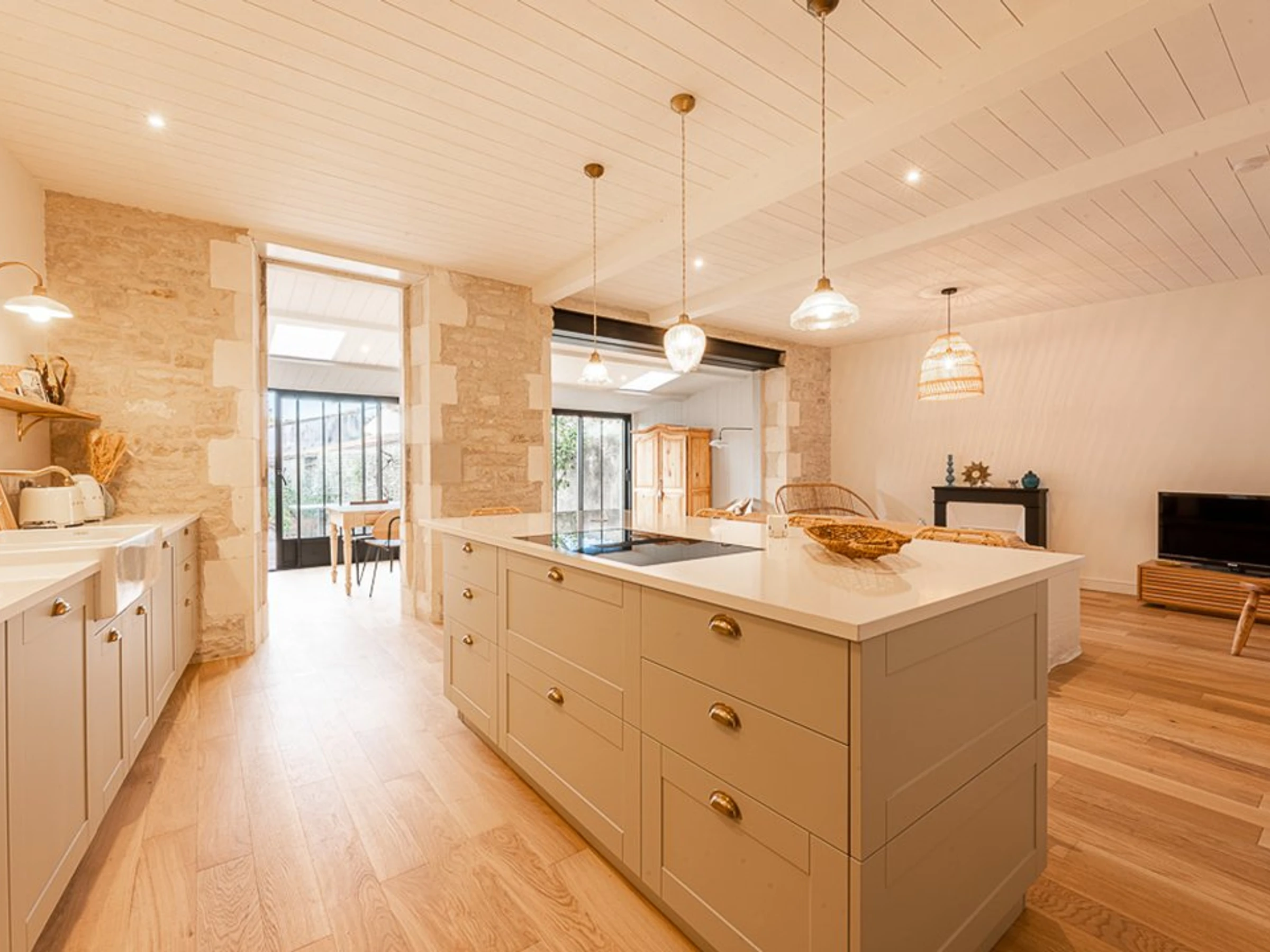 La cuisine, très bien équipée, dispose d’un îlot central, espace de convivialité, elle est ouverte sur le salon.