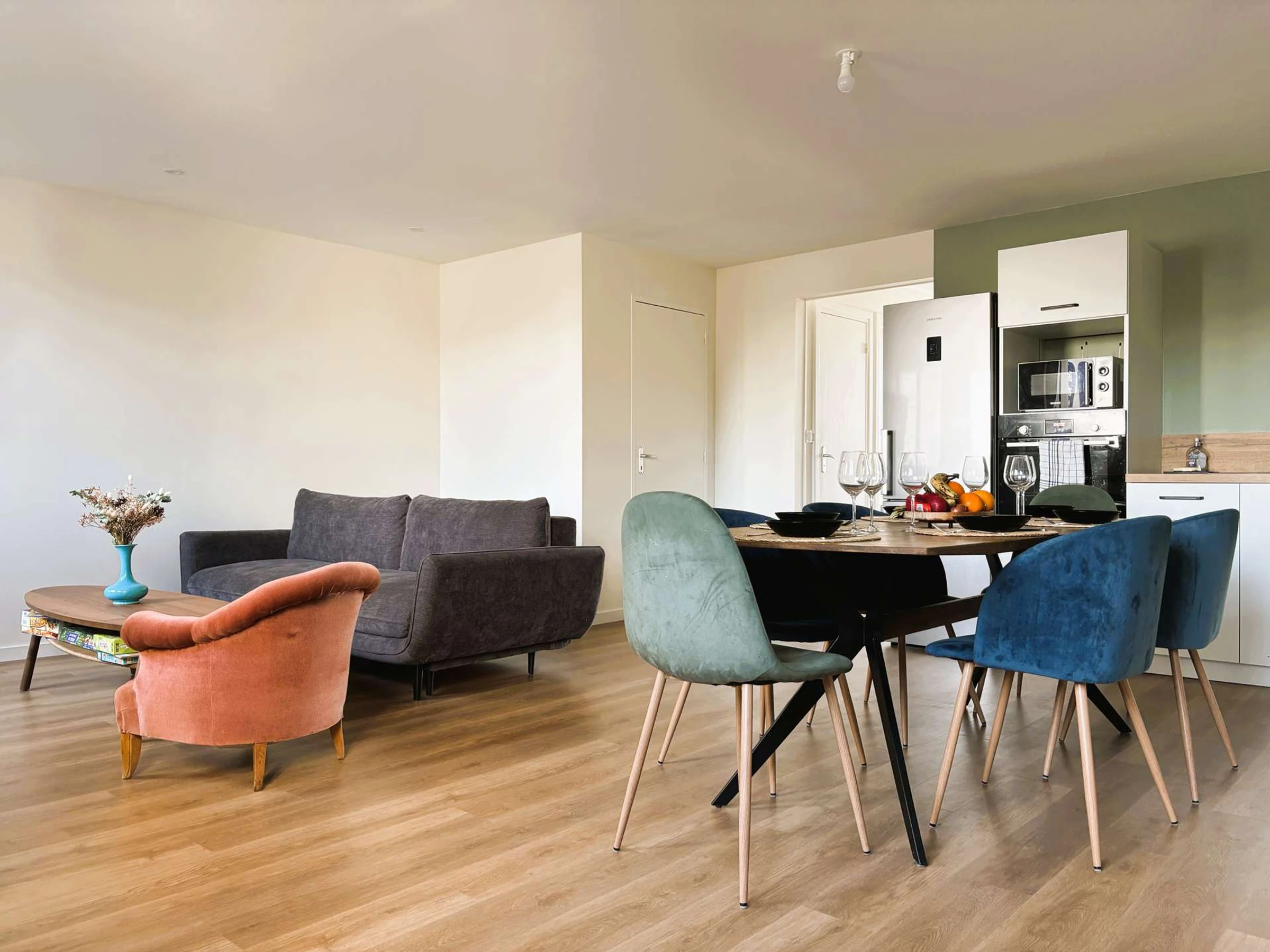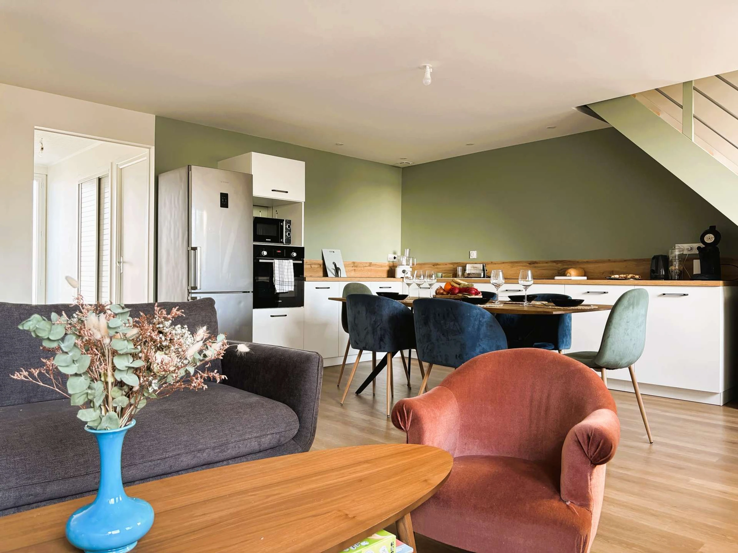 - Une belle pièce de vie conviviale comprenant un salon, un espace repas et une cuisine ouverte entièrement équipée