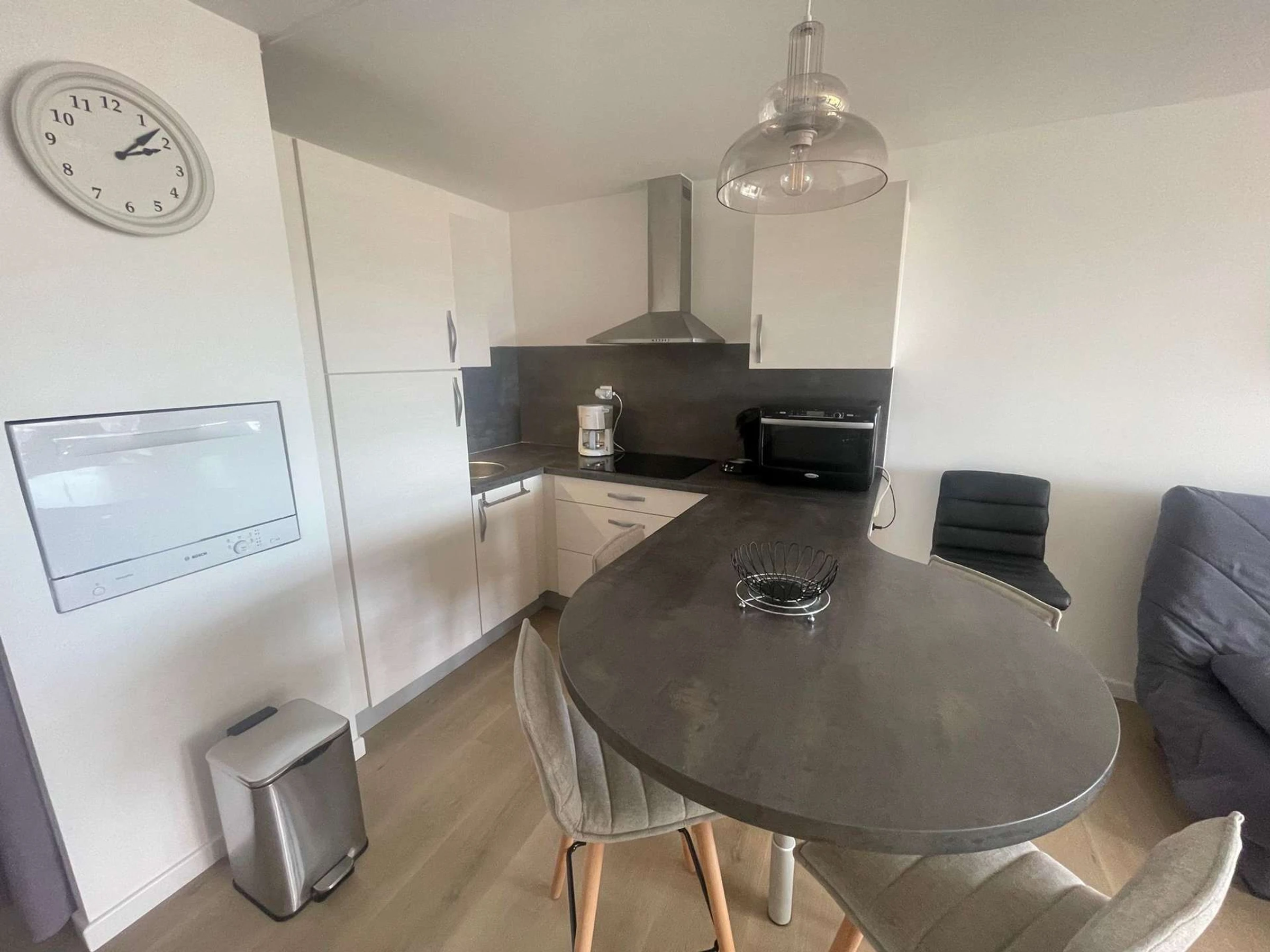 Deux pièces cabine 5 personnes 44m² + loggia 12m², 2ème étage avec ascenseur exposé sud, petite vue mer, parking privé extérieur.
