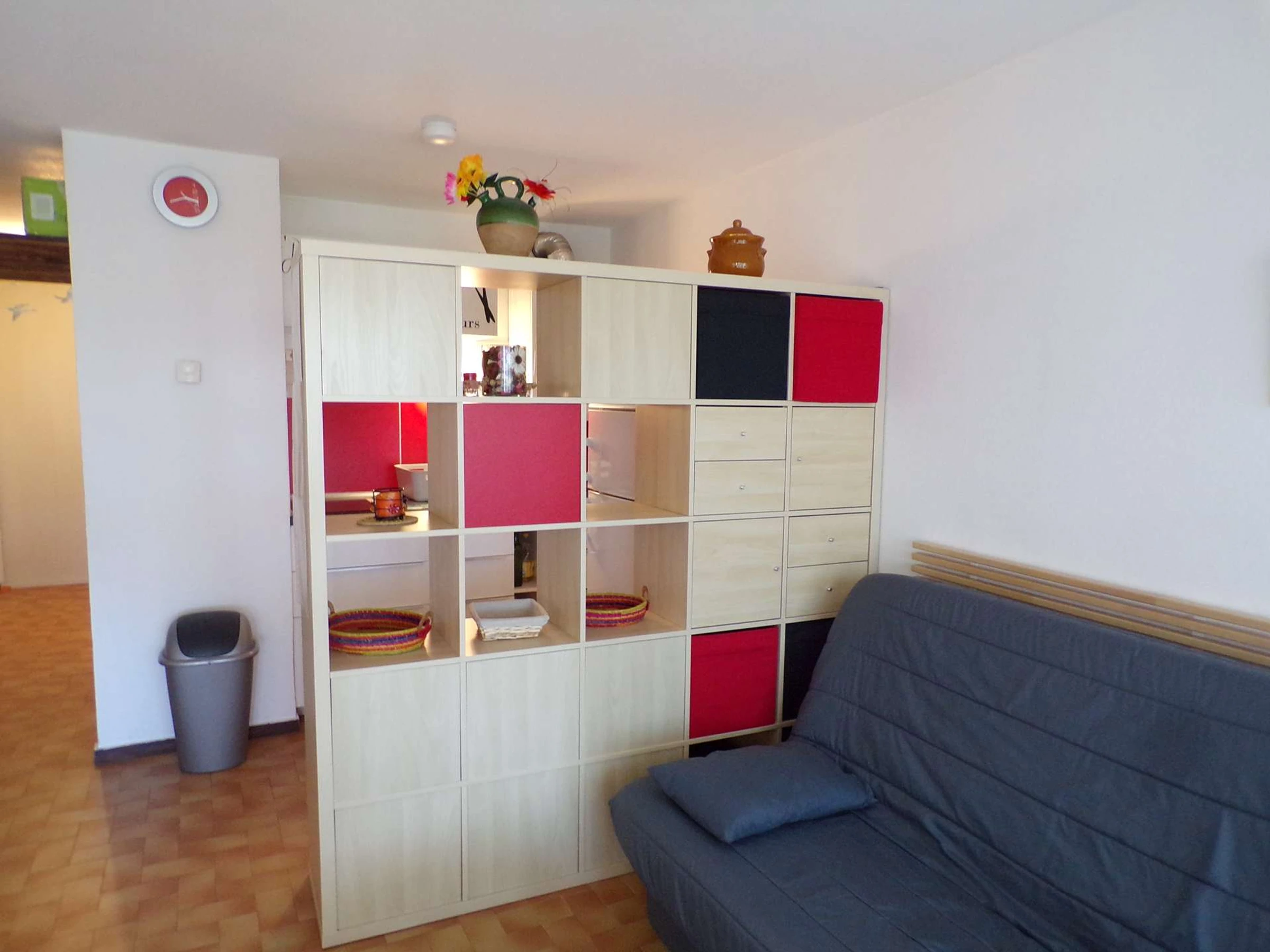 Cuisinette dans le séjour, salle de bain avec wc.