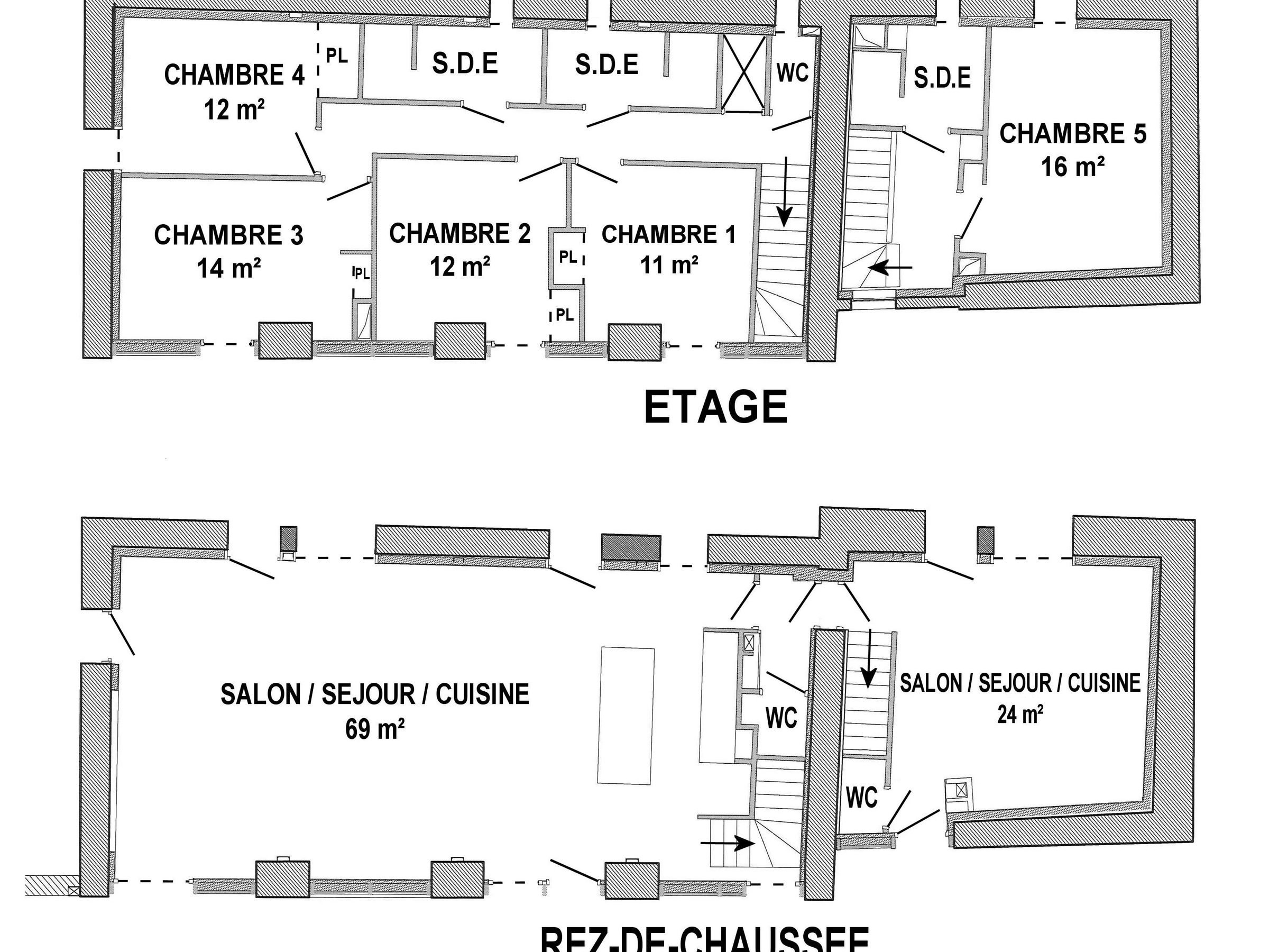 Etages : 2 chambres avec lit 160x200, 2 chambres avec 2 lits 90x200, 1 chambre avec lit 160x200 + lit 90x200, 3 salles d'eau et 2 WC indépendants.