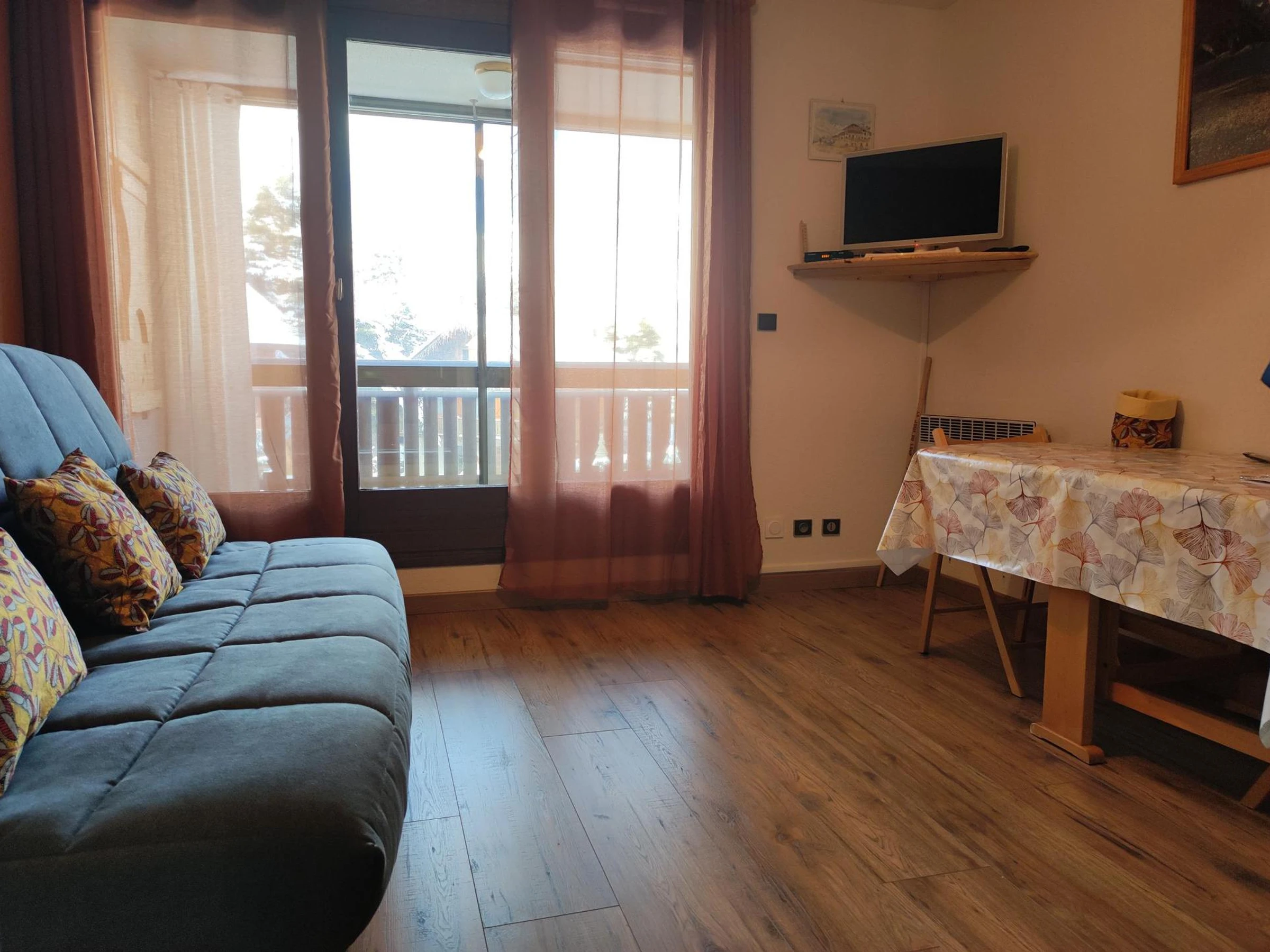 Pièce à vivre avec télévision, canapé-lit , coin repas. Véranda avec table à manger. Accès direct aux pistes