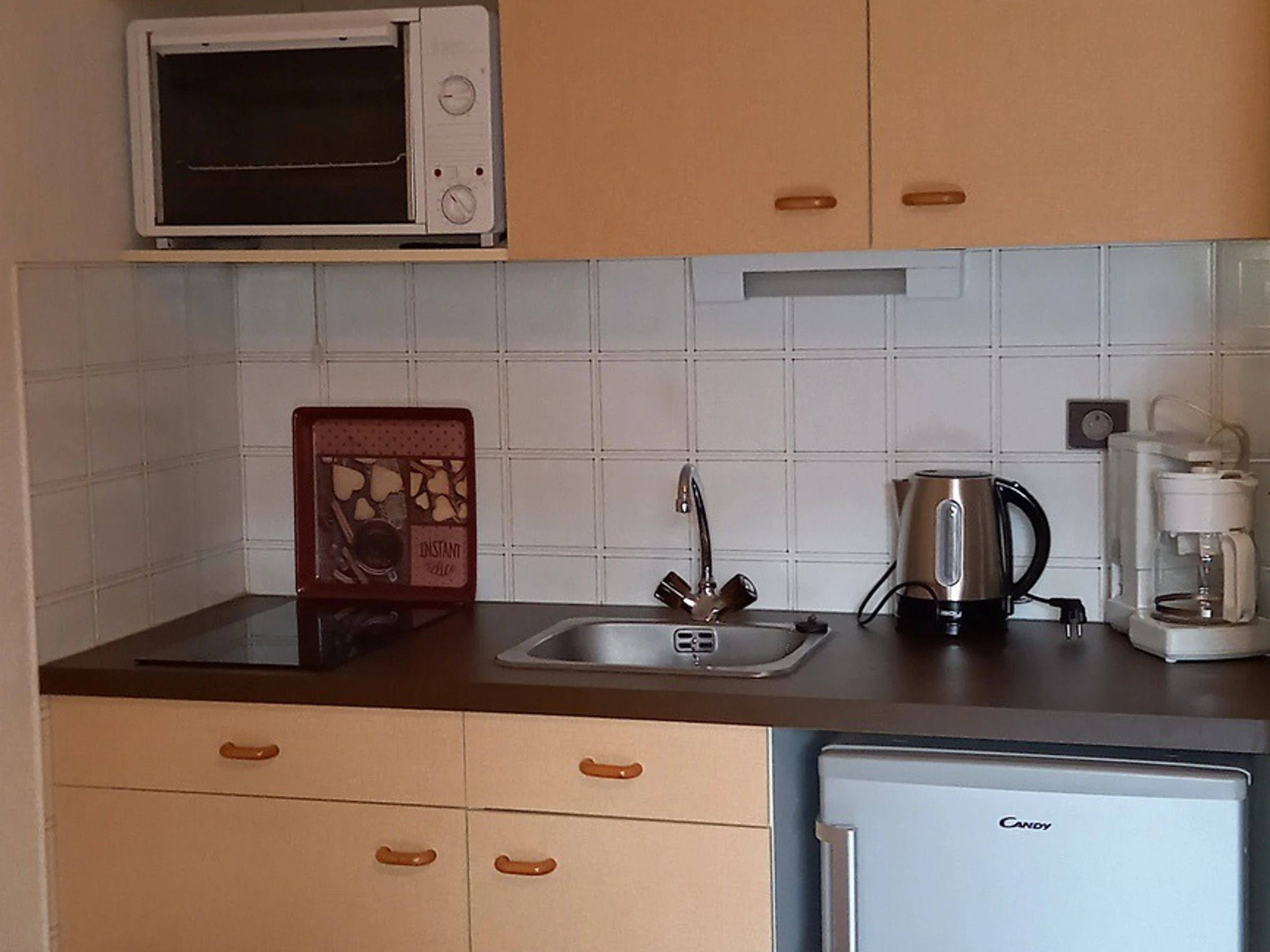 Coin cuisine équipée avec plaques vitro, réfrigérateur avec freezer, four micro-ondes, mini four, fait tout, cafetière à filtre, bouilloire, grille-pain, nécessaire de vaisselle.