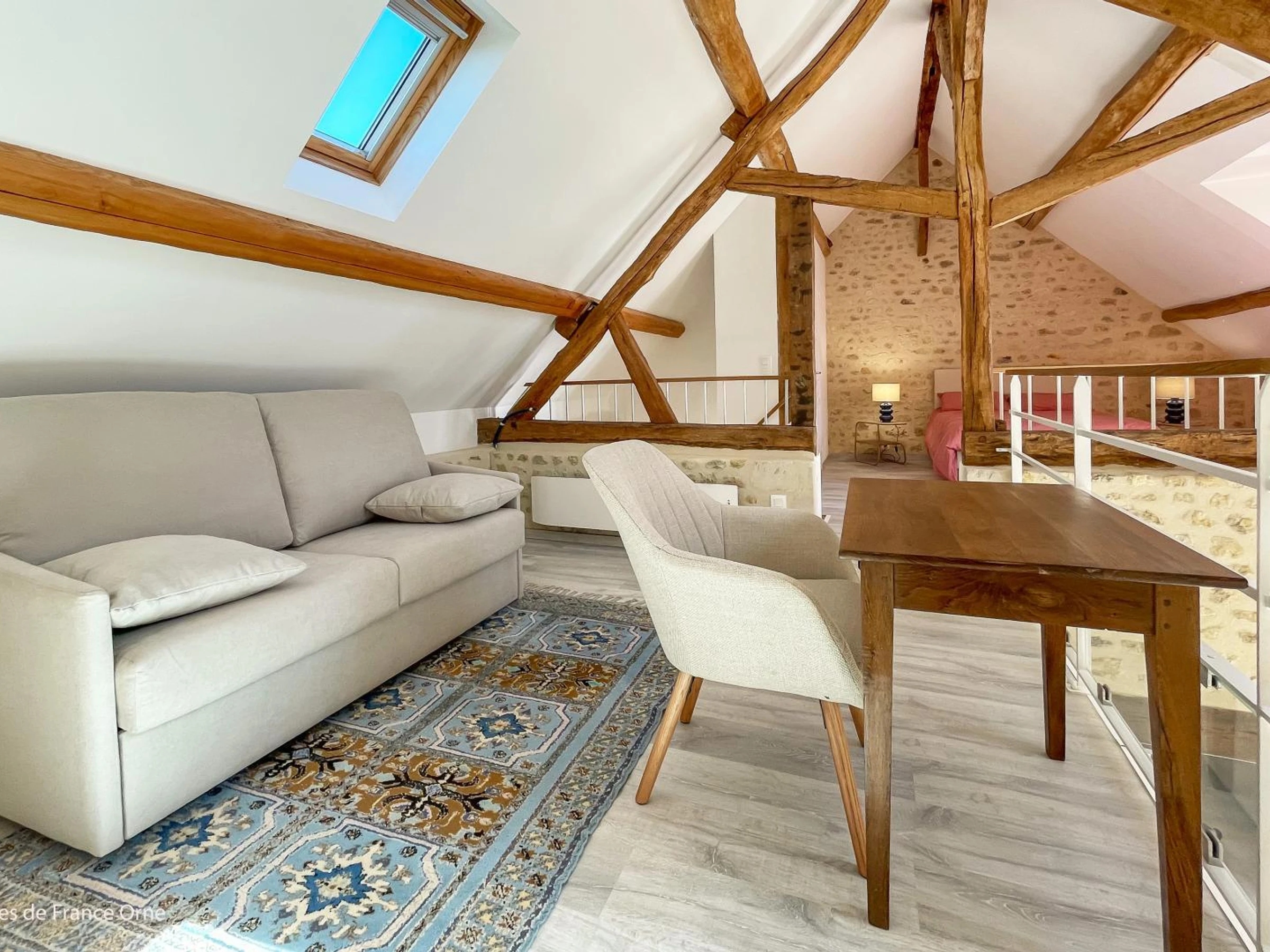 - chambre en mezzanine avec lit double 140x200, espace bureau/détente et canapé lit 2 places en 140x190 cm,