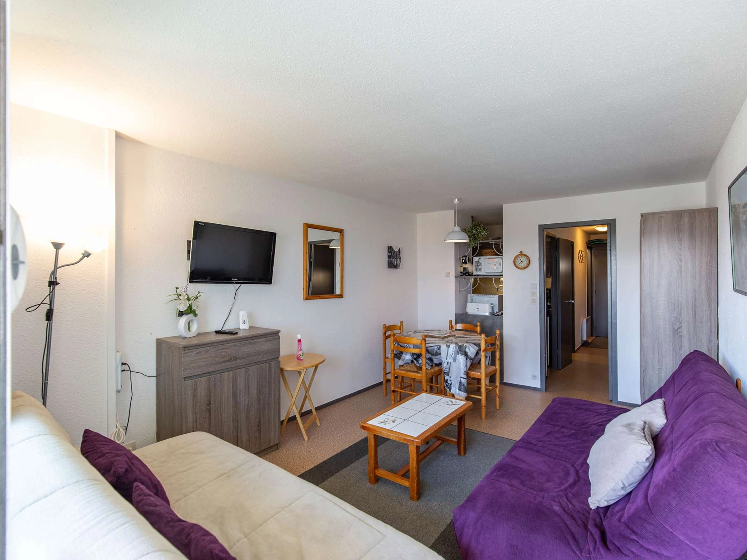 Kitchenette avec plaques électriques, micro-ondes, mini-four, frigo 120 litres, grille-pain, bouilloire et cafetière dolce gusto et filtre et appareil à raclette. Salle de bain et toilettes séparées. Sol PVC. Studio non fumeur. Casier à ski en RDC.