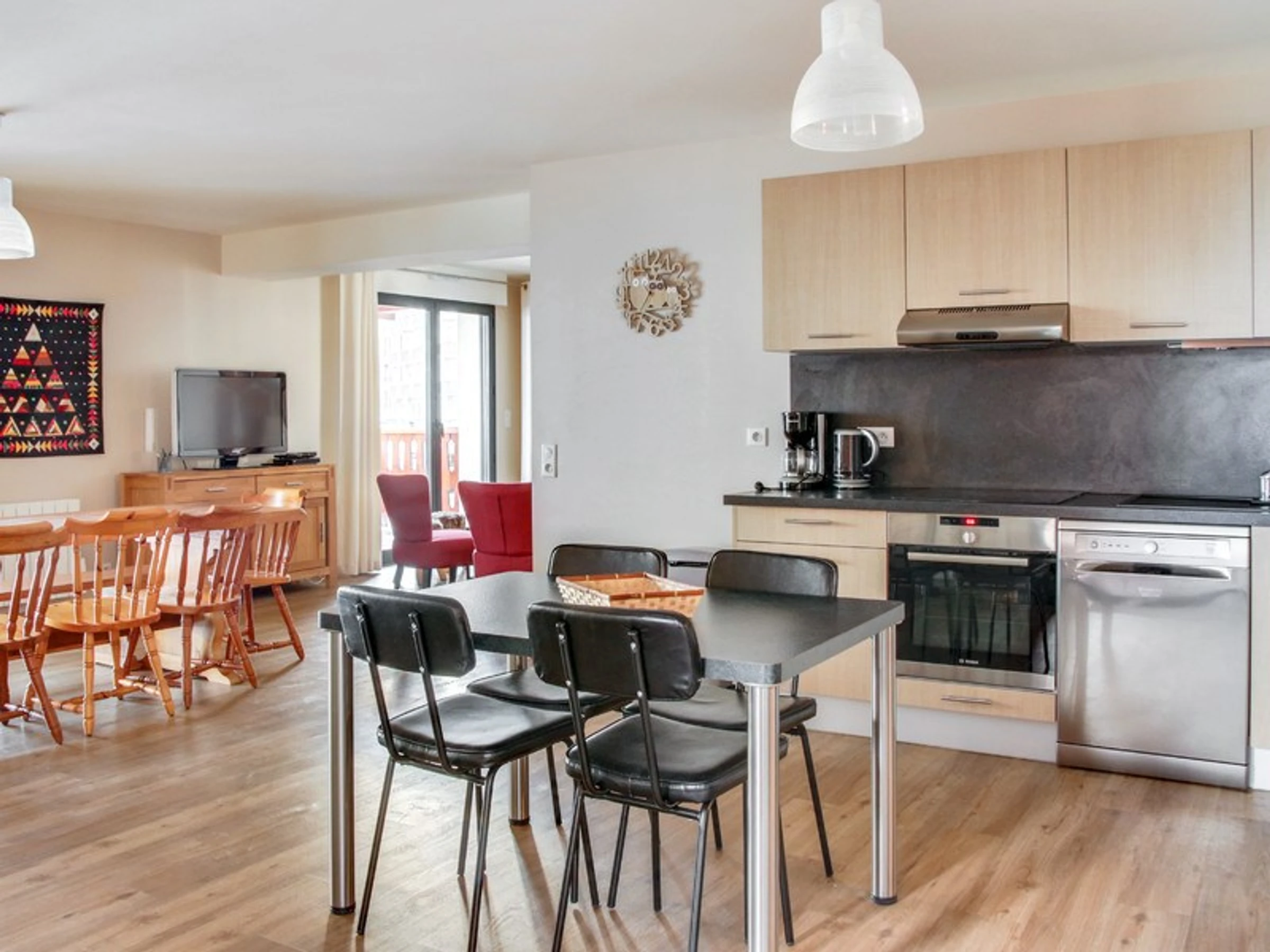Situé au 5ème et dernier étage d’une résidence de standing sécurisée avec ascenseur appartement 12 couchages d'une surface de 140 m². Terrasse et balcon exposition Sud-Ouest avec vue sur le village et les pistes. Séjour / salle à manger de 50 m² avec TV écran plat, coin salon avec 2 canapés. Trois chambres avec un lit en 140, une chambre avec 2 lits en 90, une chambre avec 2 fois deux lits superposés (4x 90). Cuisine équipée ouverte sur coin repas : lave vaisselle, réfrigérateur, congélateur, micro-ondes, four électrique, cafetière magimix et filtre, grille pain, bouilloire et appareil à raclette. Une salle de bain (lave-linge et sèche-linge), deux salles de douche et deux toilettes séparées. Sol en parquet stratifié. Connexion WIFI incluse. Appartement non fumeur. Casier à ski en RDC. Garage pour 2 voitures.