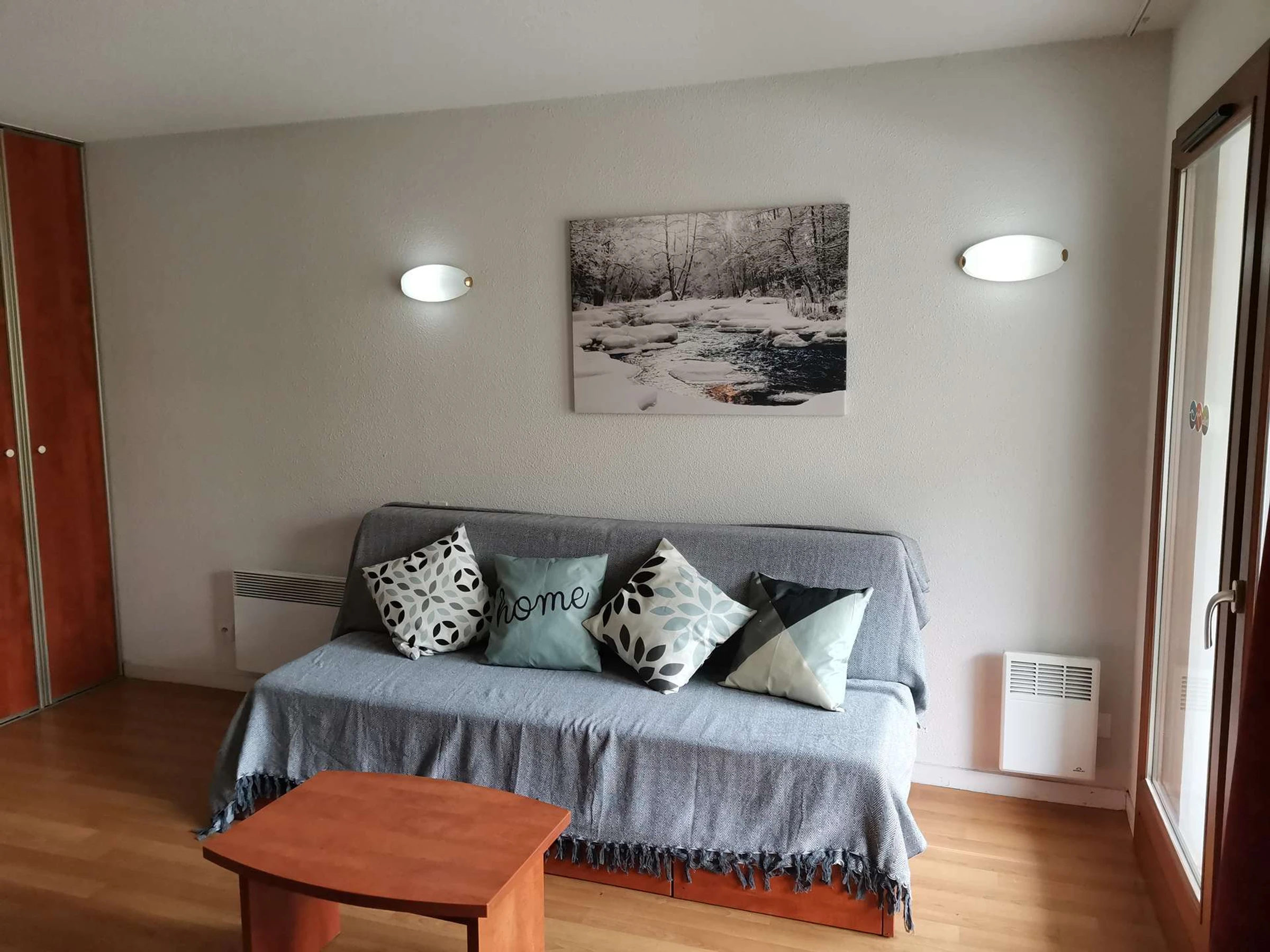 Studio cabine 4 couchages d'une surface de 28 m² avec terrasse, exposition sud. Séjour équipé d'un canapé lit en 160 (2x80), télévision et coin repas. Coin cabine dans l'entrée avec lits superposés (2x 90).